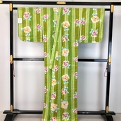 苗色ベースのお色味に縦縞花模様の柄裄がデザインされた素敵なお品でございます。