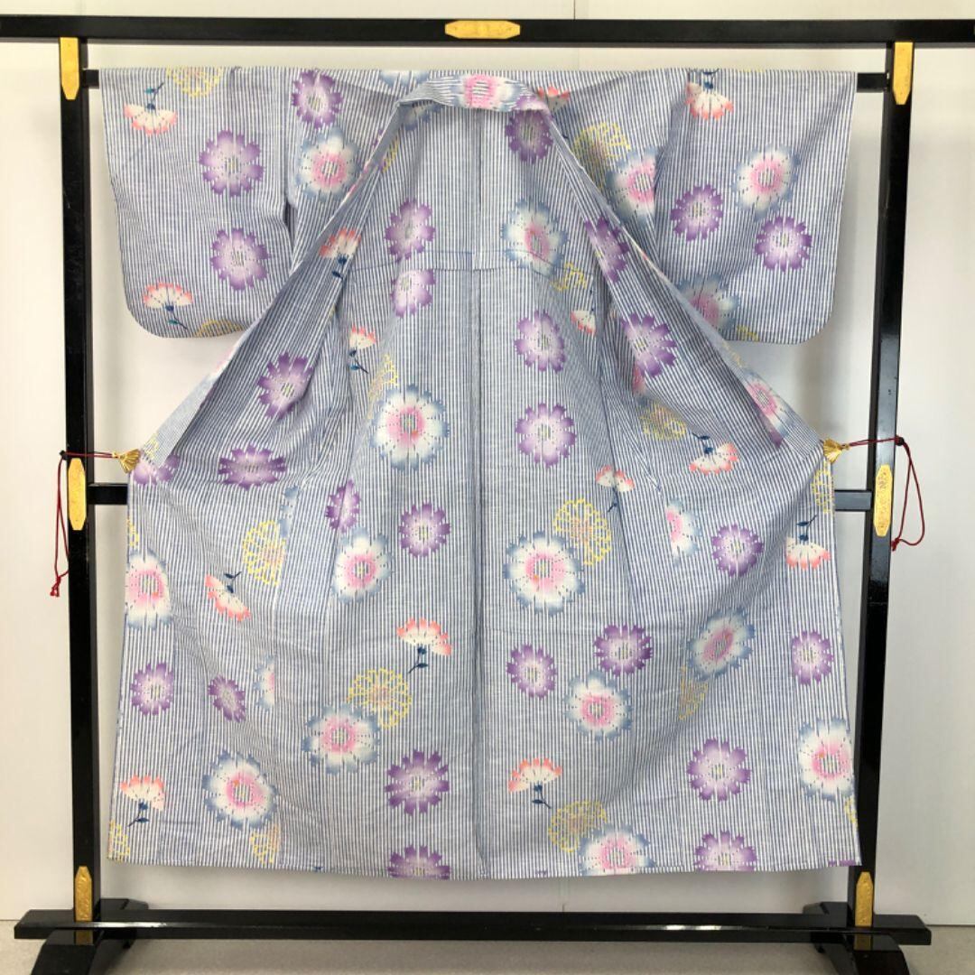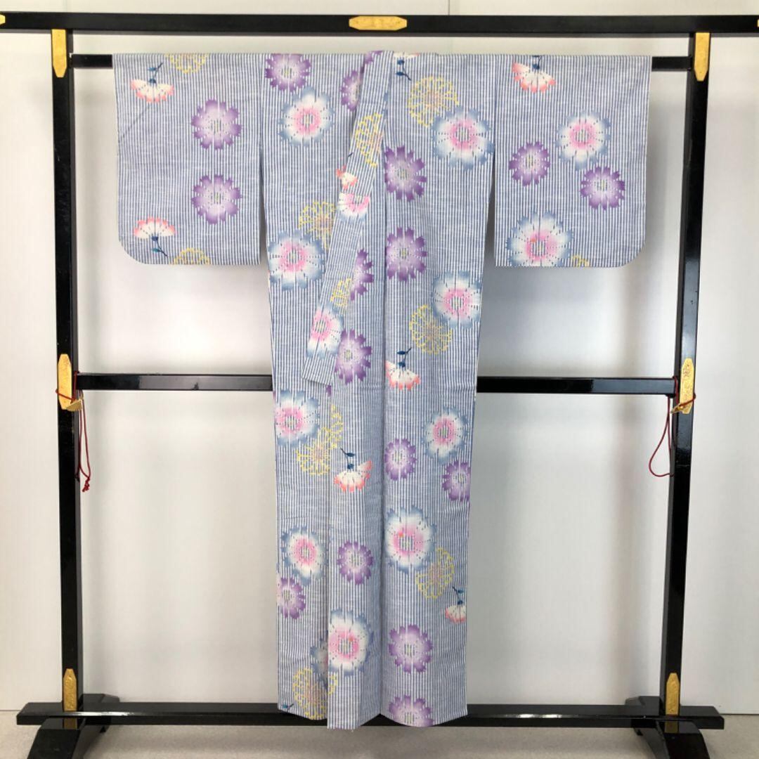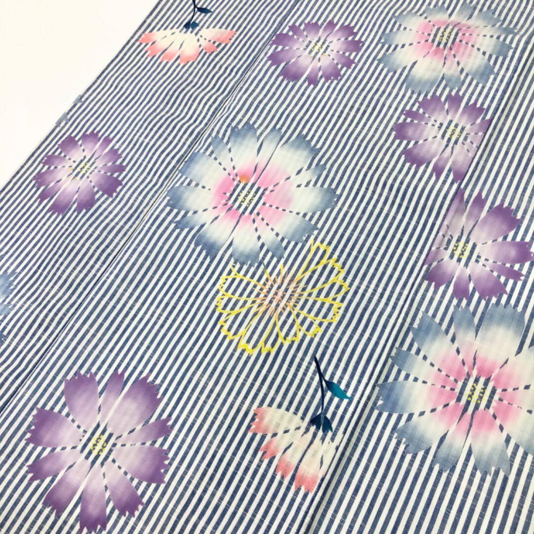 勿忘草色の上品なお色味に縦縞に花柄模様の柄裄がデザインされた素敵なお品でございます。