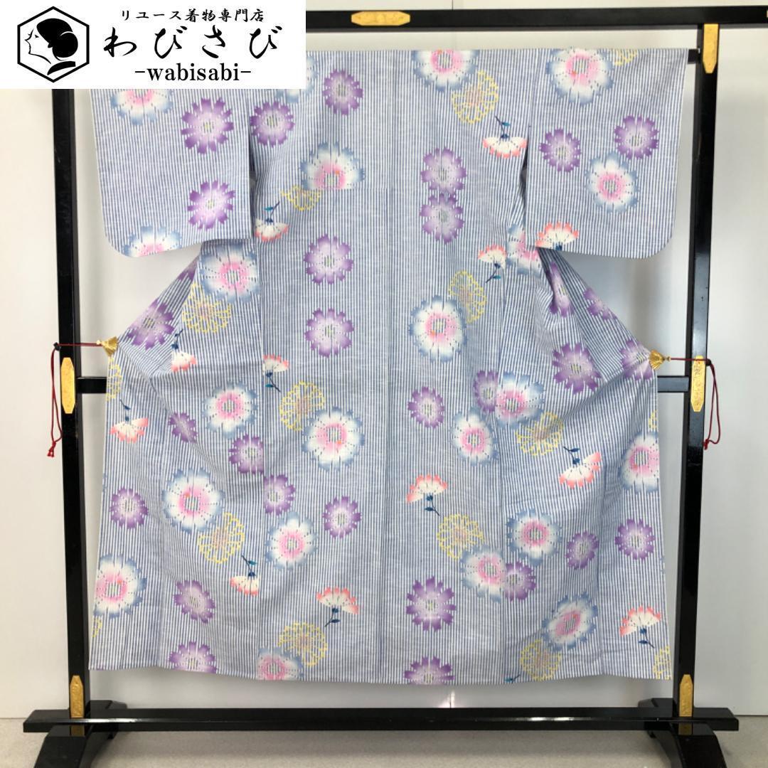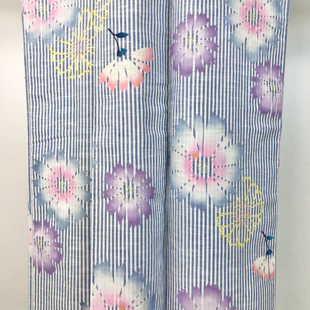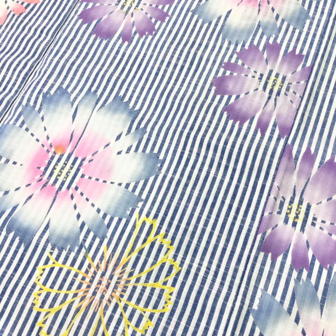 勿忘草色の上品なお色味に縦縞に花柄模様の柄裄がデザインされた素敵なお品でございます。