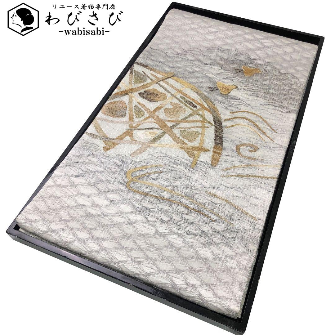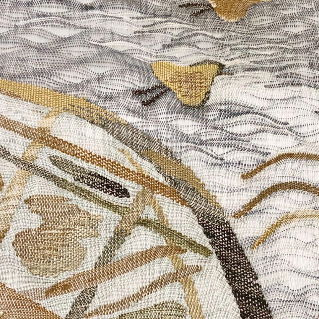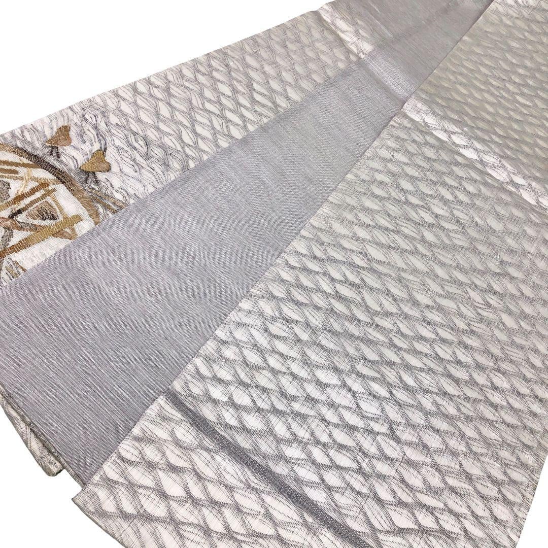 乳白色ベースのお色味に雰囲気の良い透け感のある夏すくい織、千鳥に波模様の柄裄がデザインされた素敵なお品でございます。