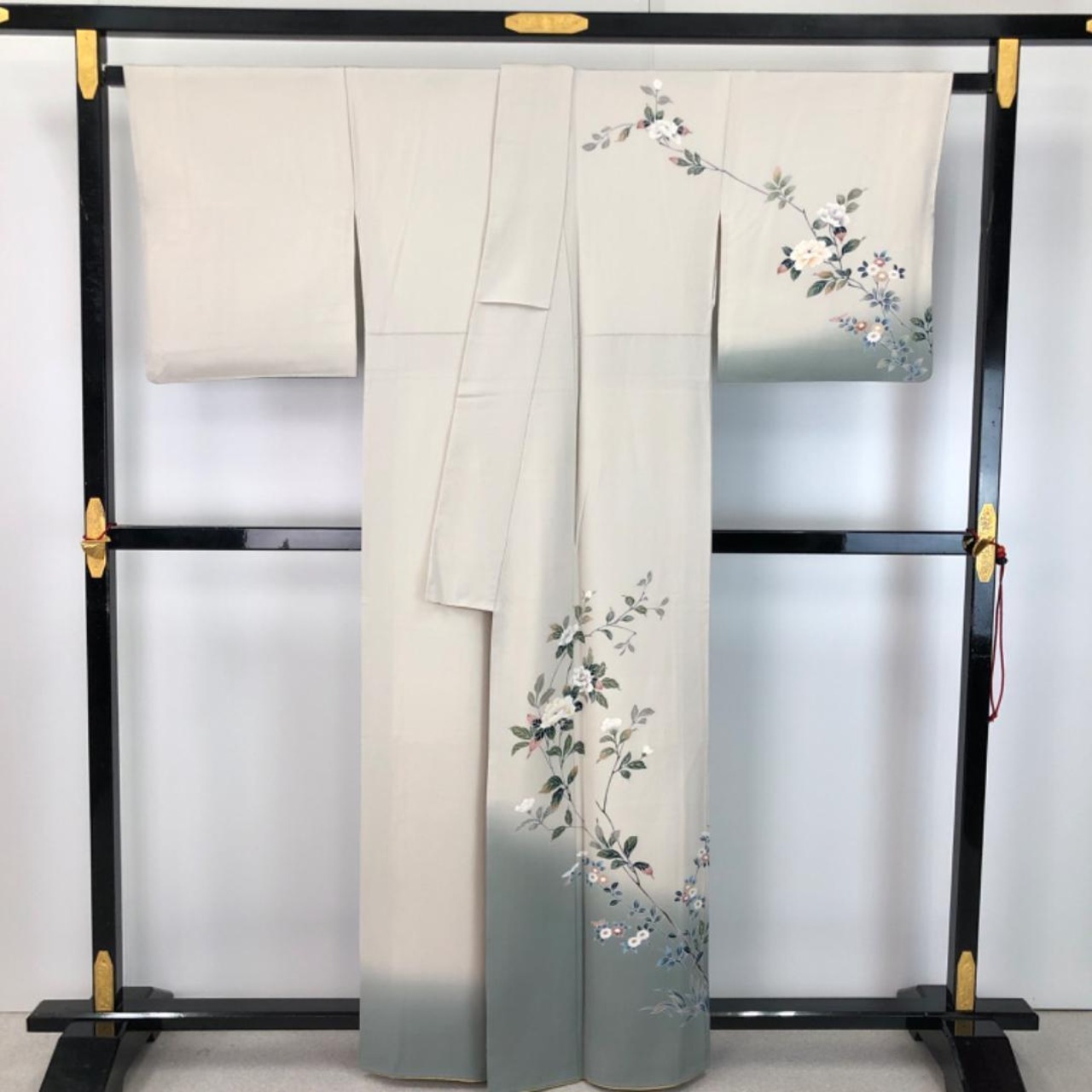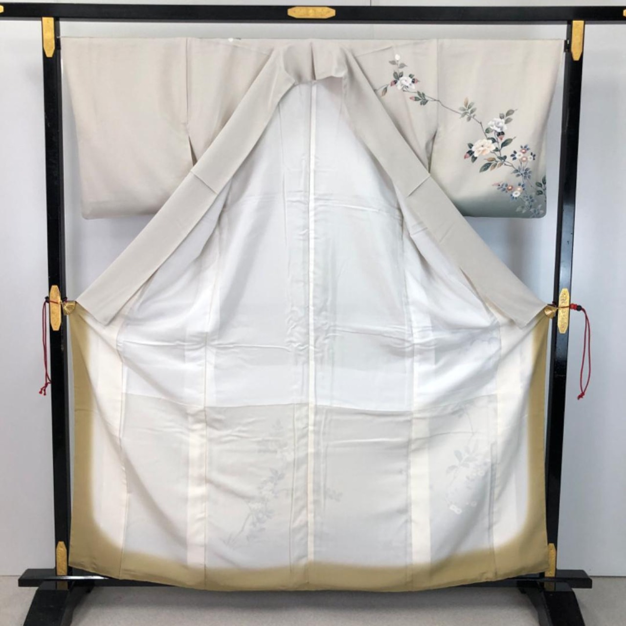 訪問着 美しい花模様 暈し 砂色 縮緬 K-4850 着物 きもの kimono 和服 和装 中古 リサイクル着物 【送料無料】