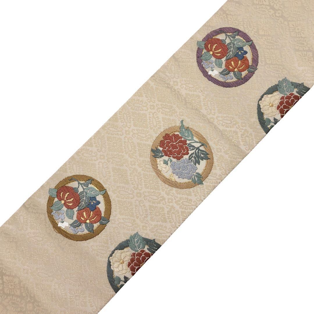 名古屋帯 唐織 丸に花模様 生成色 地模様 O-5142 着物 きもの kimono 和服 和装 中古 リサイクル着物 【送料無料】