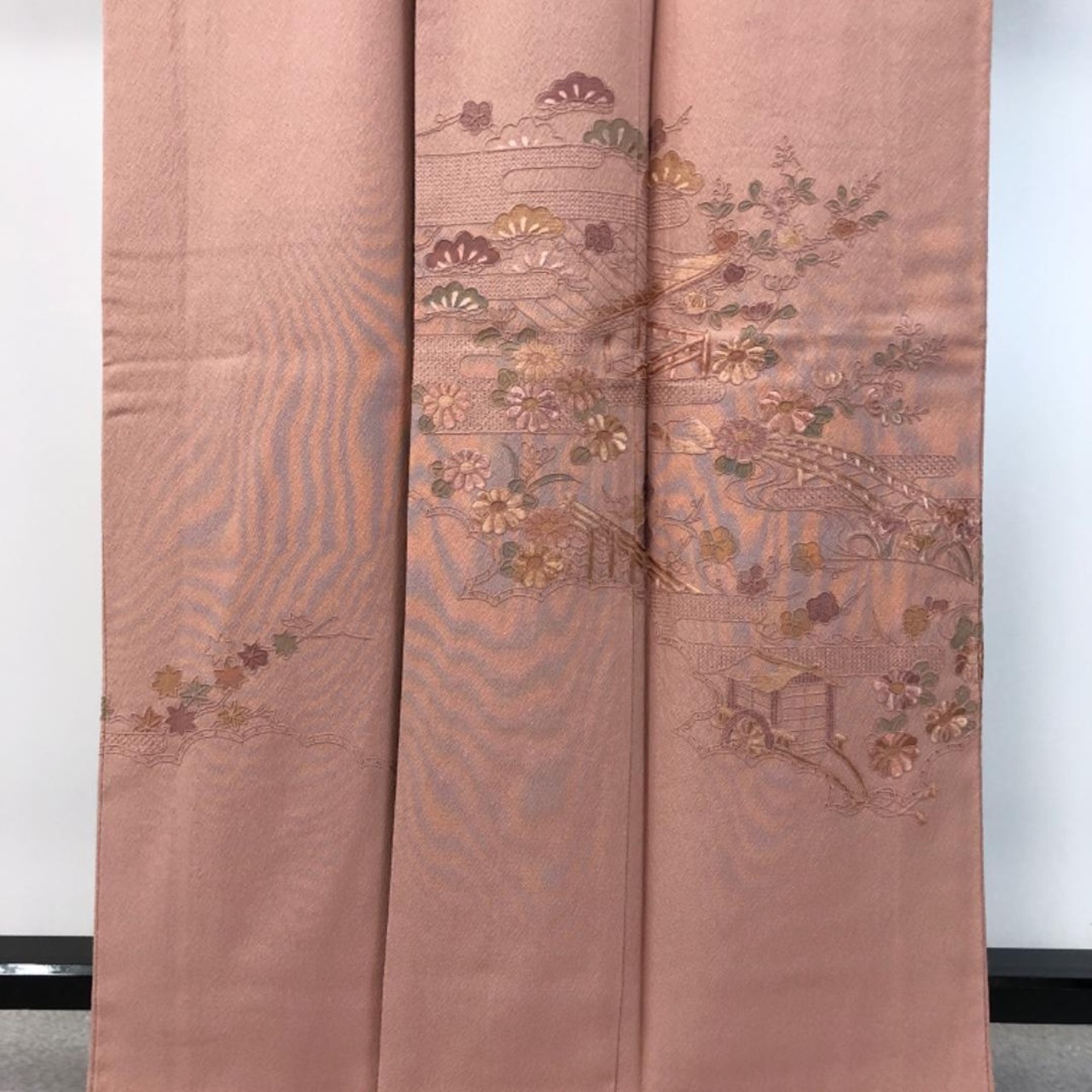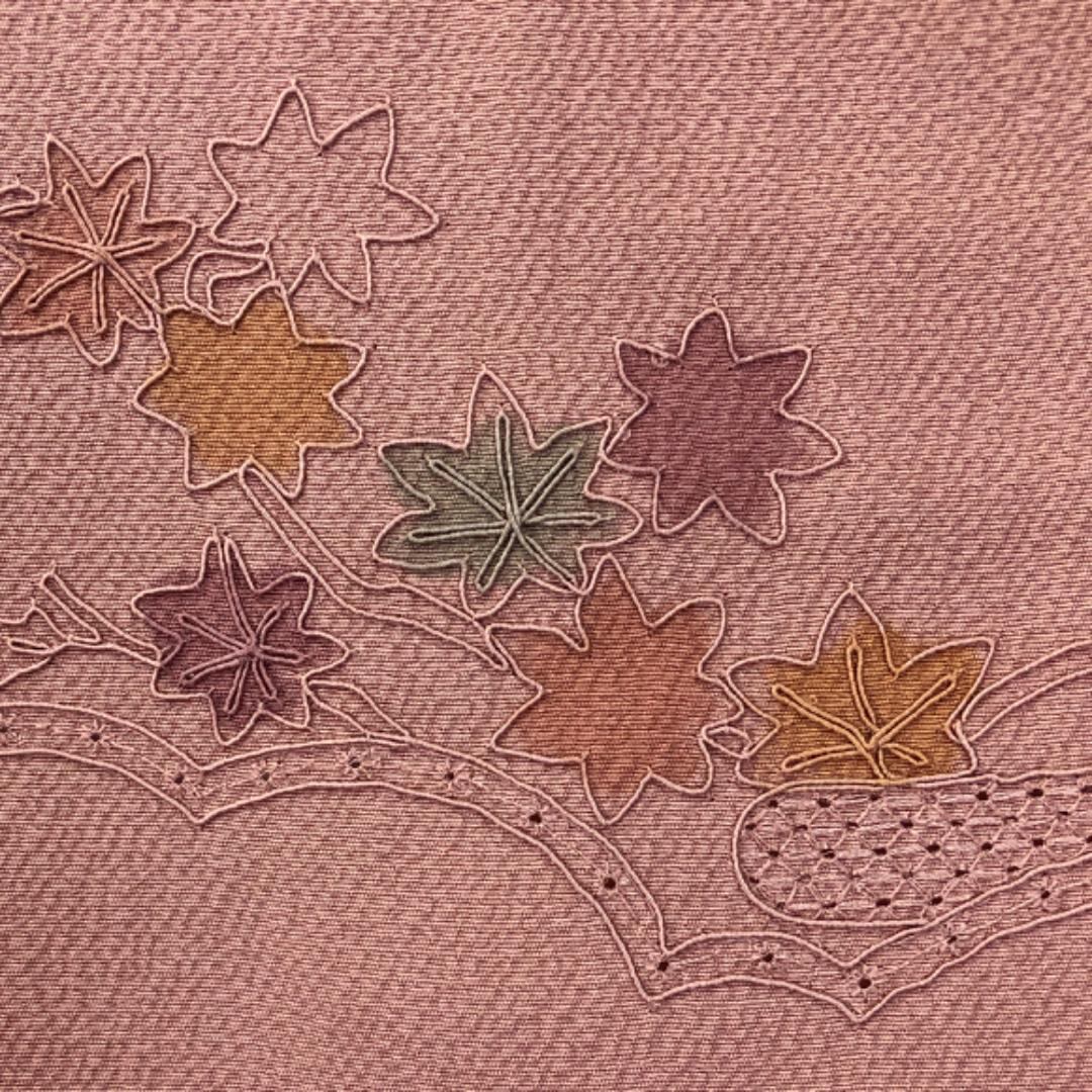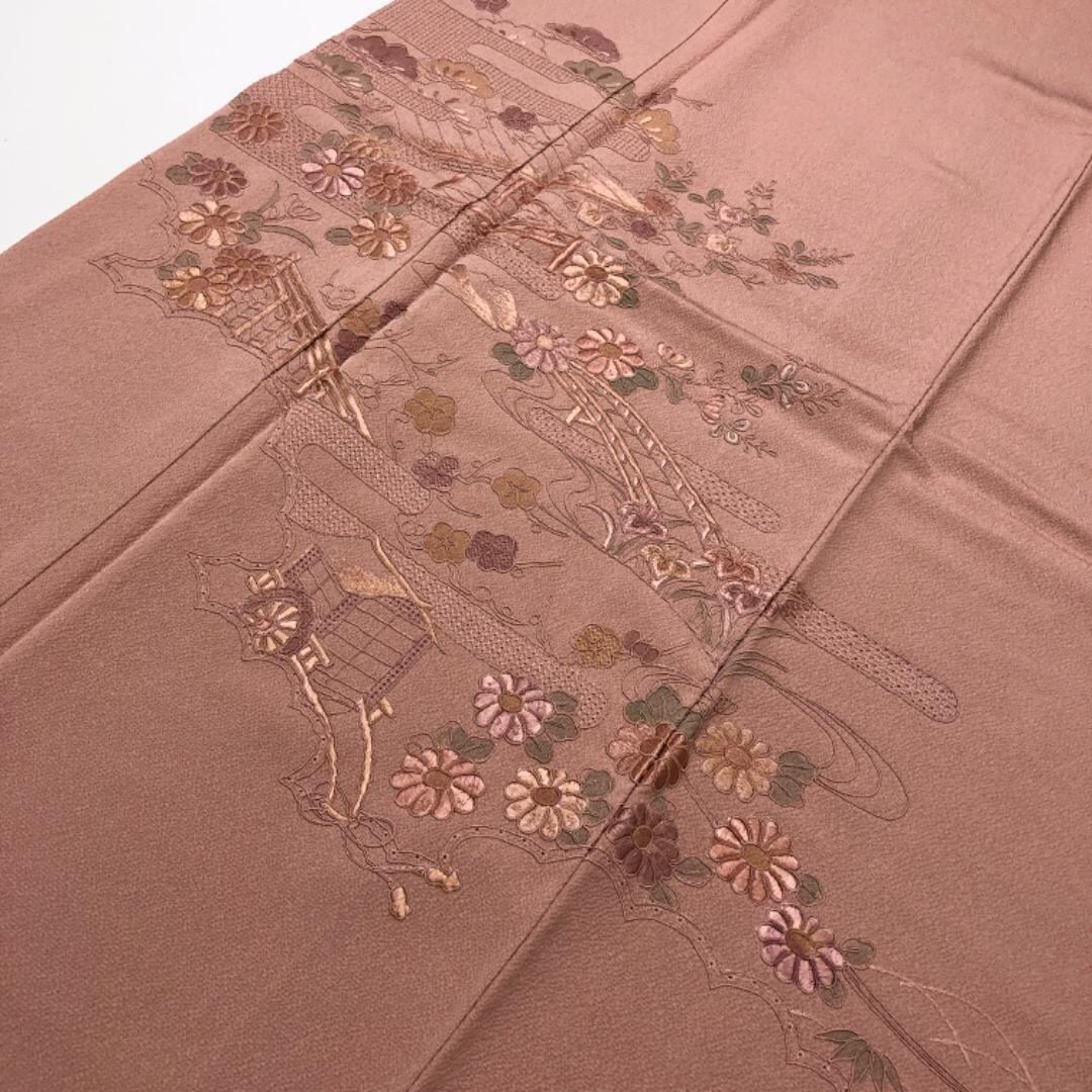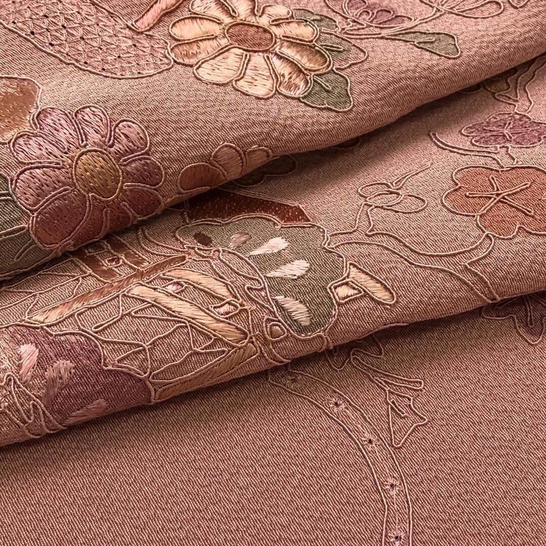 水柿色の落ち着きのあるお色味に刺繍柄の霞に四季の花模様がデザインされた素敵なお品でございます。