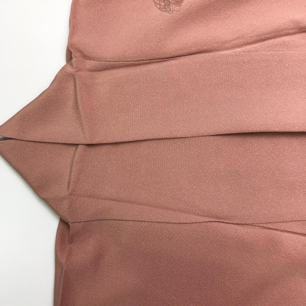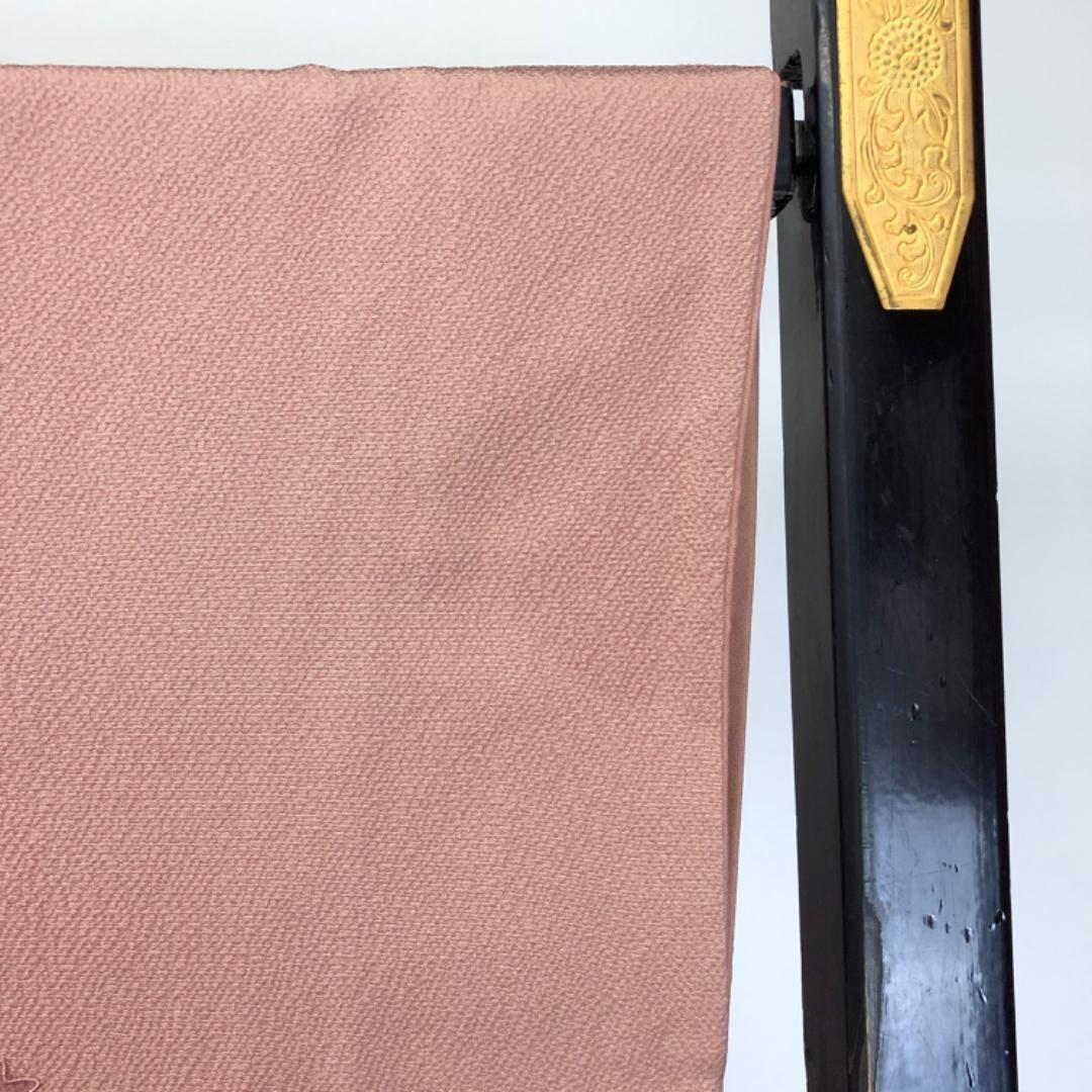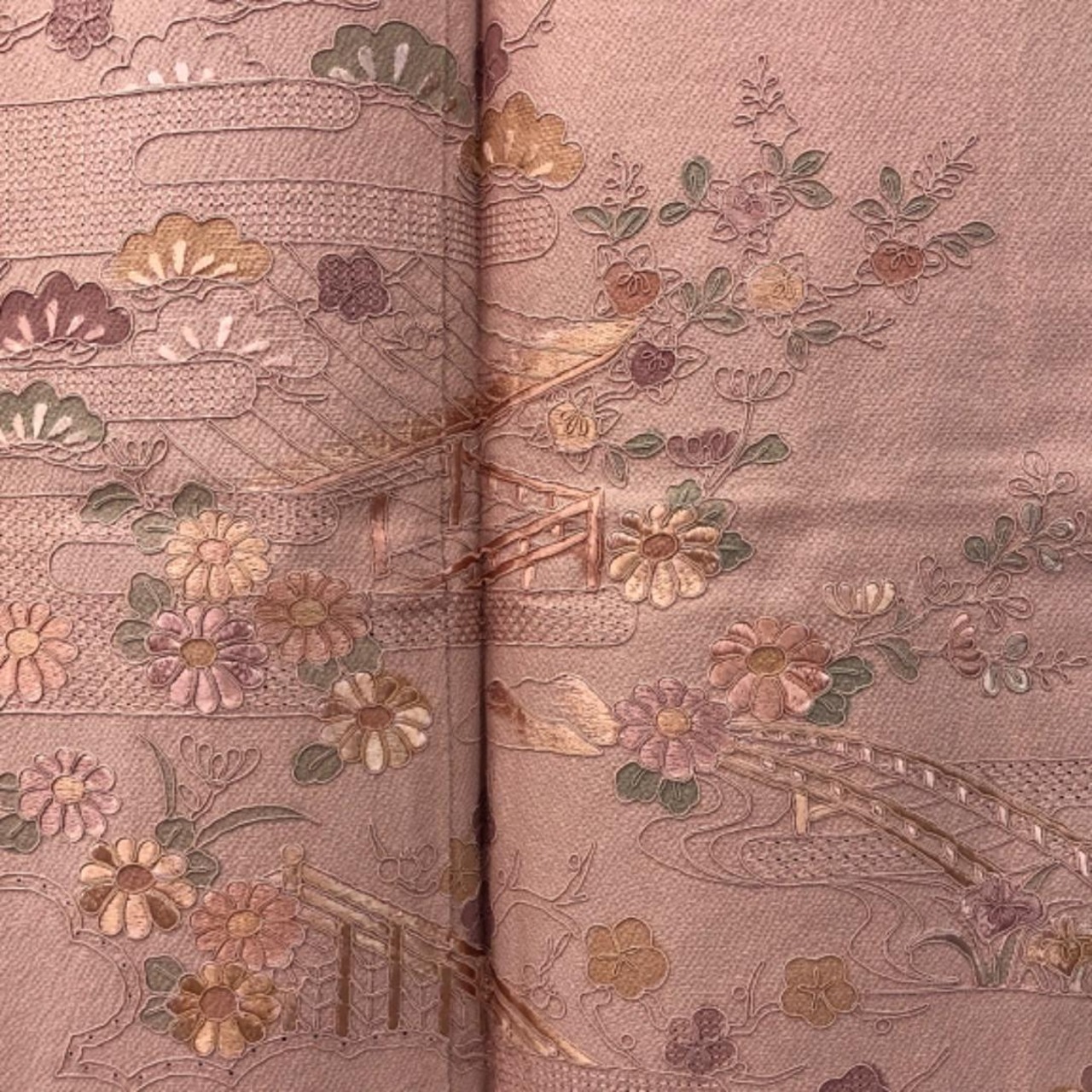 水柿色の落ち着きのあるお色味に刺繍柄の霞に四季の花模様がデザインされた素敵なお品でございます。