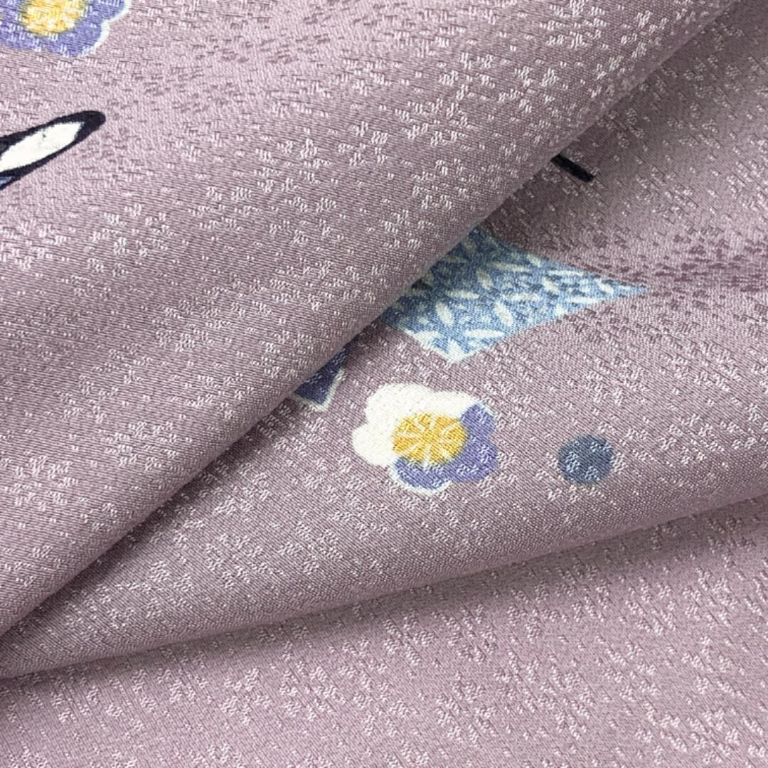 薄古代紫色のお色味に日本人形の柄裄がデザインされた素敵なお品でございます。
