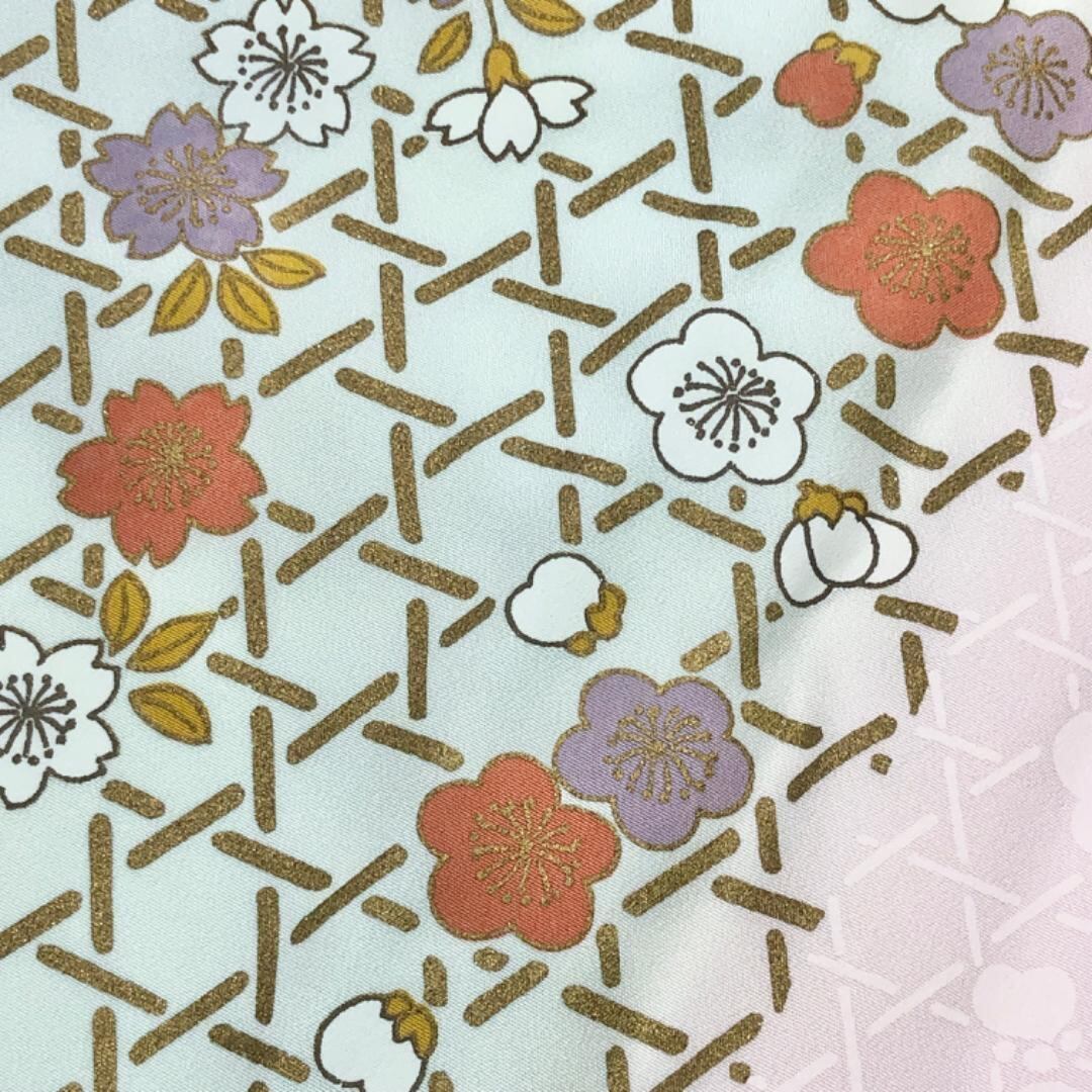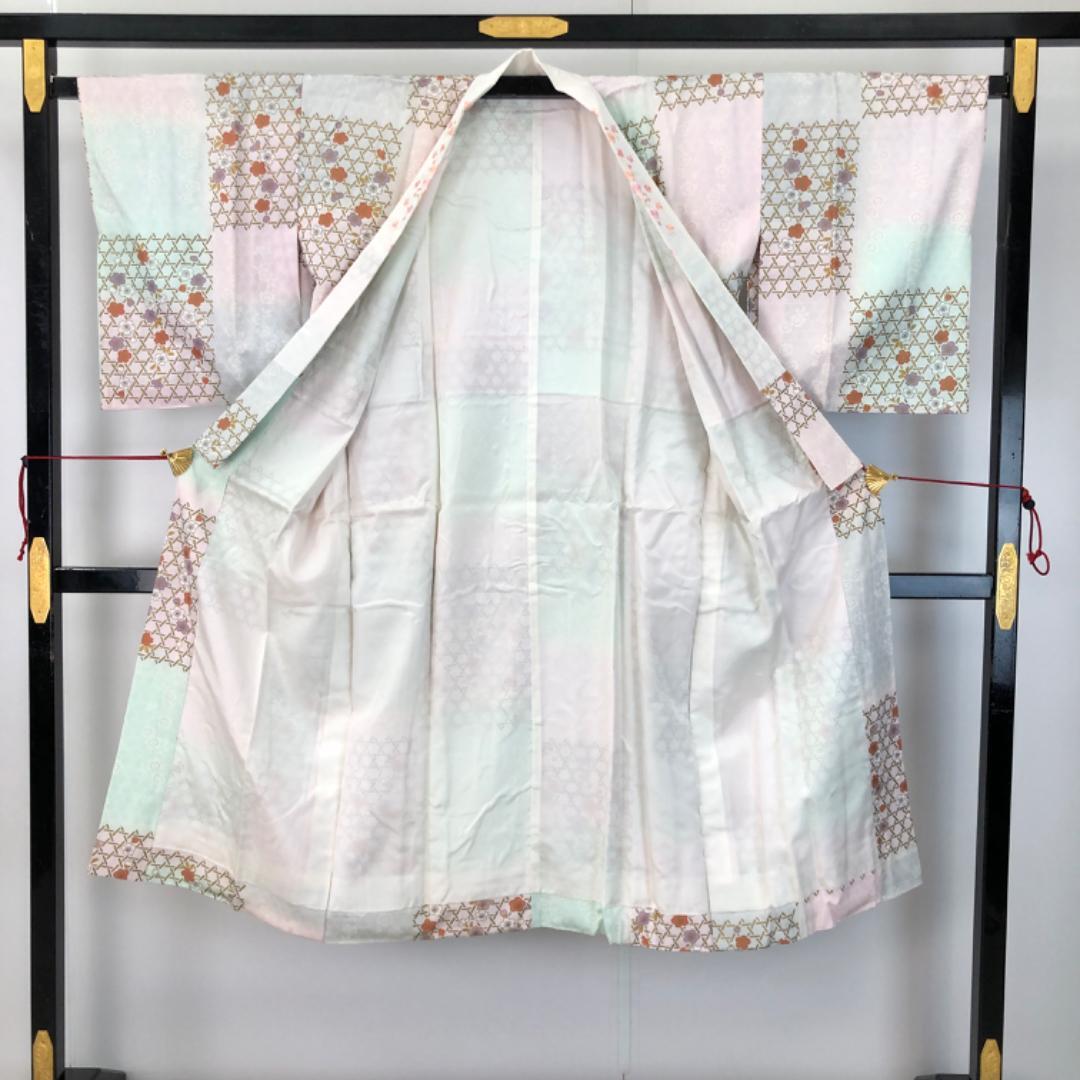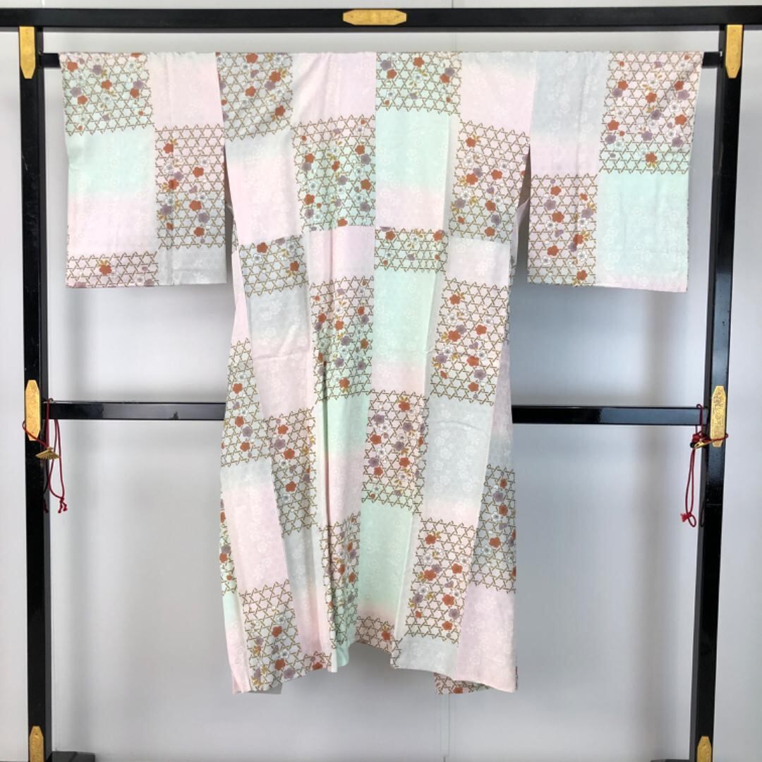 桜色ベースの暈しのお色味に格子柄、竹垣に梅に桜の柄裄がデザインされた素敵なお品でございます。