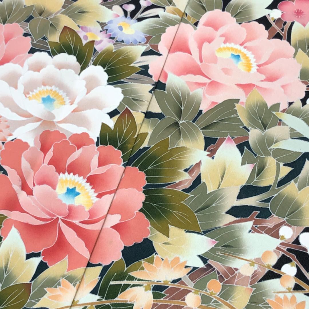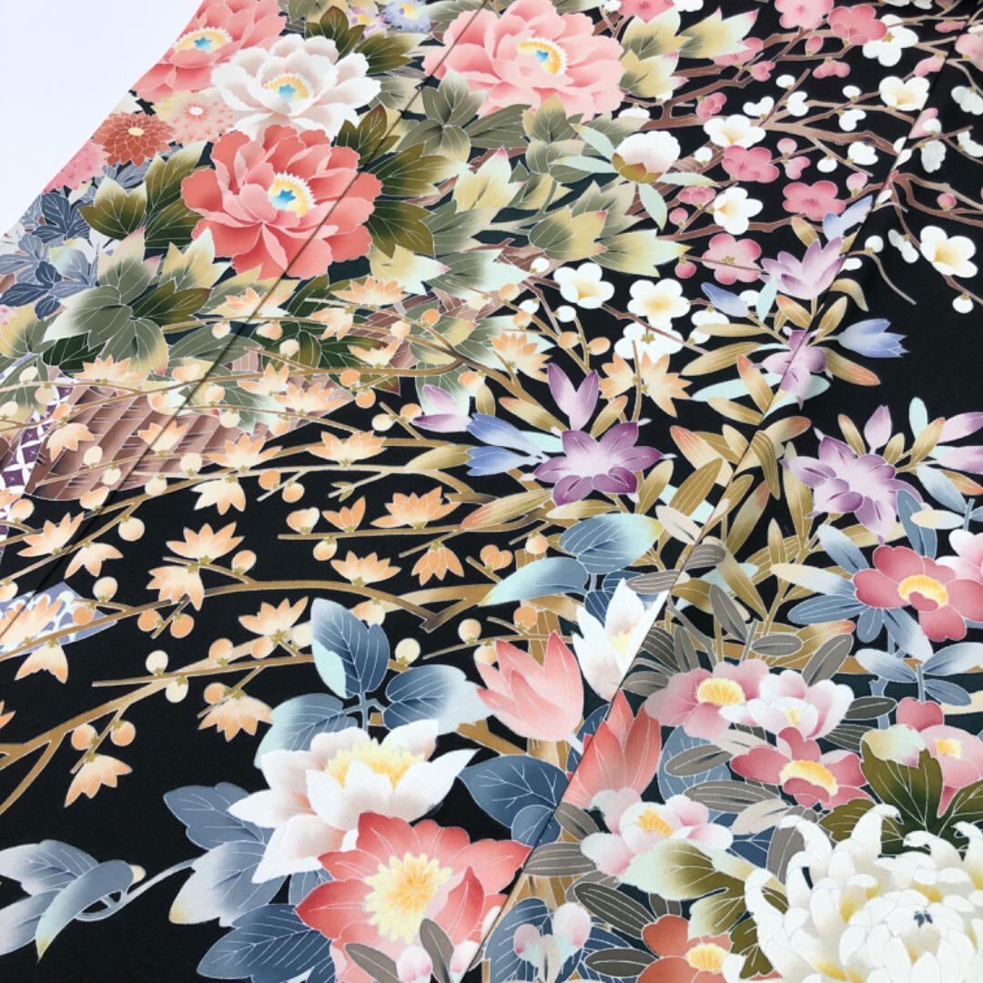 椿に乱菊、牡丹などの様々な美しい花模様の柄裄がデザインされた友禅の素敵なお品でございます。