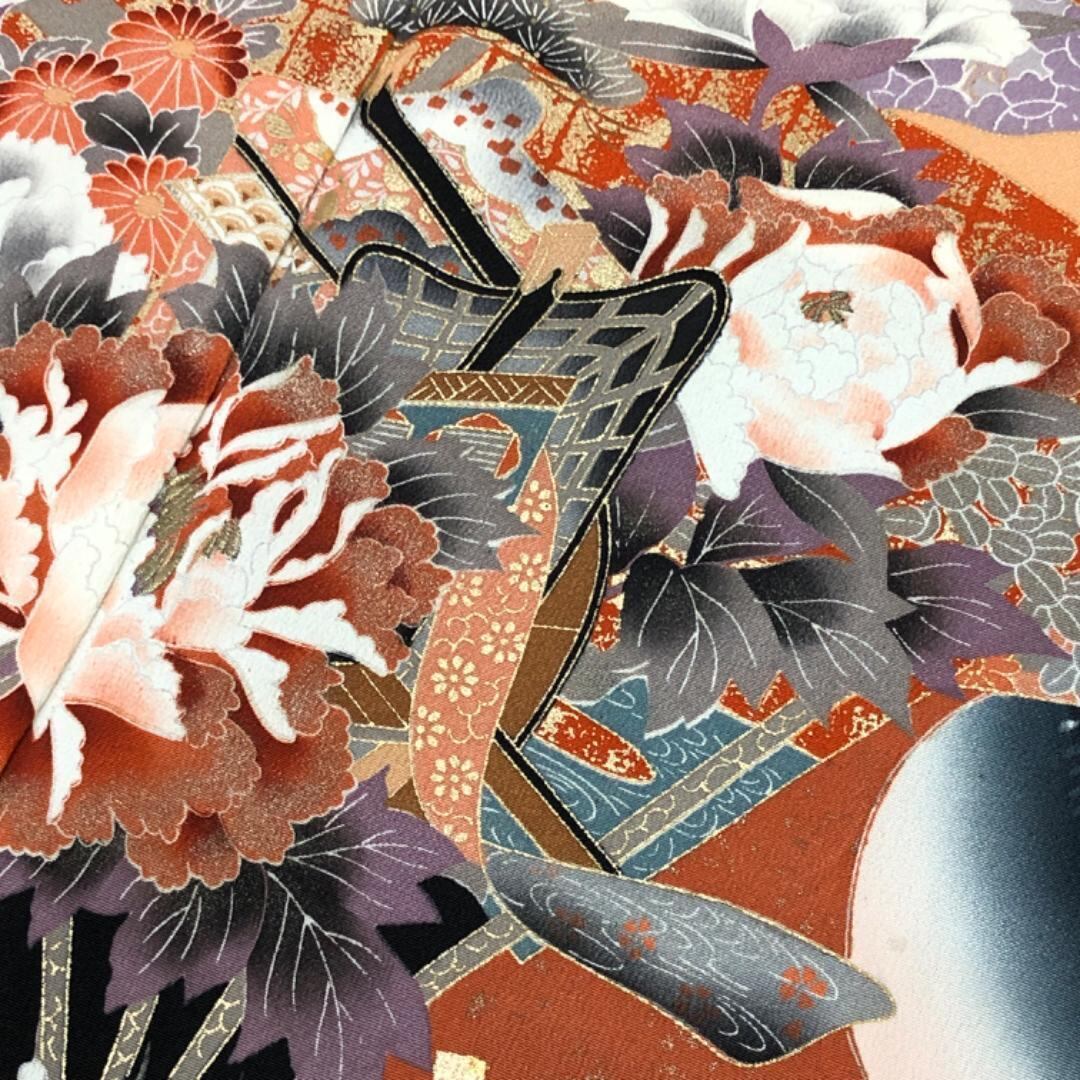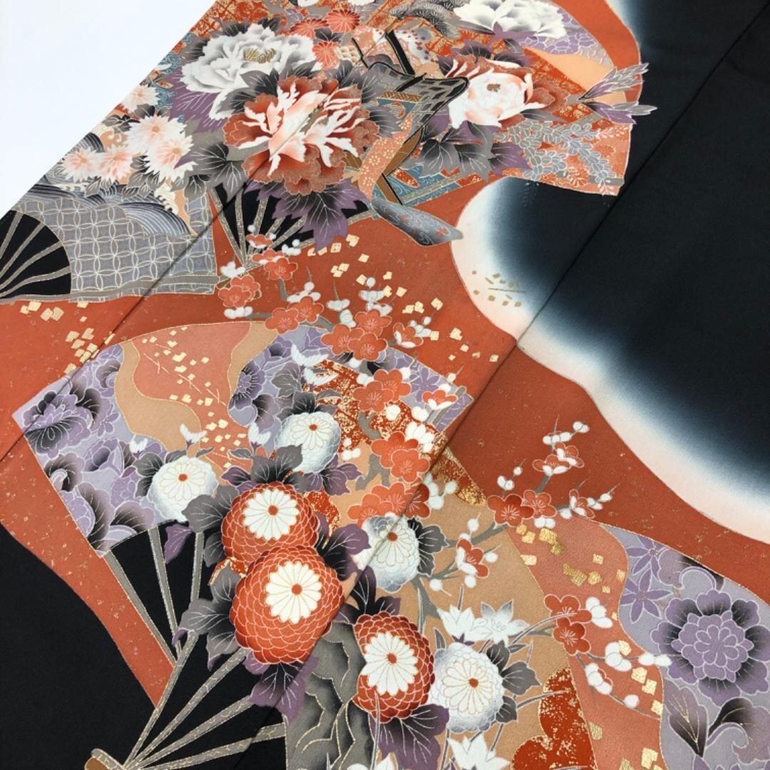 銀朱色のお色味に扇子に花模様、七宝、花亀甲などの金債が使われた色鮮やかな色彩の柄裄がデザインされた素敵なお品でございます。