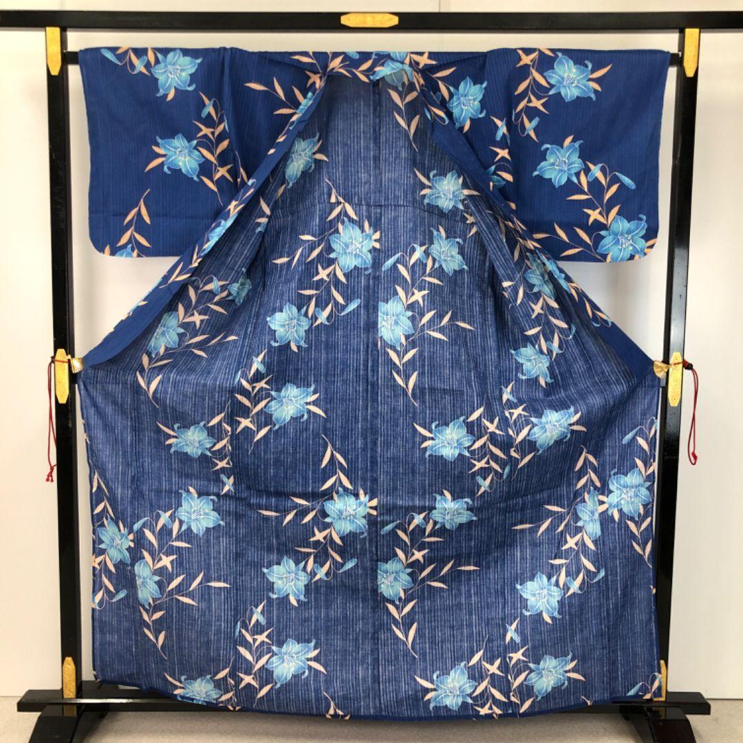 紺碧色のお色味に美しい花模様の柄裄がデザインされた素敵なお品でございます。