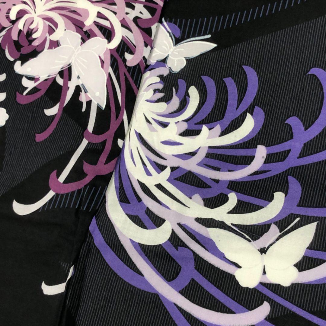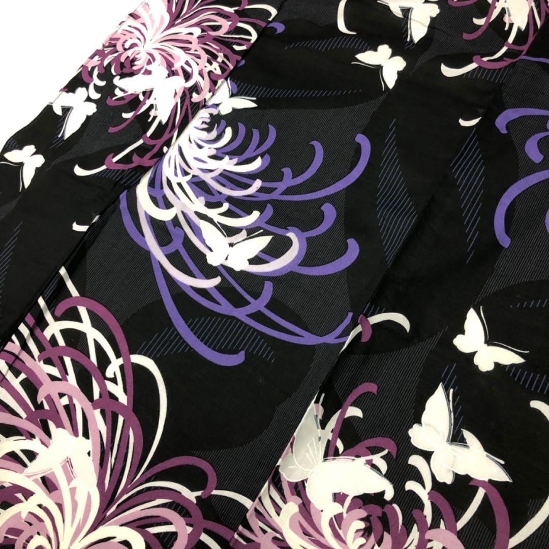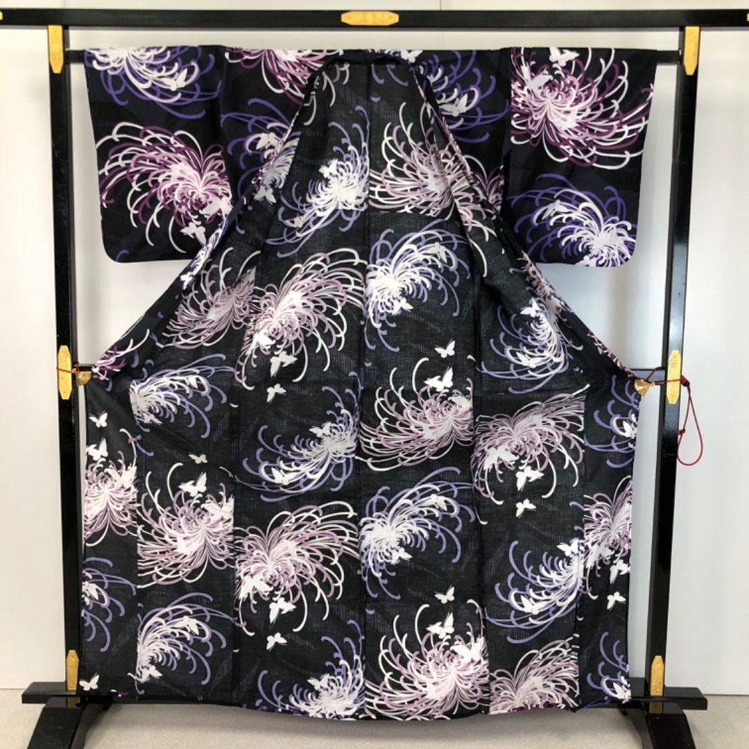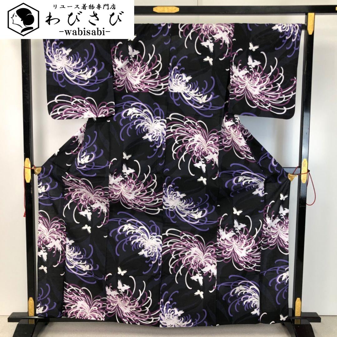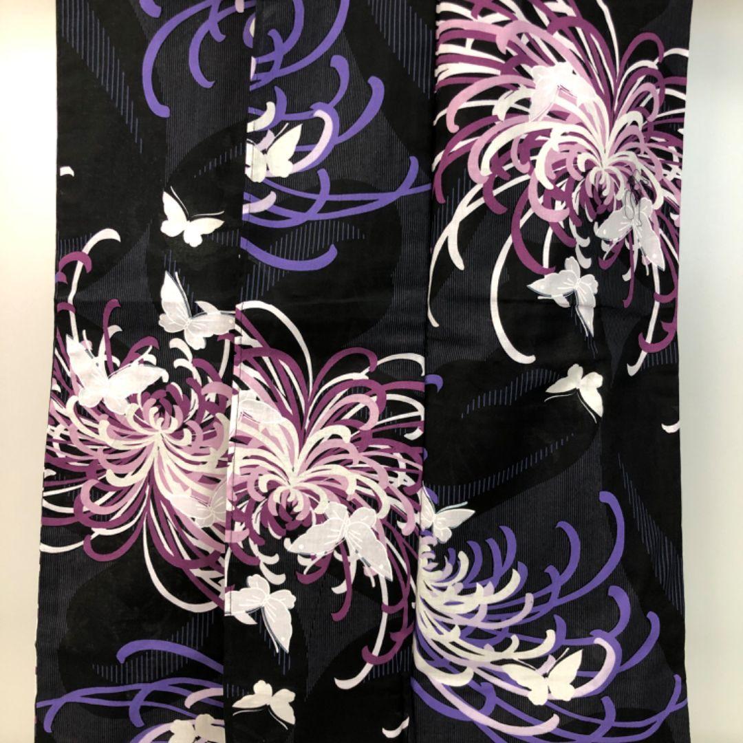 黒色のお色味に乱菊に蝶々の美しい柄裄がデザインされた素敵なお品でございます。