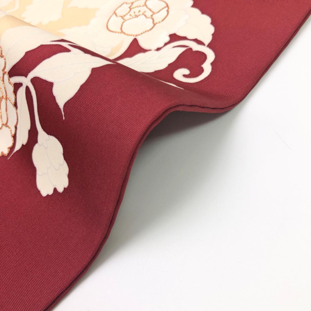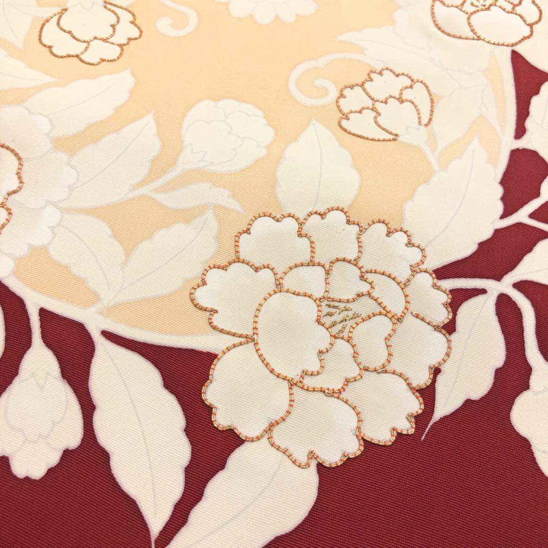 真紅色のお色味の塩瀬に金駒刺繍が使われた花柄模様がデザインされた素敵なお品でございます。