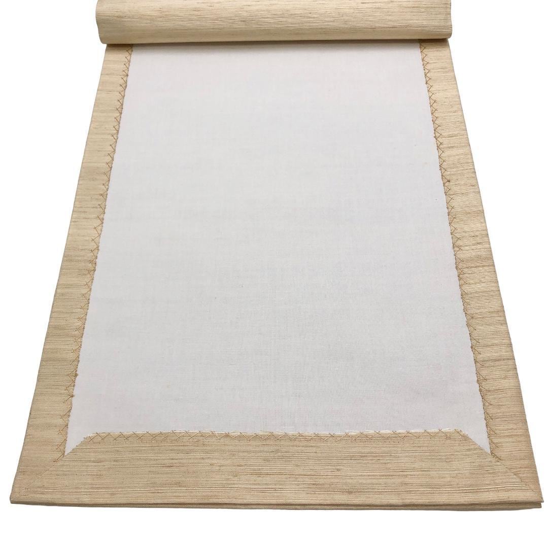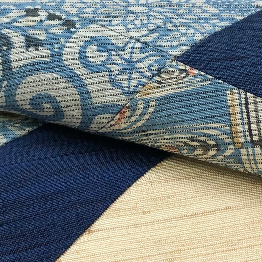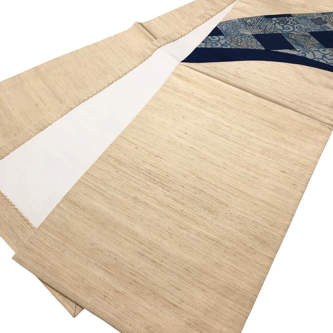 生成色のお色味の紬地に花模様の型染の切嵌がデザインされた雰囲気の良い素敵なお品でございます。