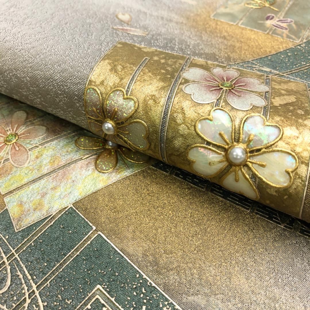 灰色ベースのお色味に源氏香に煌びやかな花模様、螺鈿、本真珠が使われた美しい柄裄がデザインされた素敵なお品でございます。