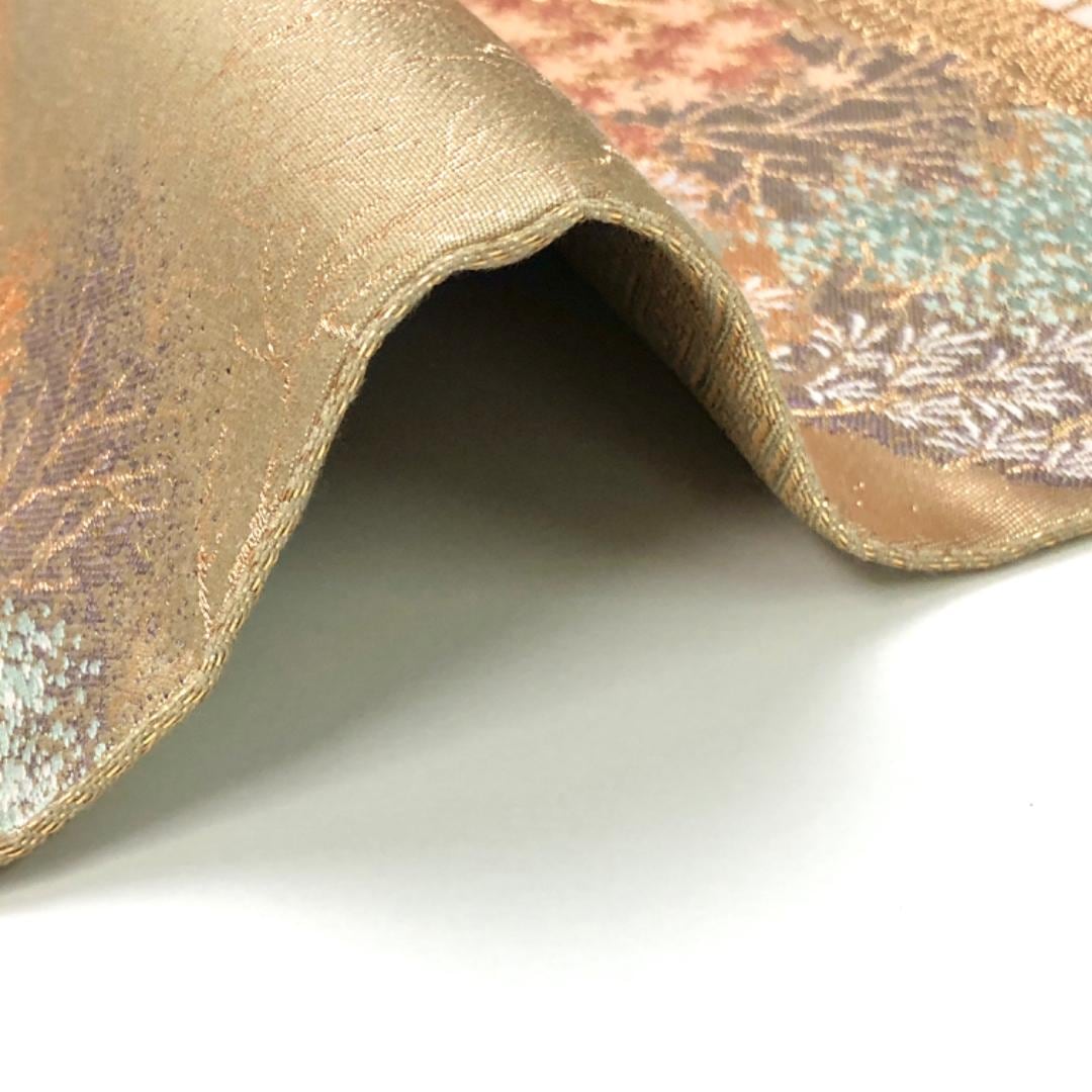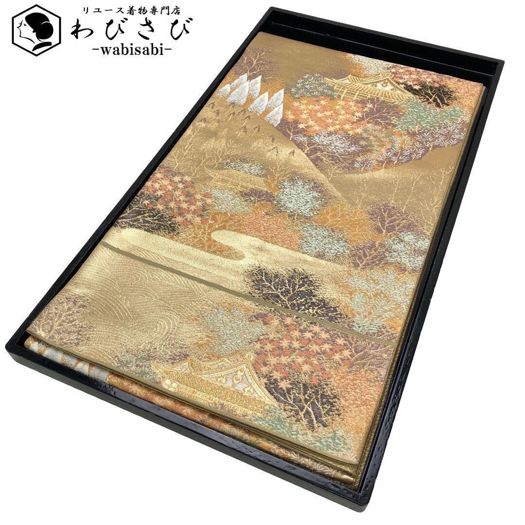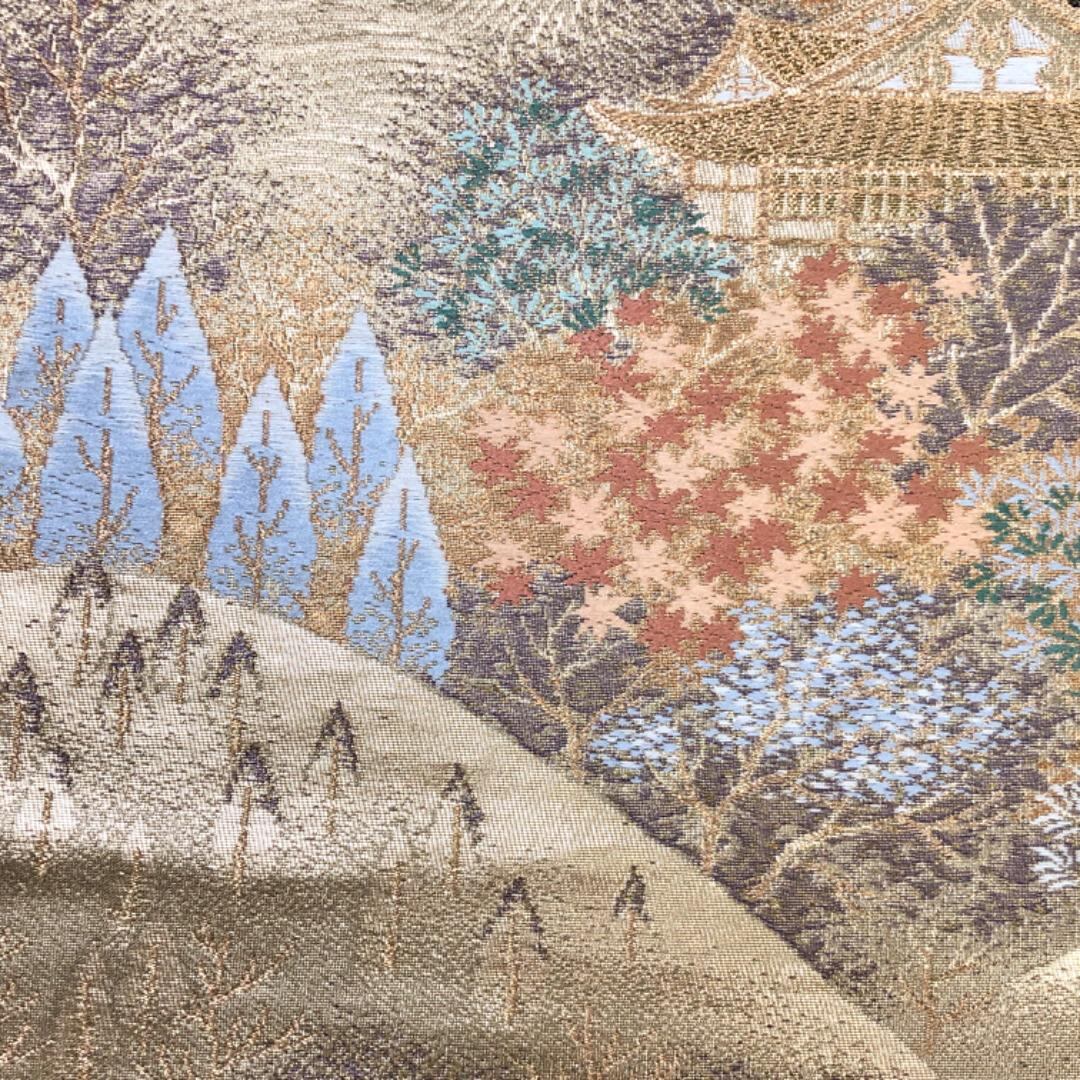 金色ベースの煌びやかなお色味、美しい風景模様、寺院がデザインされた素敵な柄裄のお品でございます。
