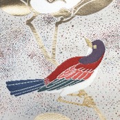 生成色ベースの上品なお色味に椿の花模様に鳥がデザインされた素敵な柄裄のお品でございます。