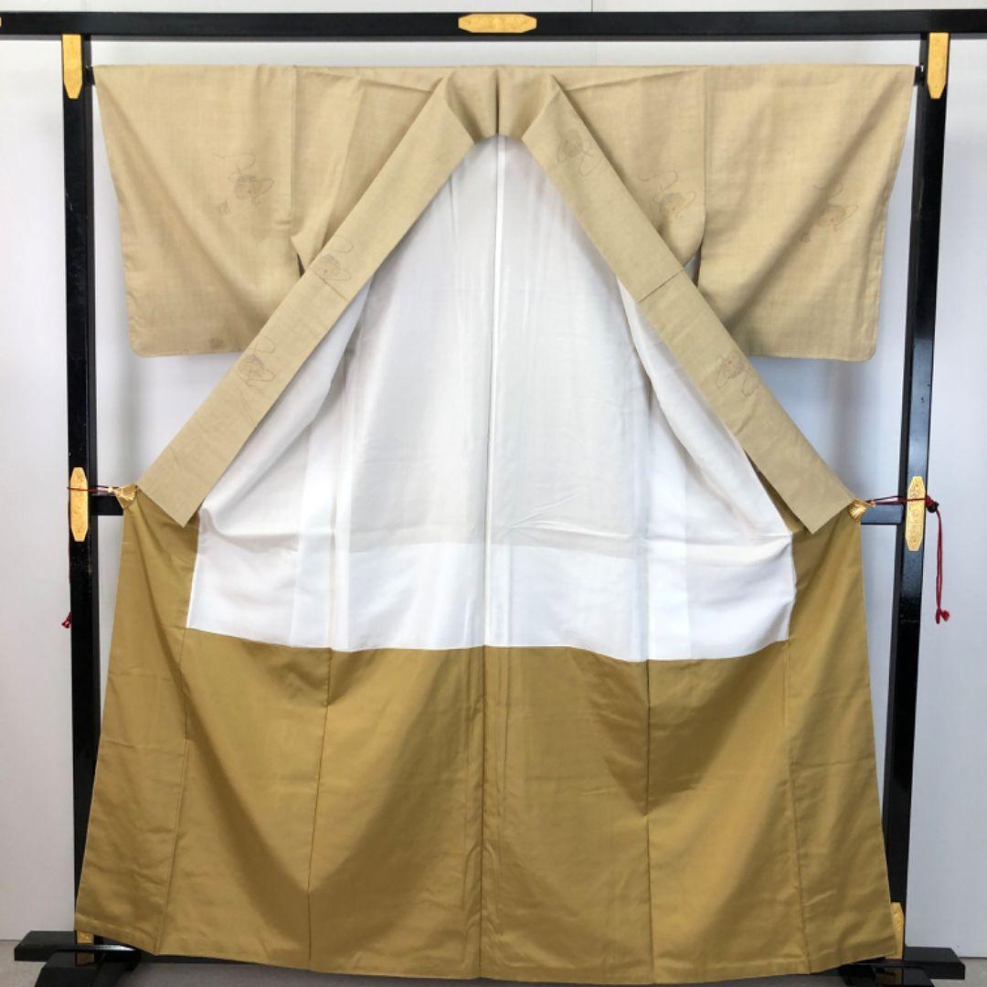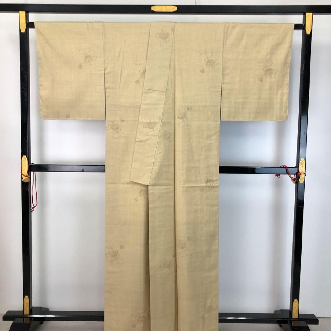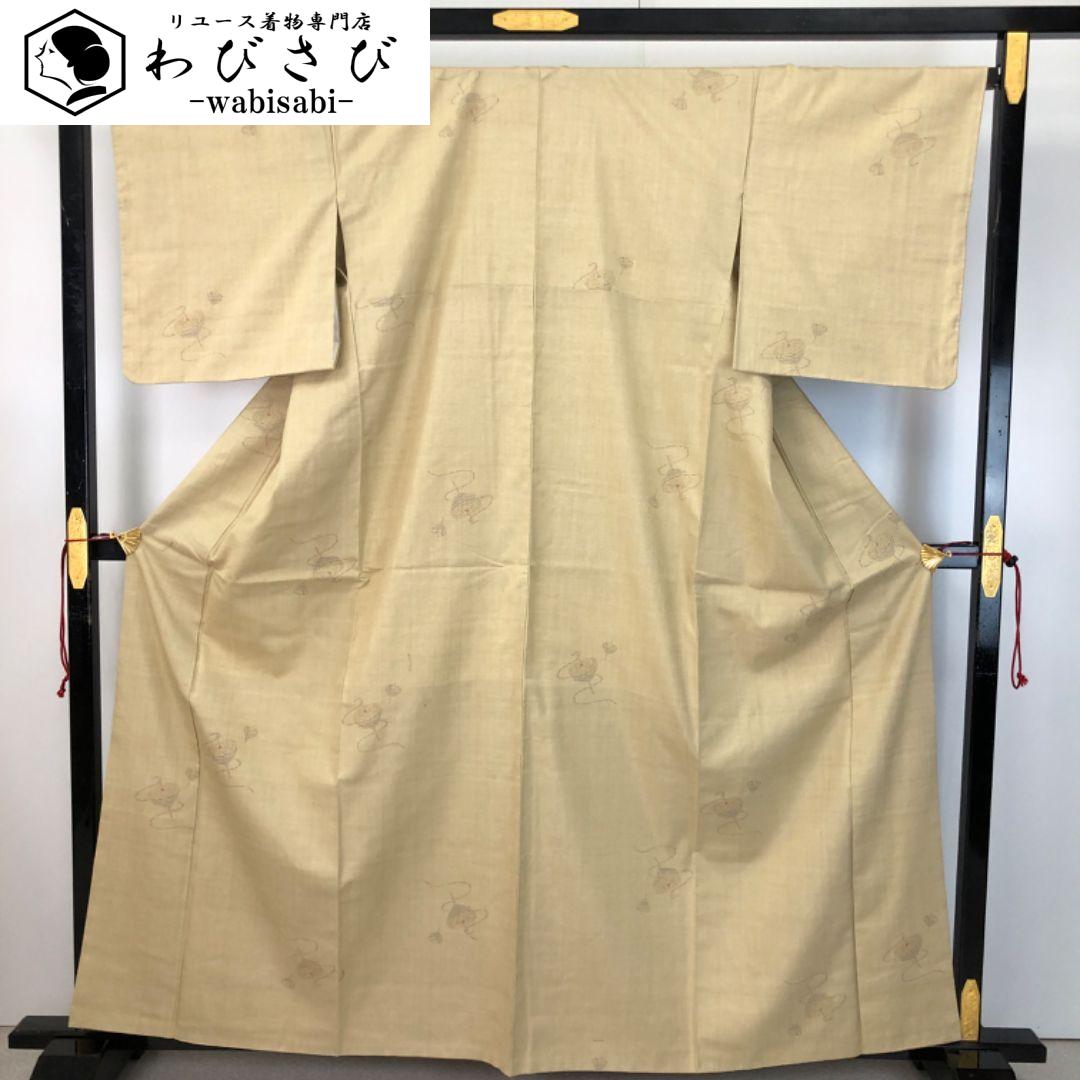 本場結城紬 100亀甲 奥順 証紙付 独楽柄 枯野色 しつけ糸 K-4899 着物 きもの kimono 和服 和装 中古 リサイクル着物 【送料無料】