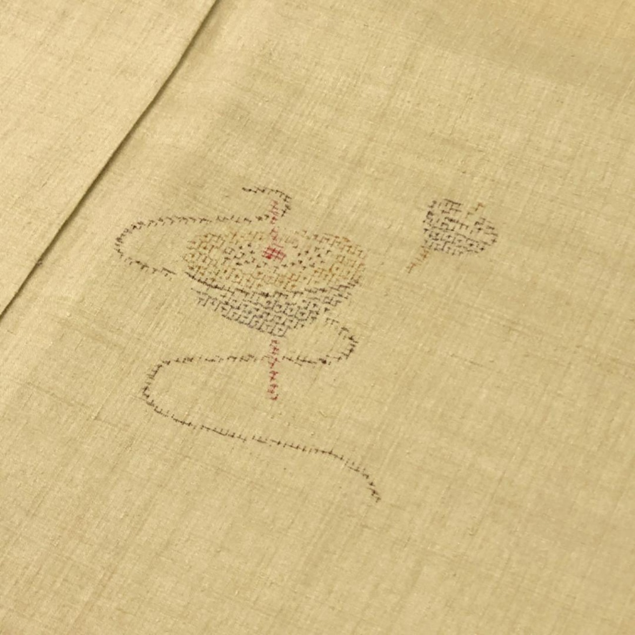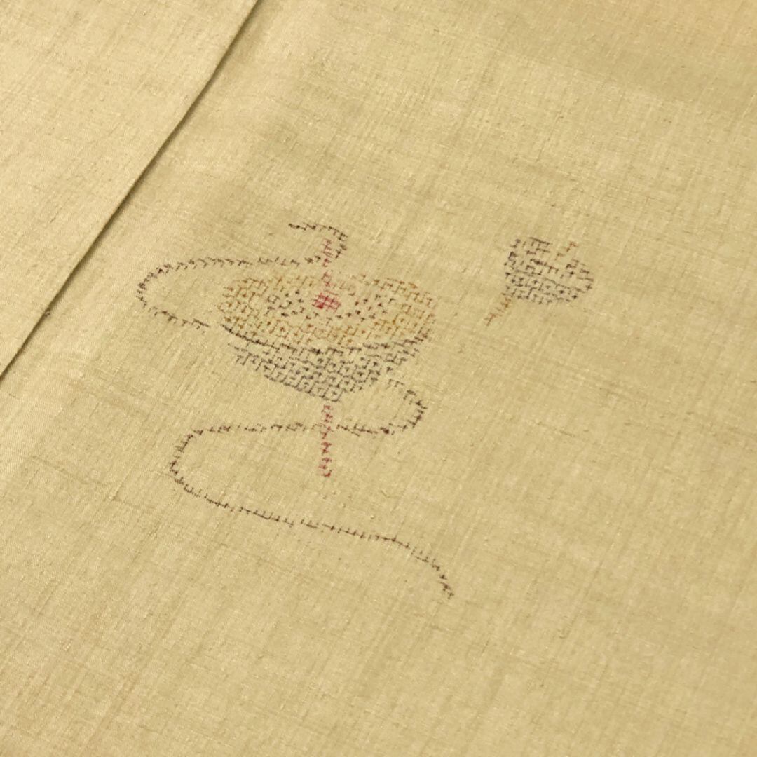 枯野色の雰囲気の良いお色味、100亀甲の駒柄がデザインされた上質な結城紬の手触りの良い素敵なお品でございます。