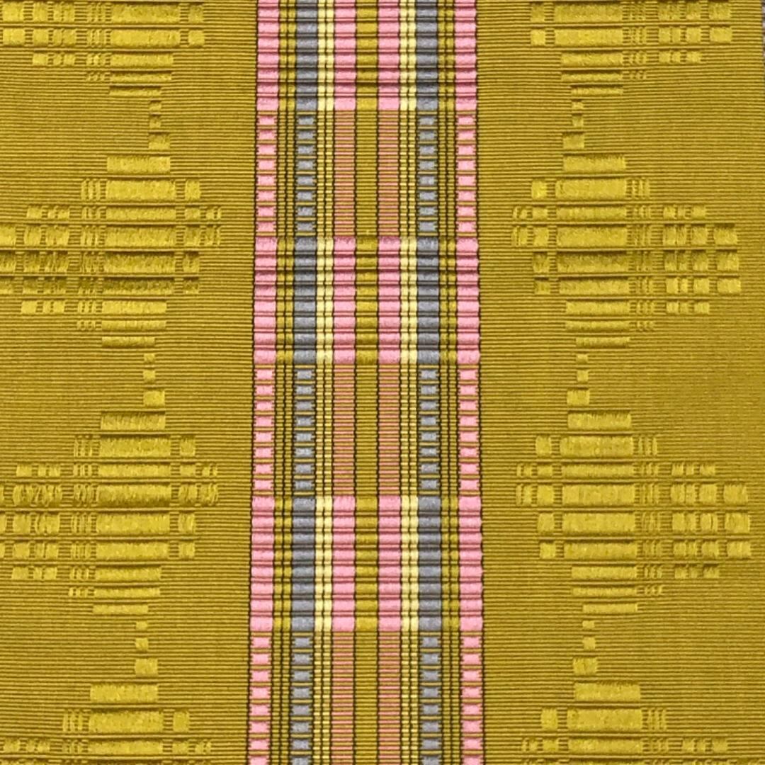 菜種油色のお色味に縦縞に雰囲気の良い織模様がデザインされた素敵な柄裄のお品でございます。