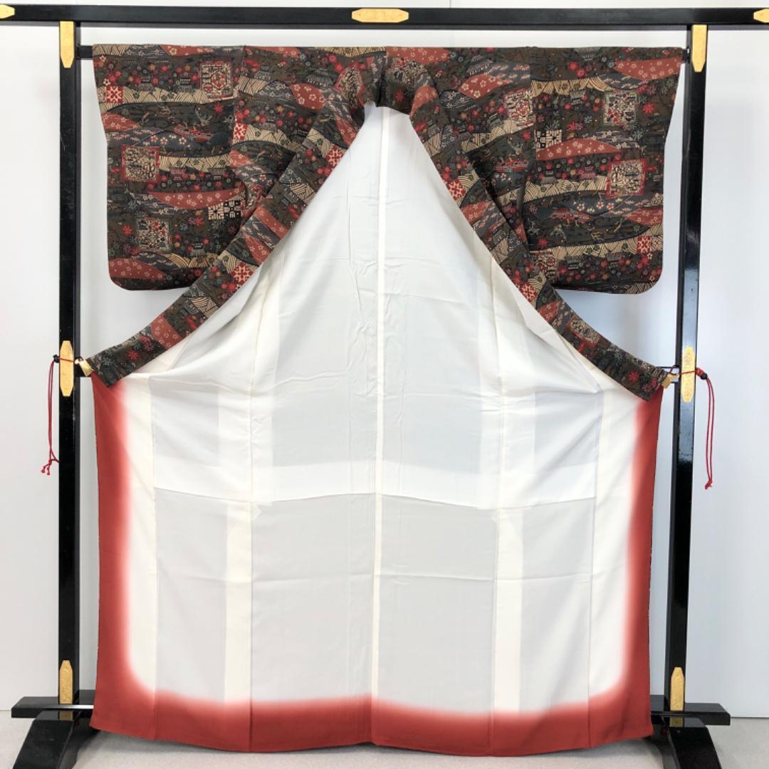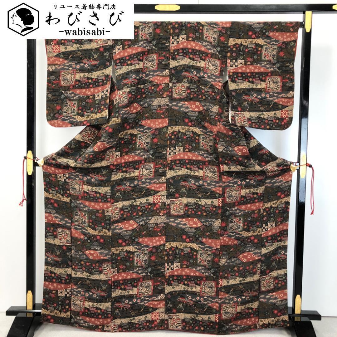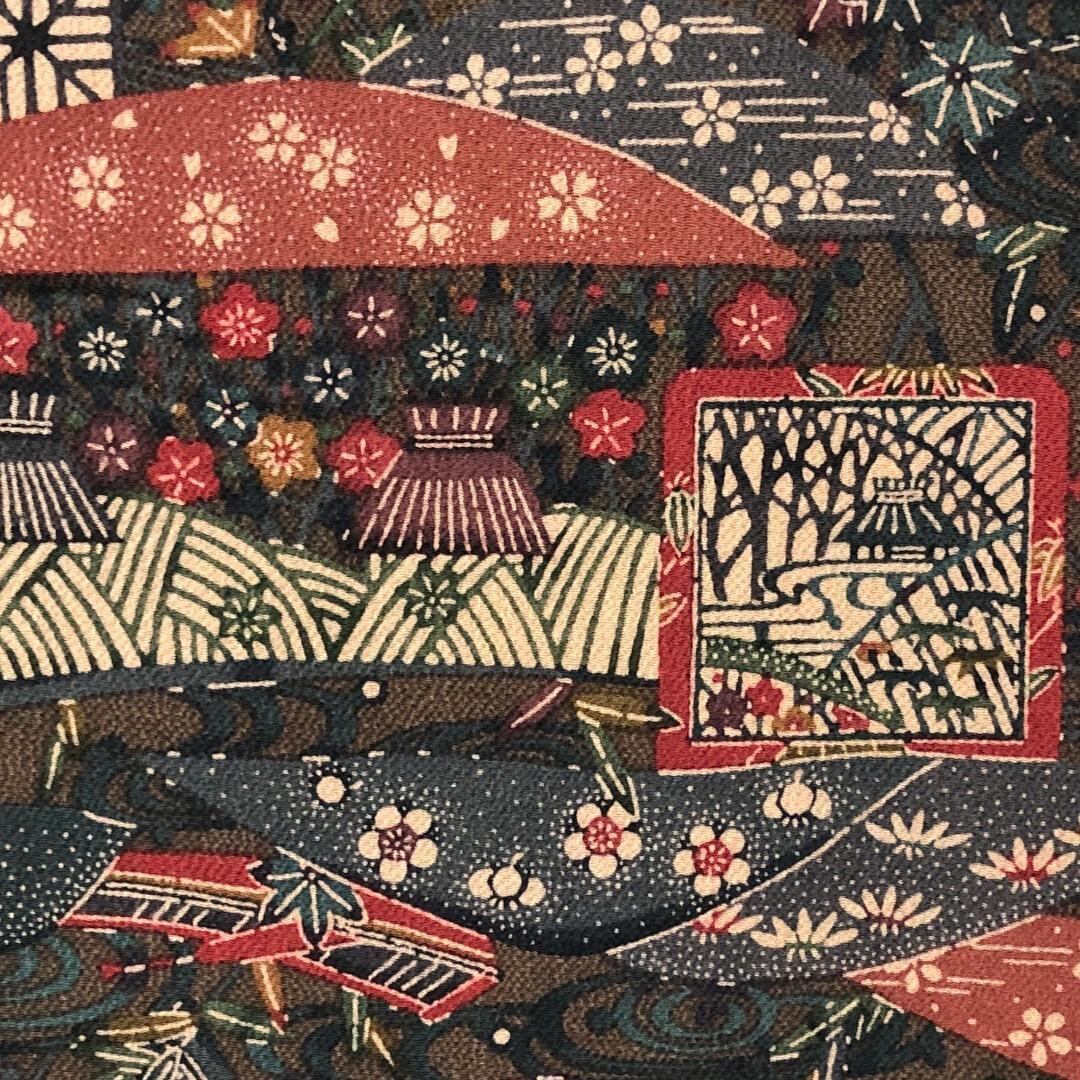 焦茶色ベースのお色味の縮緬に型染の風景花模様がデザインされた雰囲気の良い素敵なお品でございます。