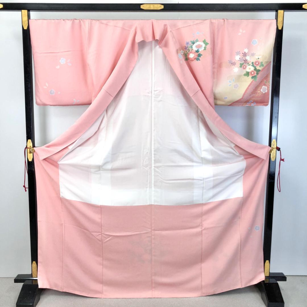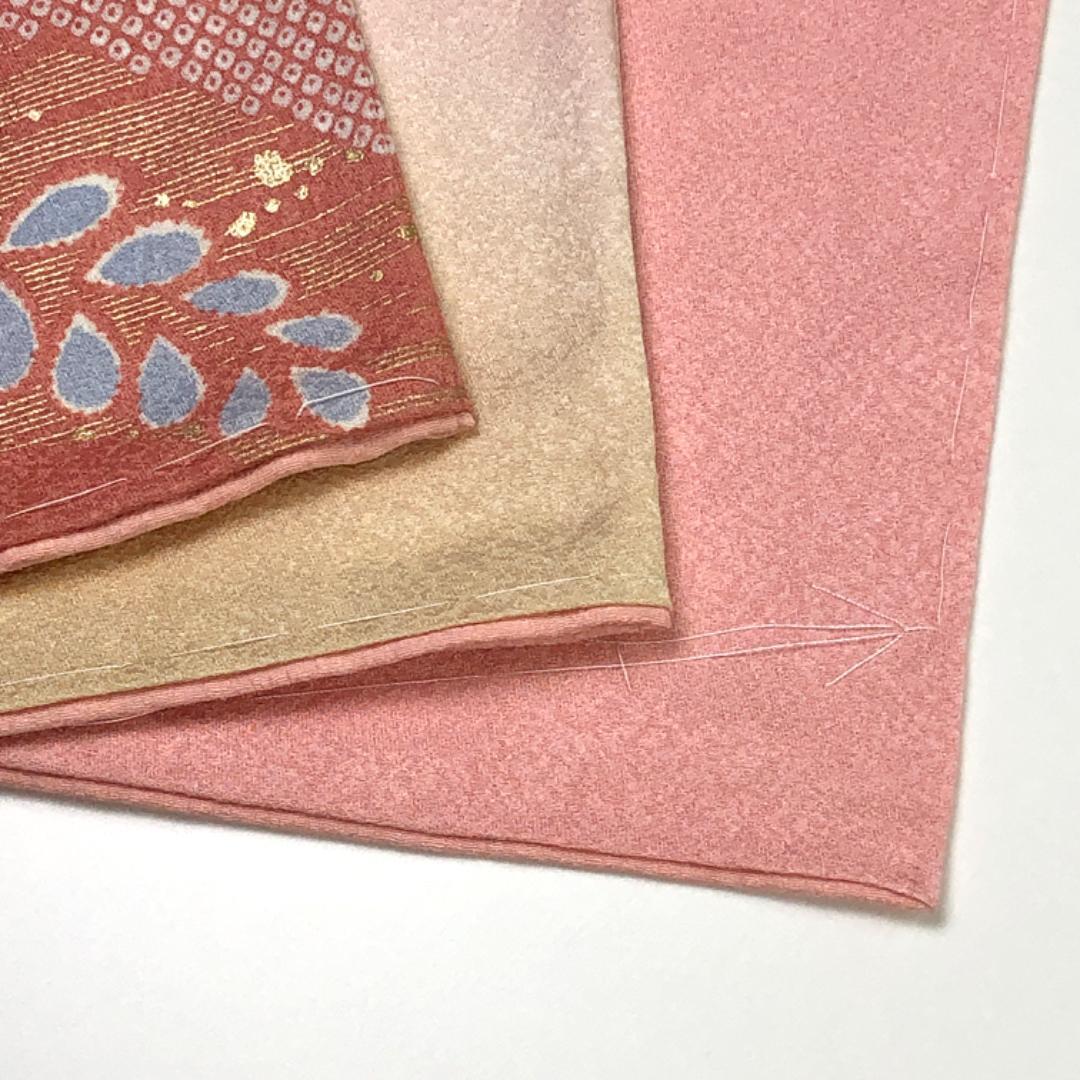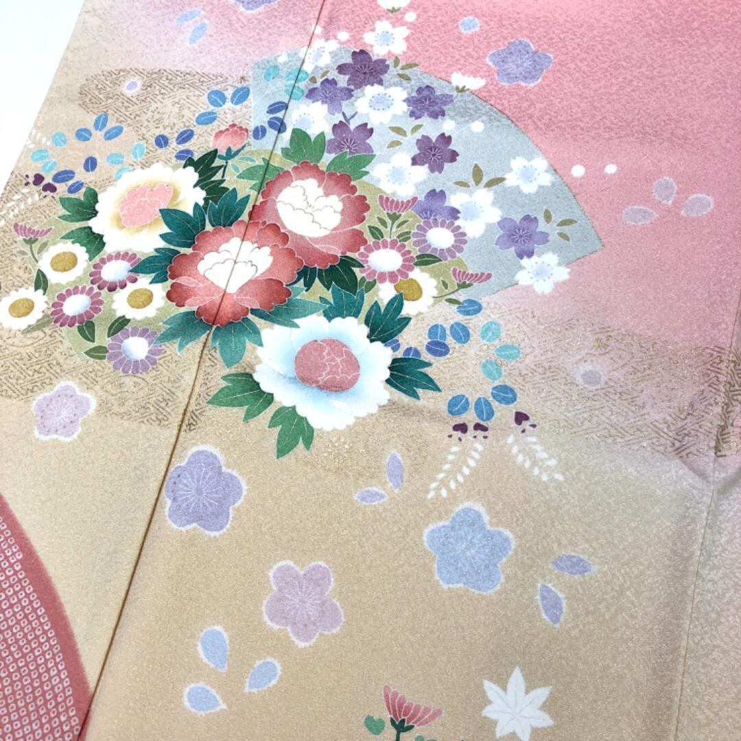 浅紅色の可愛いお色味に暈し、地紙に花模様がデザインされた素敵な柄裄のお品でございます。
