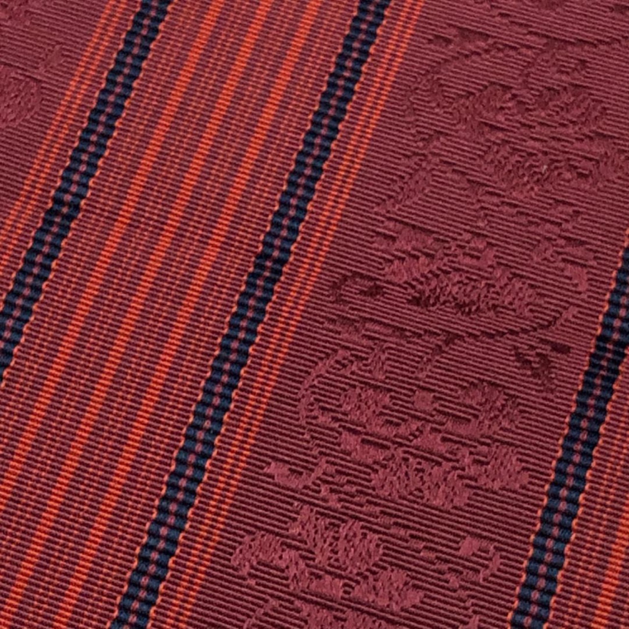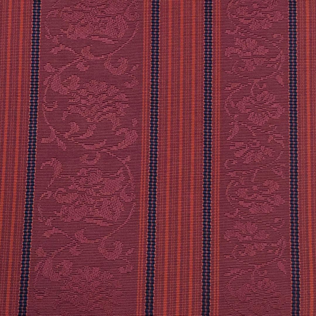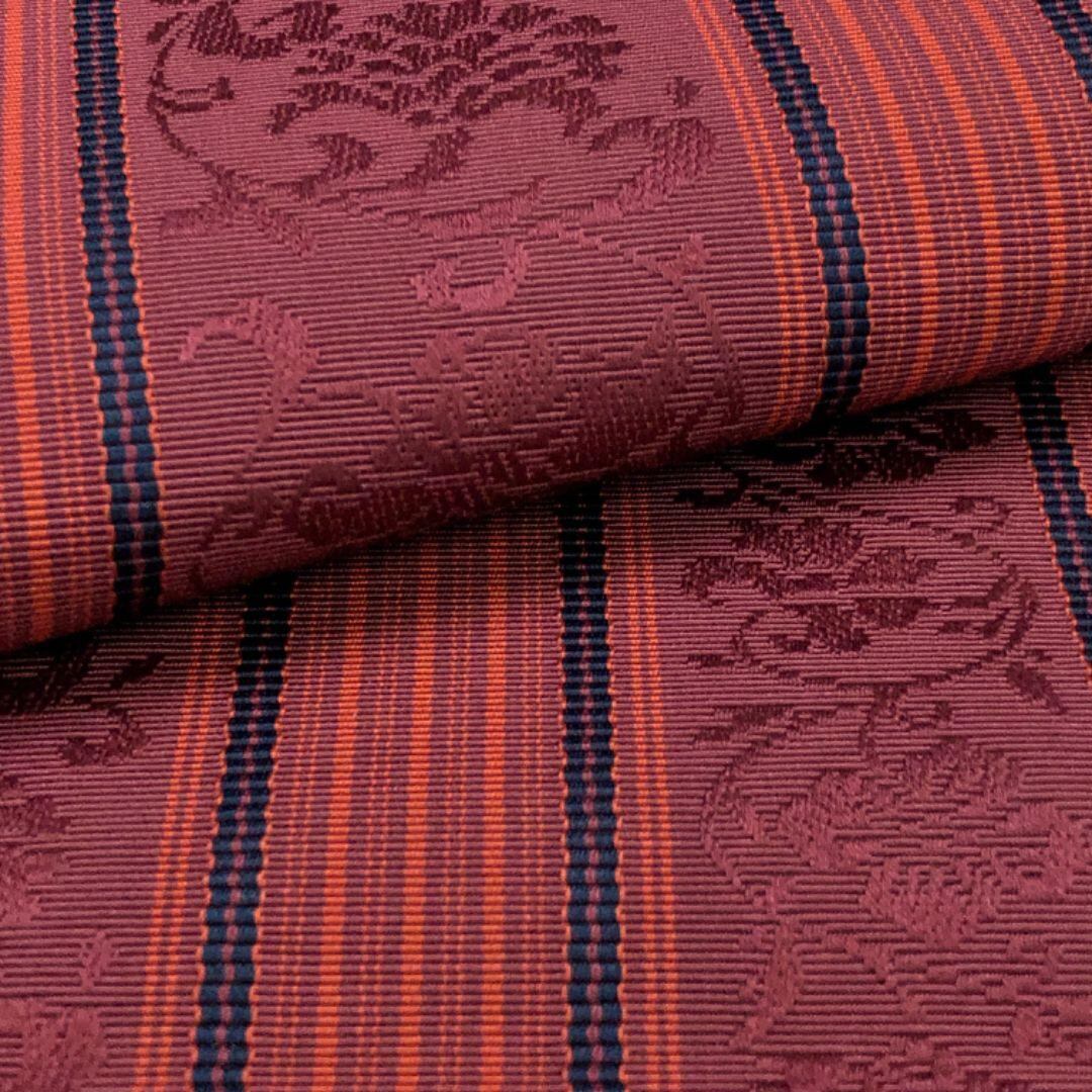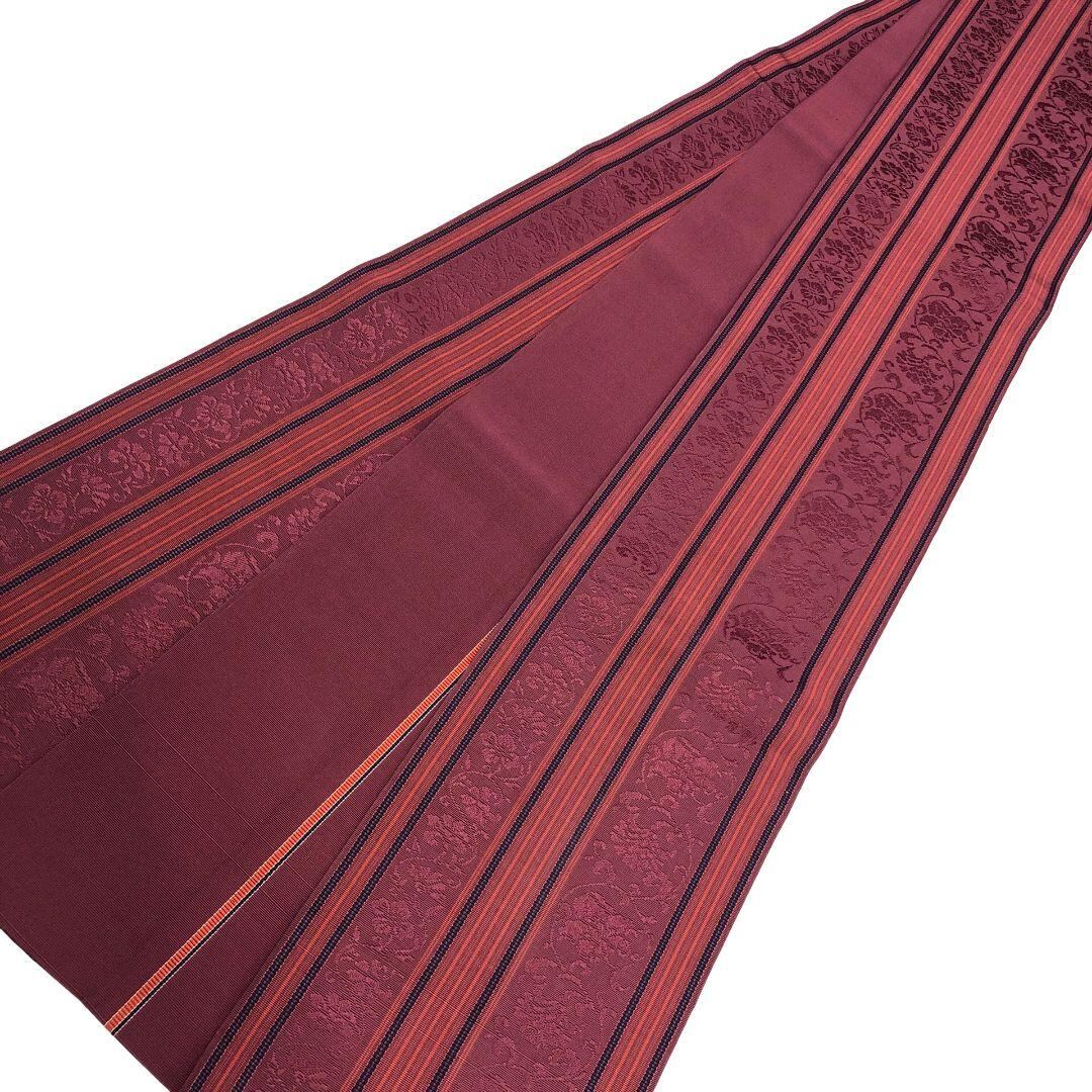 紫壇色の落ち着いたお色味に縦縞の縦縞花唐草模様がデザインされた素敵な柄裄のお品でございます。