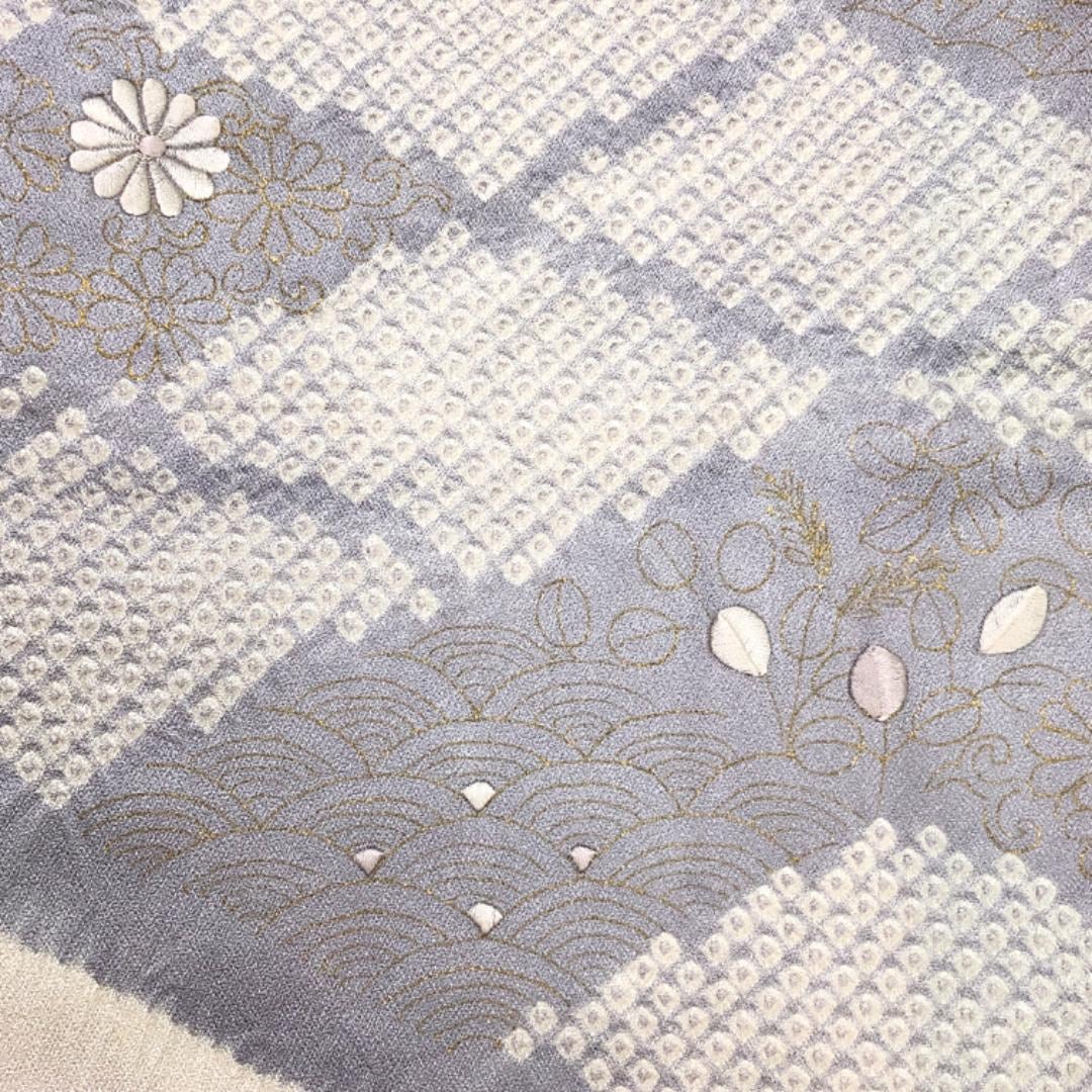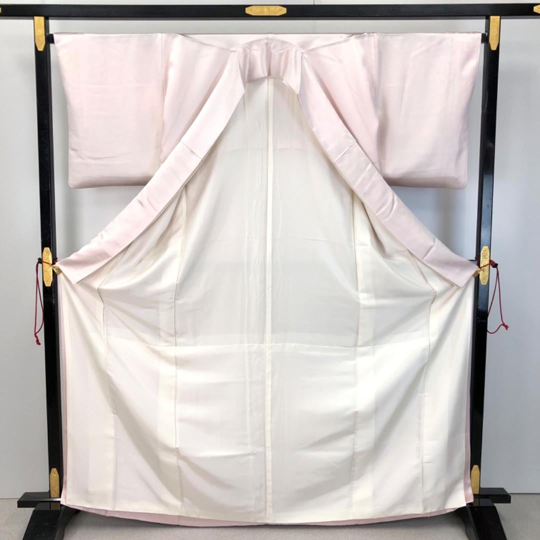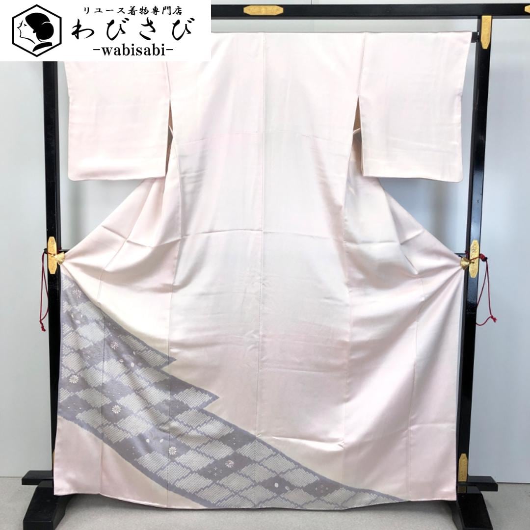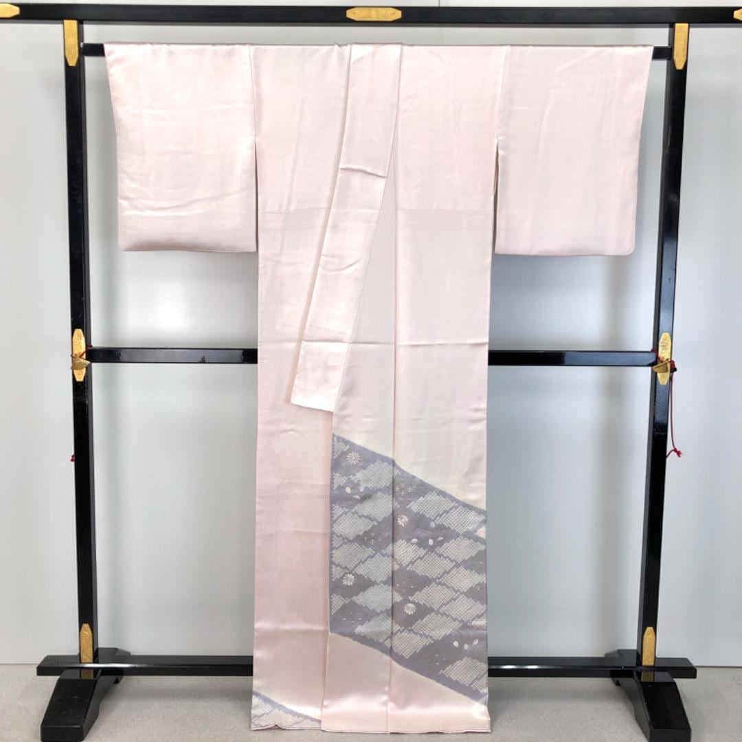 桜色の上品なお色味に絞り、菱形、花柄模様がデザインされた雰囲気の良い素敵な柄裄のお品でございます。