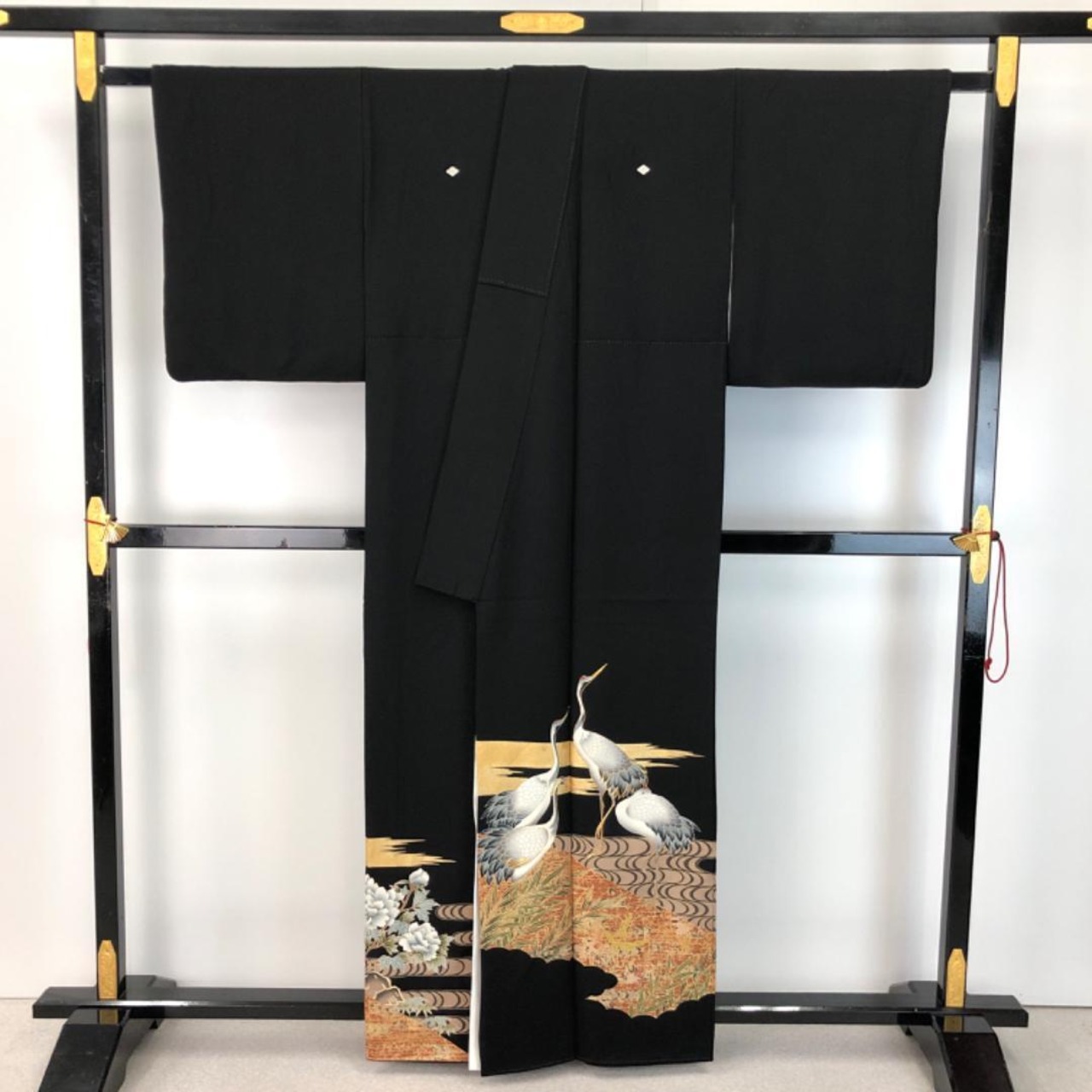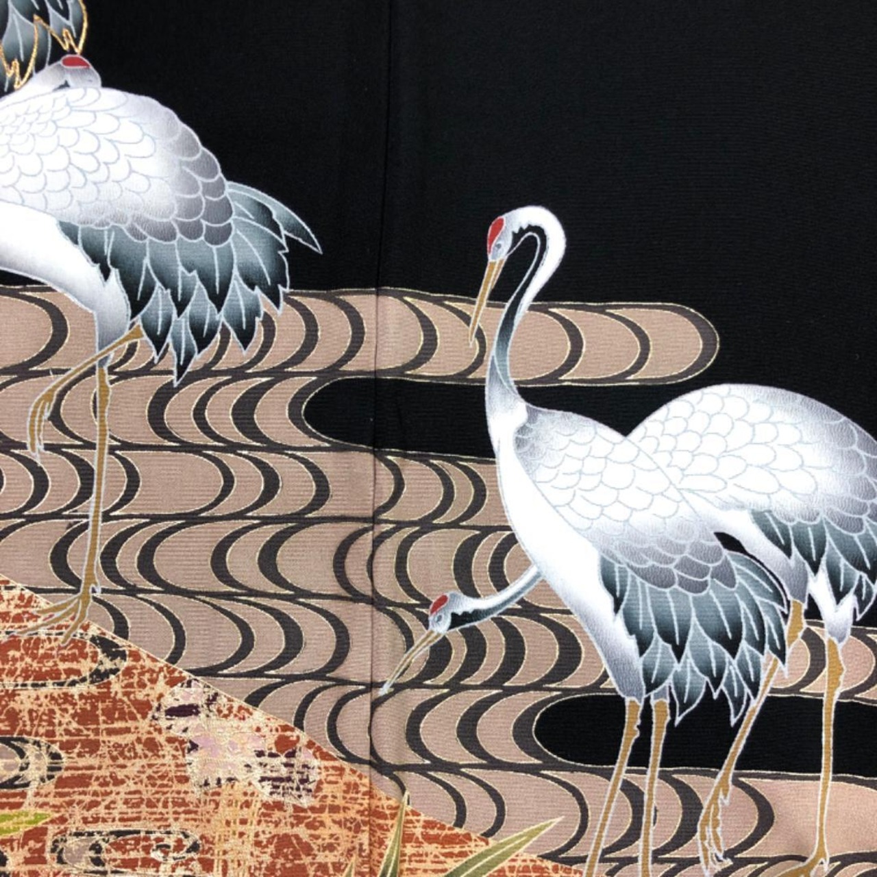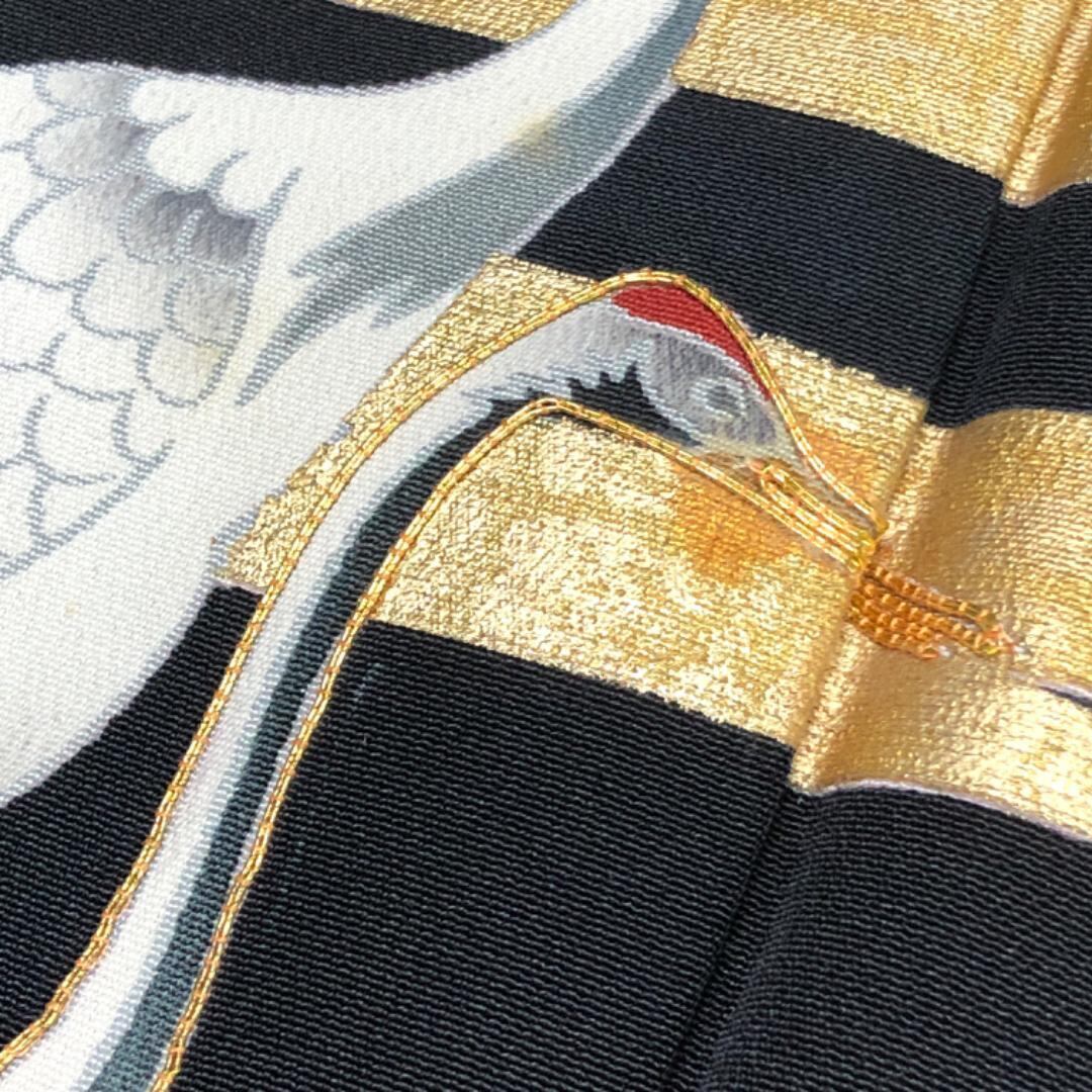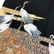 美しい鶴、流水、葉模様の煌びやかな柄行がデザインされた素敵なお品でございます。