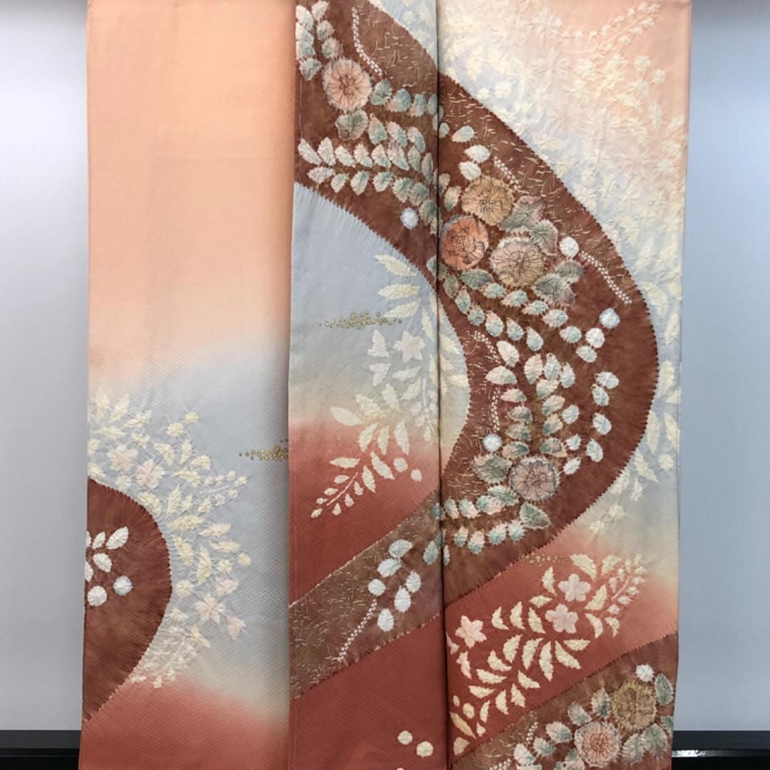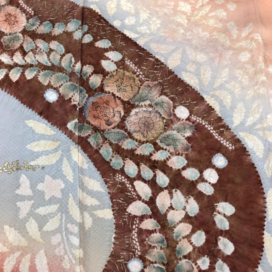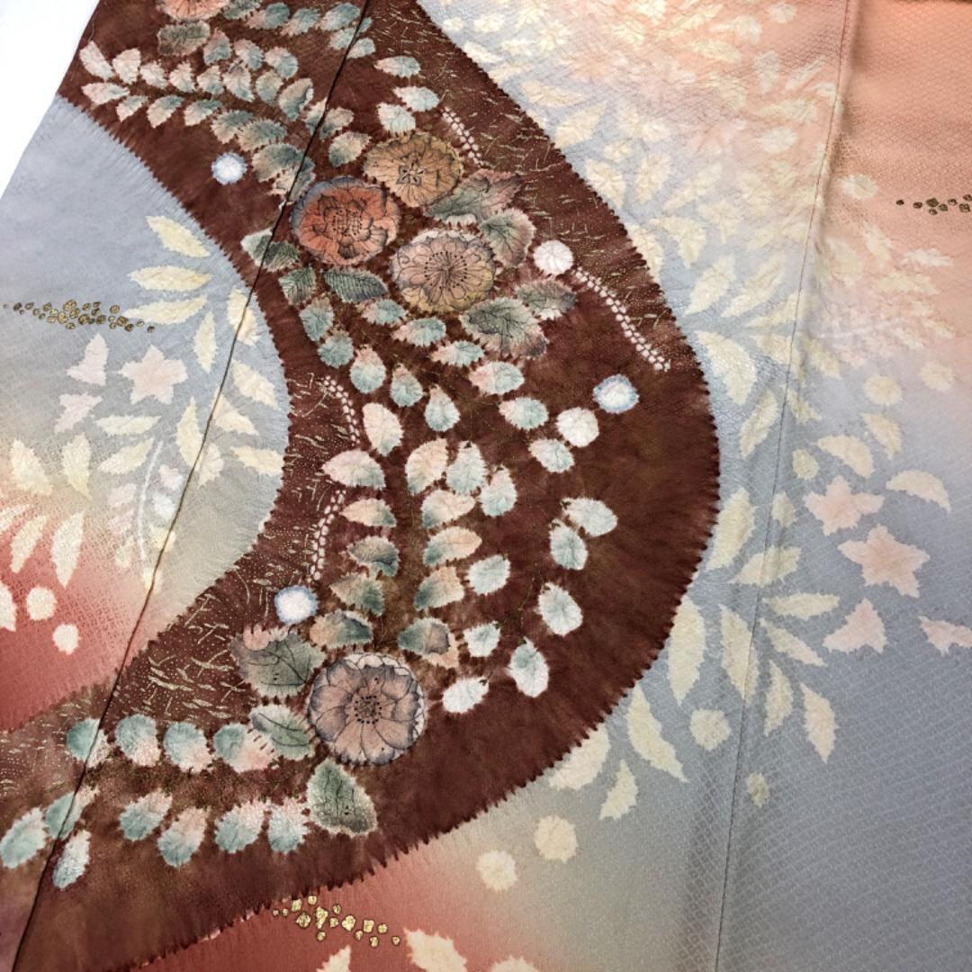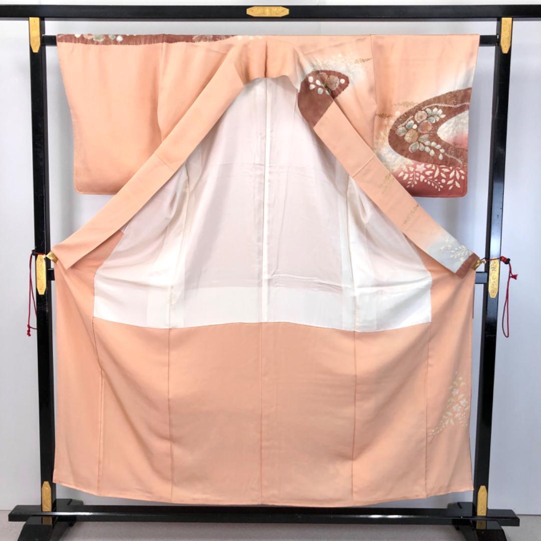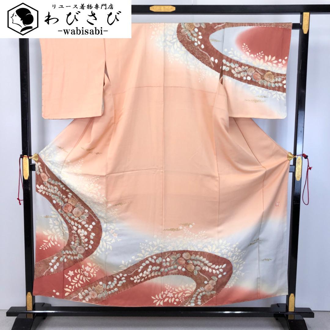 鮭色のお色味に美しい辻が花絞りがデザインされた雰囲気の良い素敵な柄裄のお品でございます。