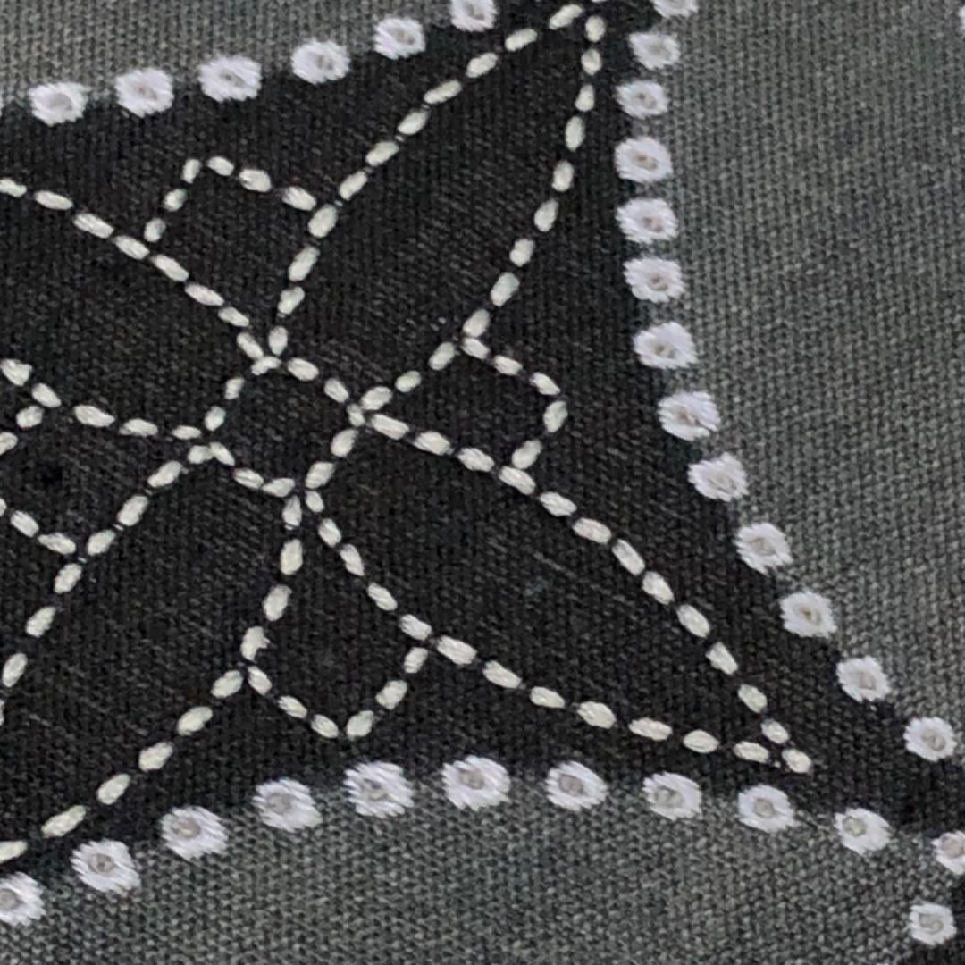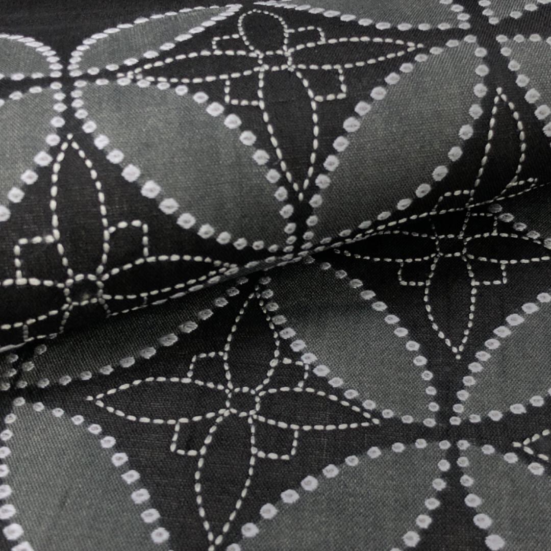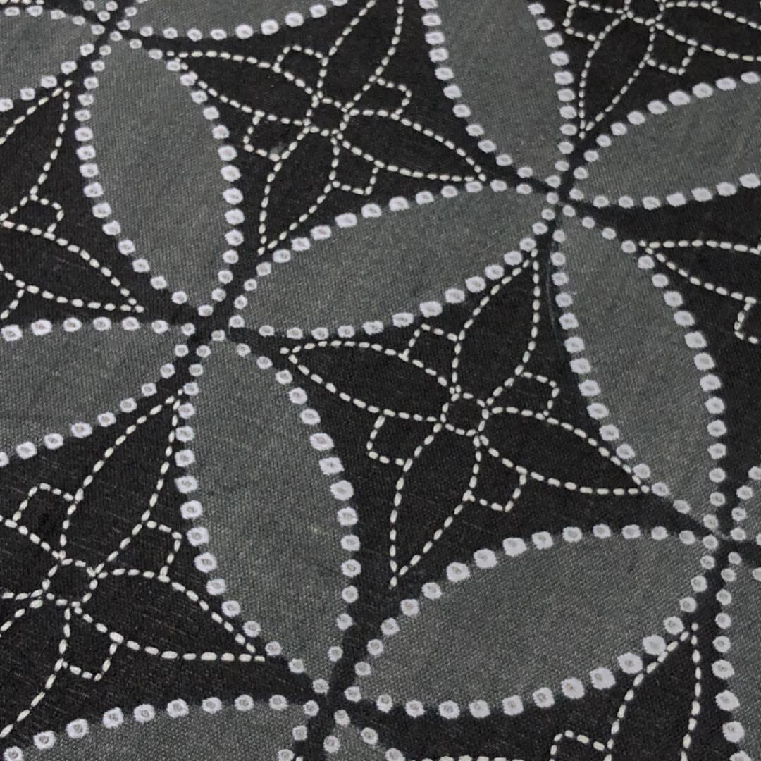 透け感のある黒色の紬地に刺し子の花七宝繋ぎがデザインされた雰囲気の良い素敵な柄裄のお品でございます。