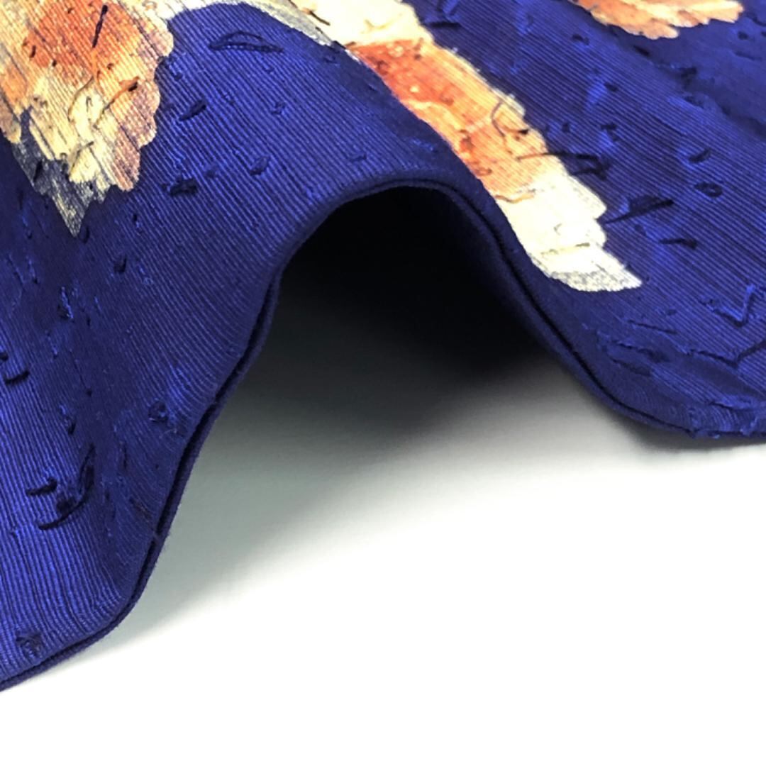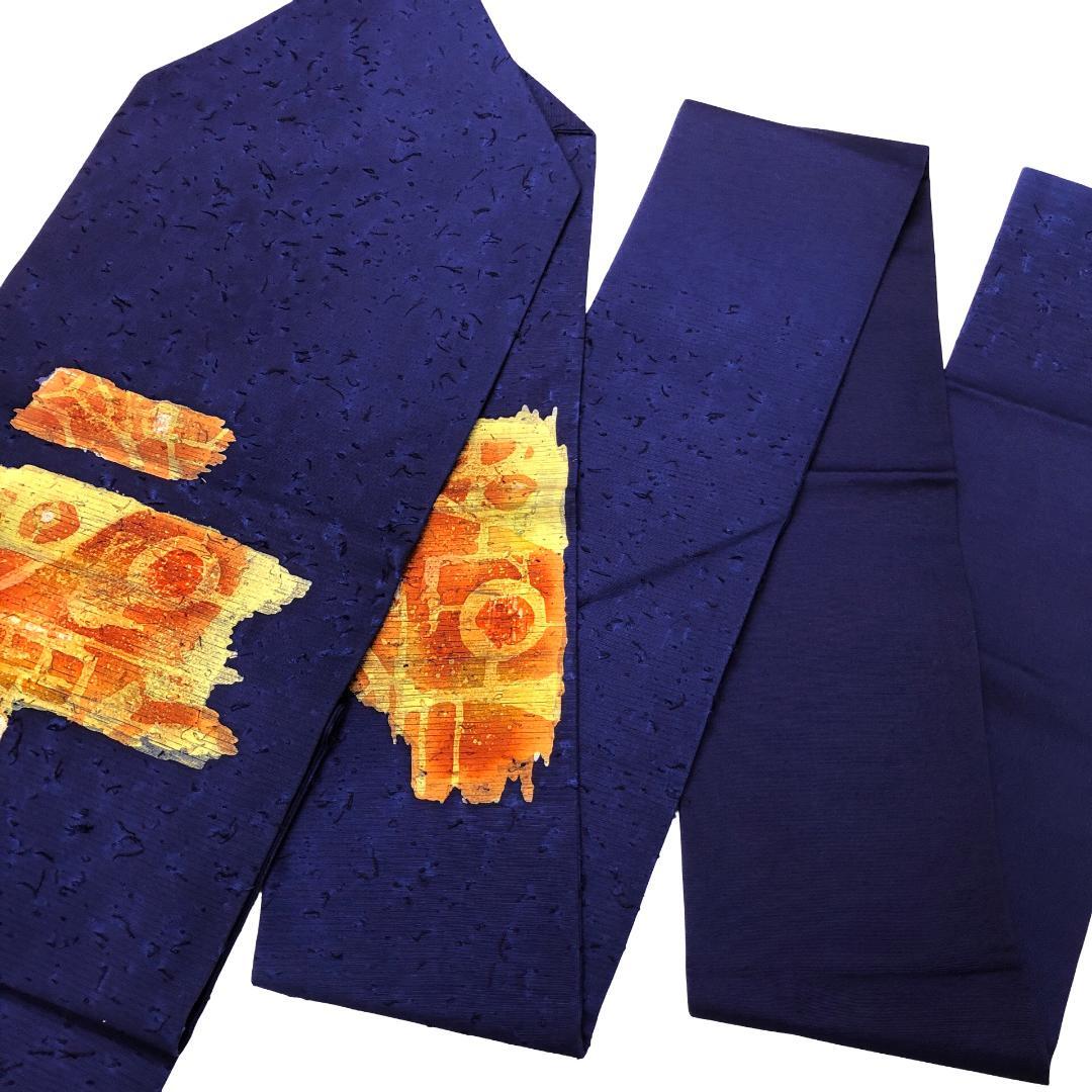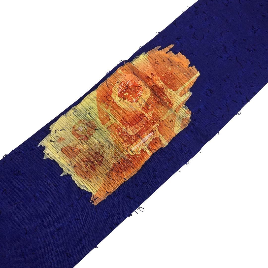 瑠璃色の青味のお色味の髭紬地に抽象模様がデザインされた雰囲気の良い素敵なお品でございます。