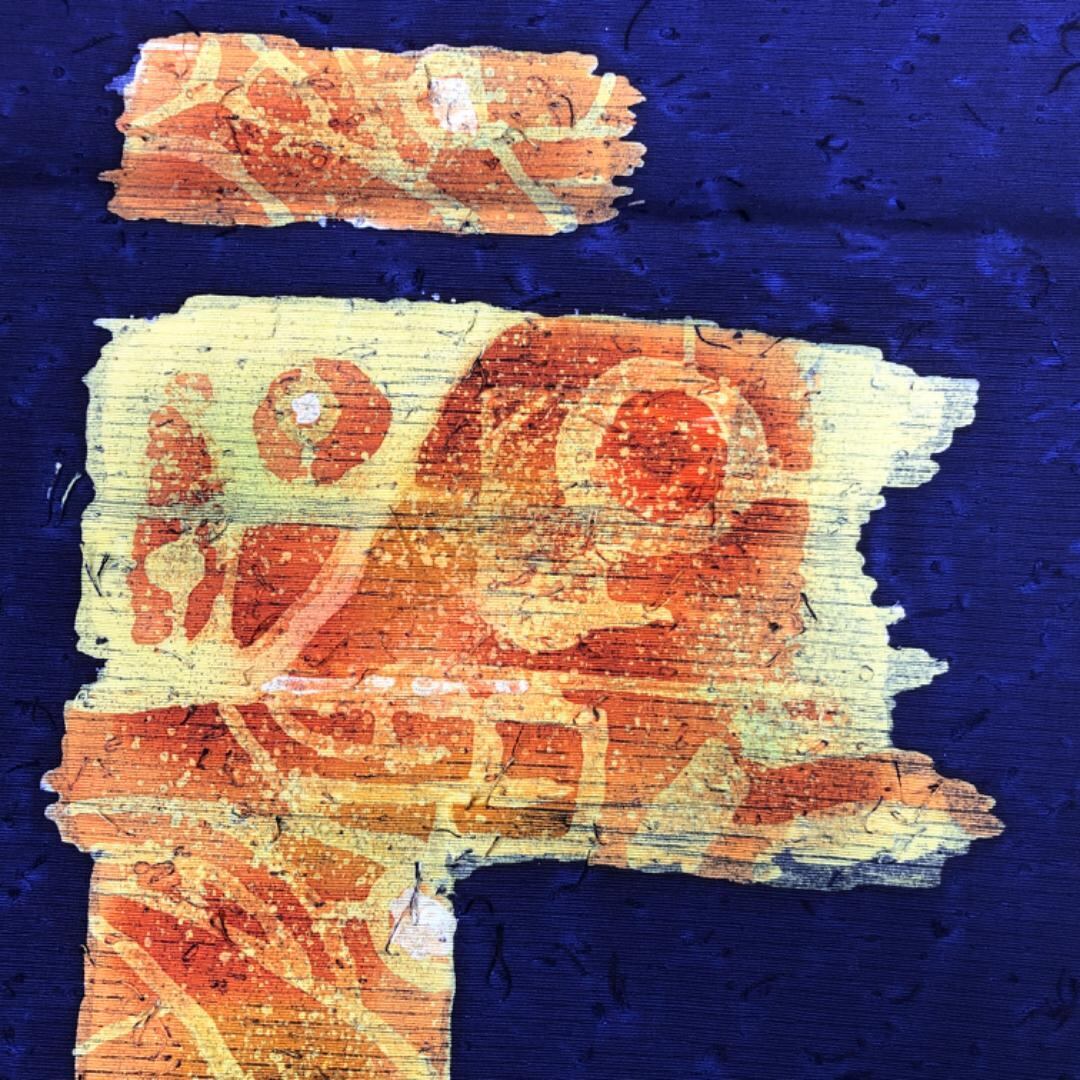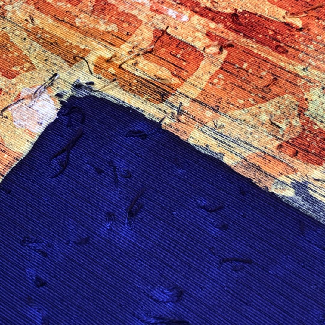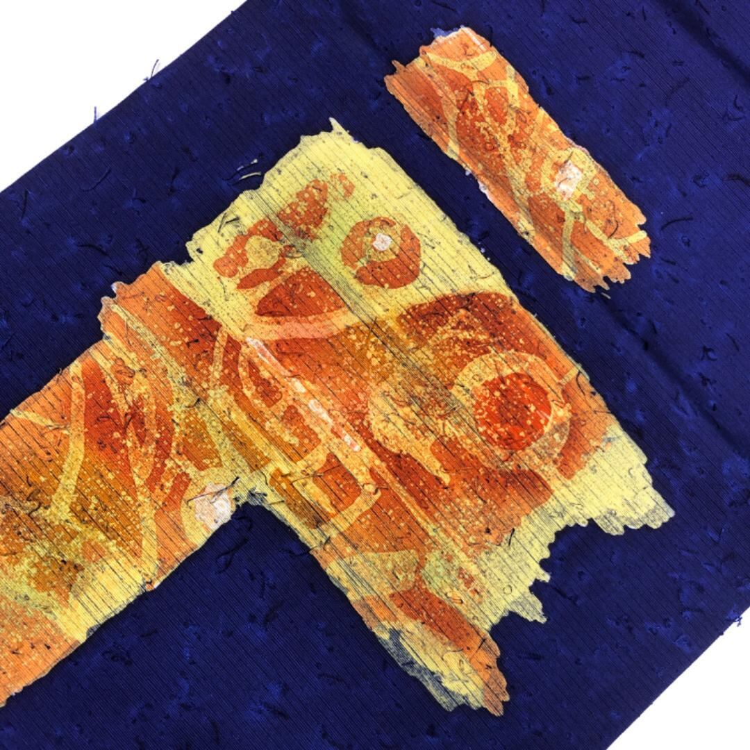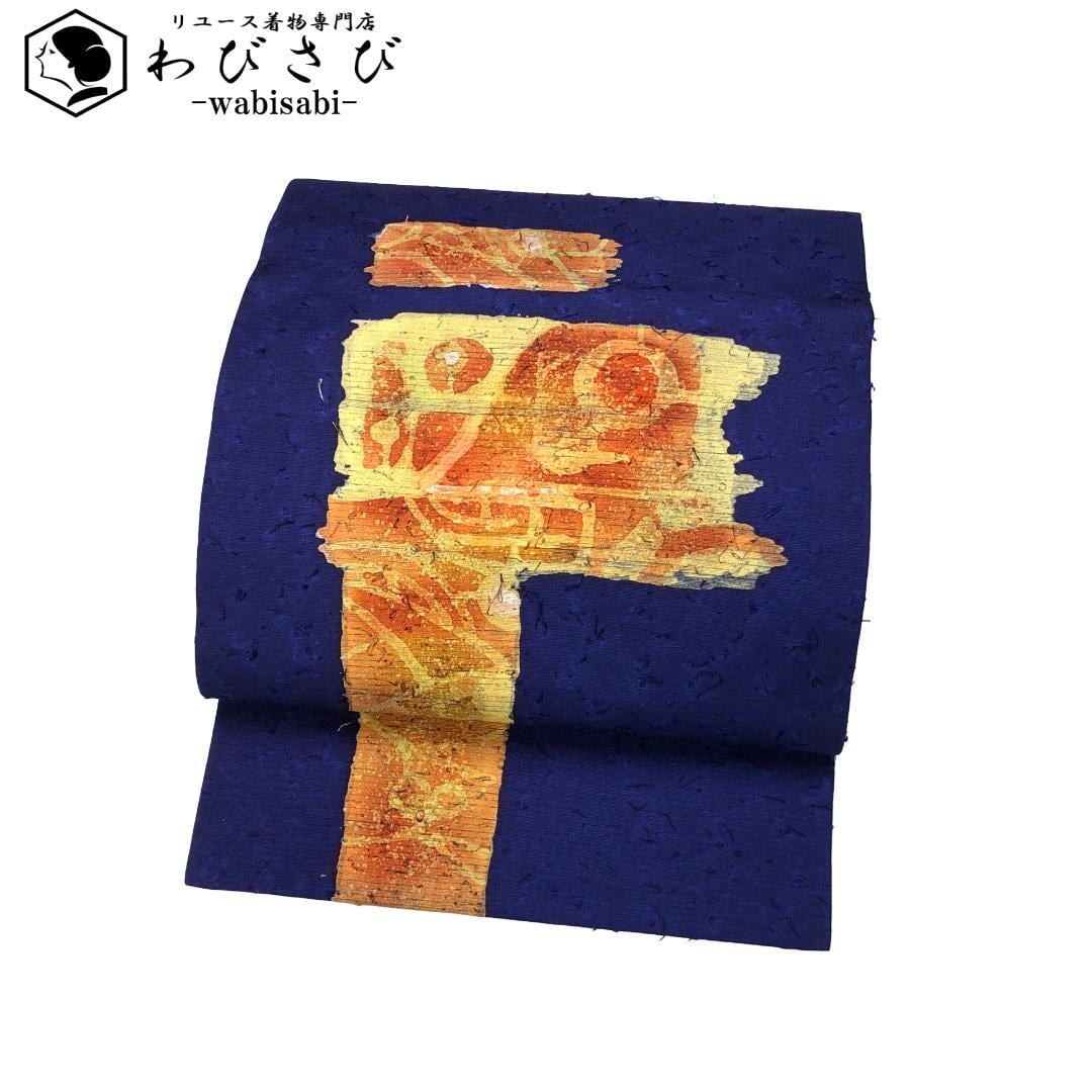 瑠璃色の青味のお色味の髭紬地に抽象模様がデザインされた雰囲気の良い素敵なお品でございます。