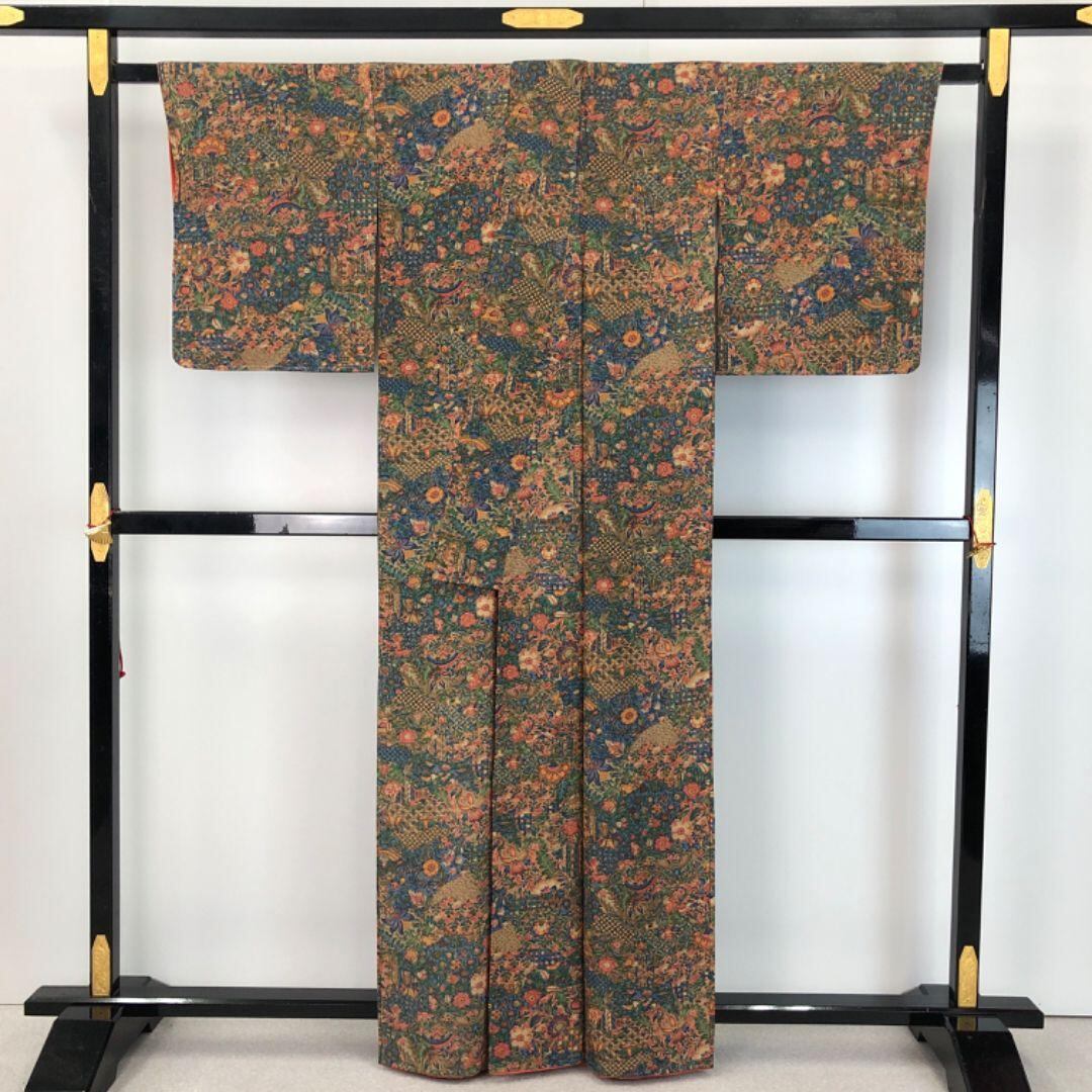 小紋 花更紗 縮緬 桑染色 K-4853 着物 きもの kimono 和服 和装 中古 リサイクル着物 【送料無料】