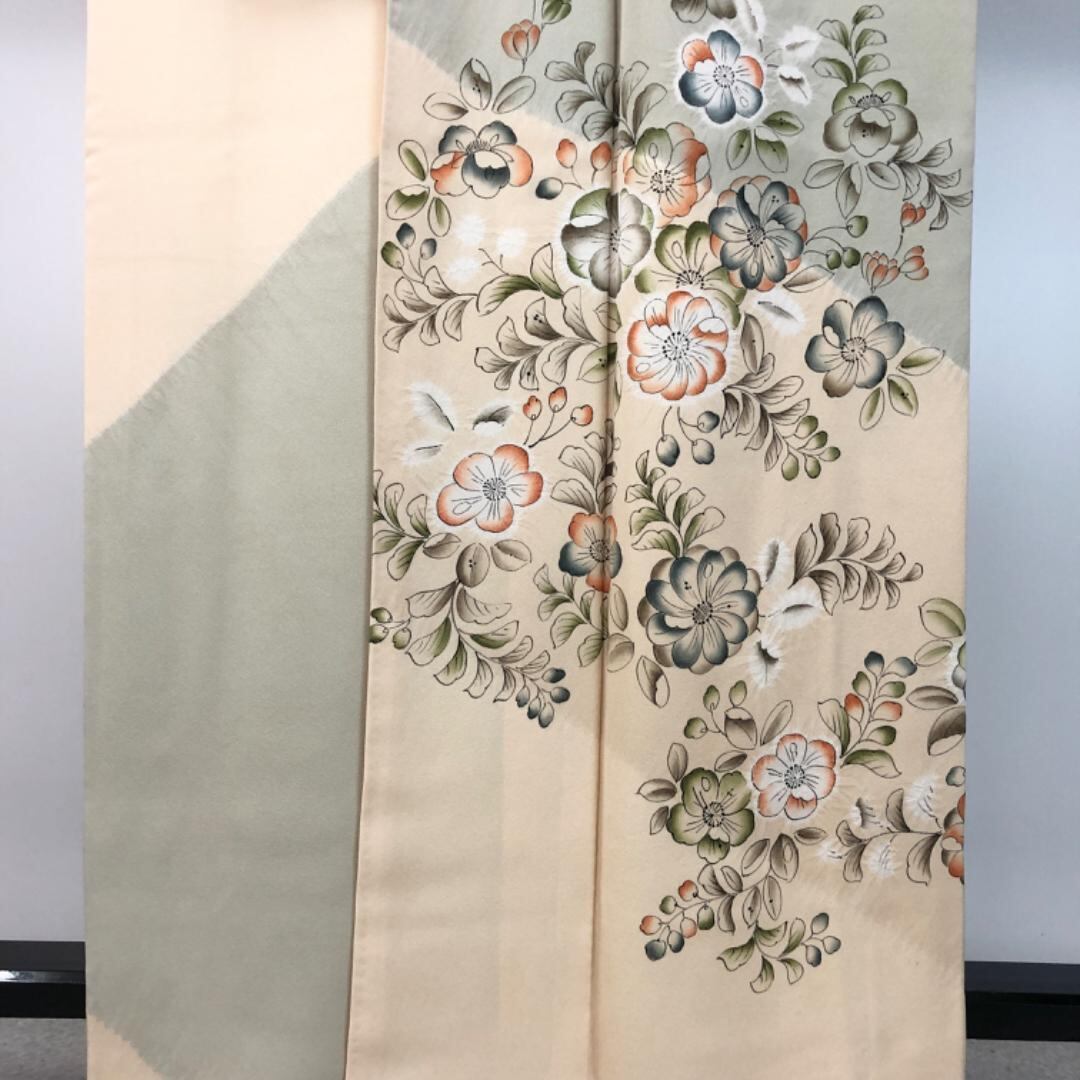 薄卵色ベースの染分けのお色味に雰囲気の良い辻が花絞りの柄裄がデザインされた素敵なお品でございます。