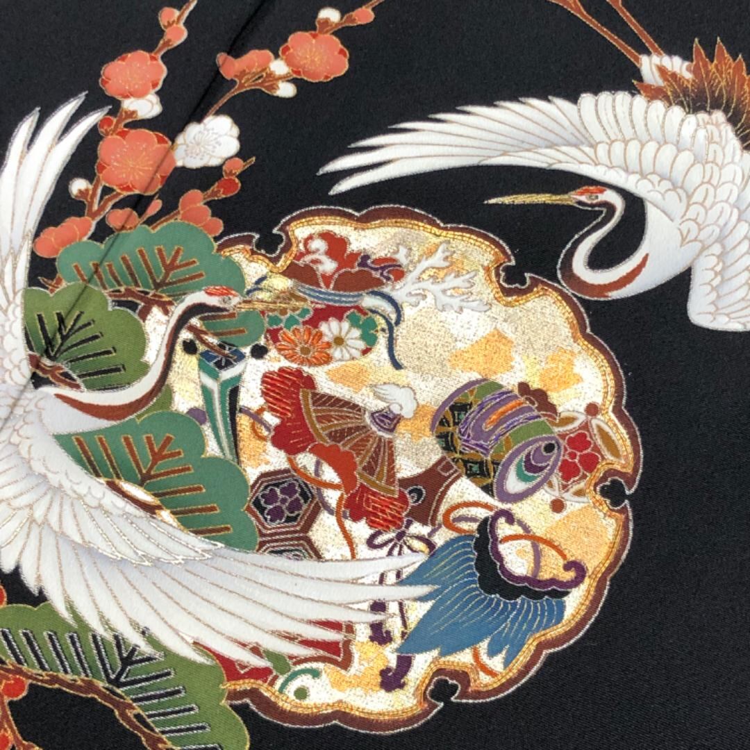 金駒刺繍、金彩が使われた雪輪に鶴、短冊、花模様、宝尽しなどの柄行がデザインされた素敵なお品でございます。