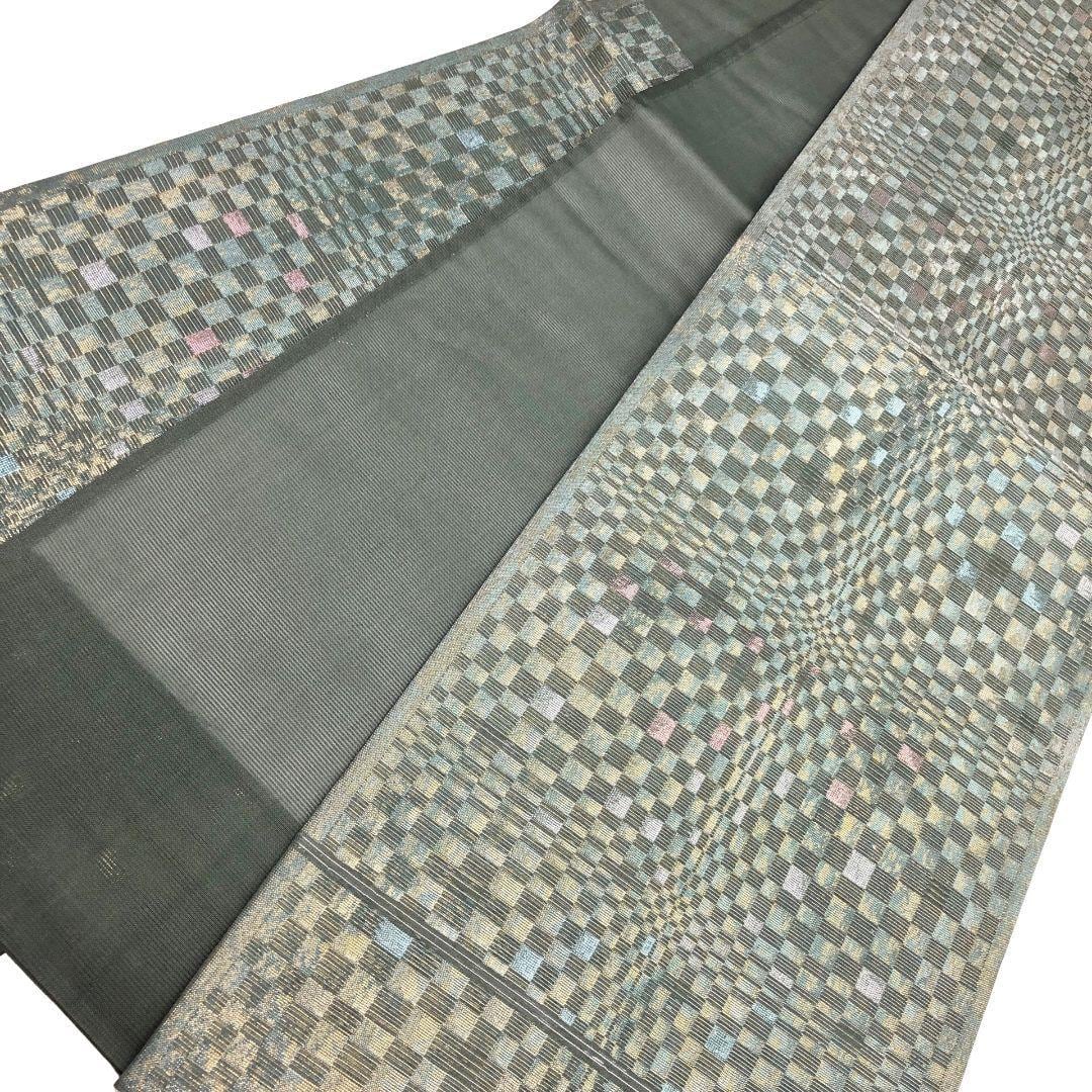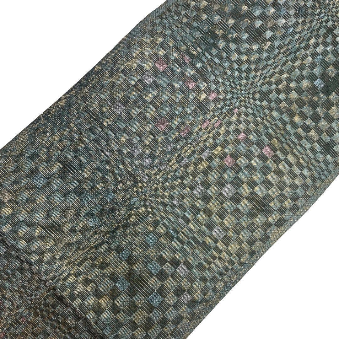 夏帯 袋帯 変わり市松模様 金銀糸 岩緑青色 O-5202 着物 きもの kimono 和服 和装 中古 リサイクル着物 【送料無料】