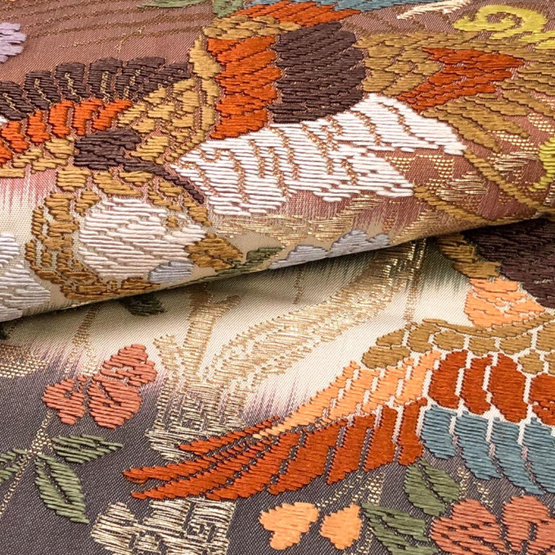 色彩の美しい花喰い鳥、花柄模様の唐織でデザインされた素敵な柄裄のお品でございます。