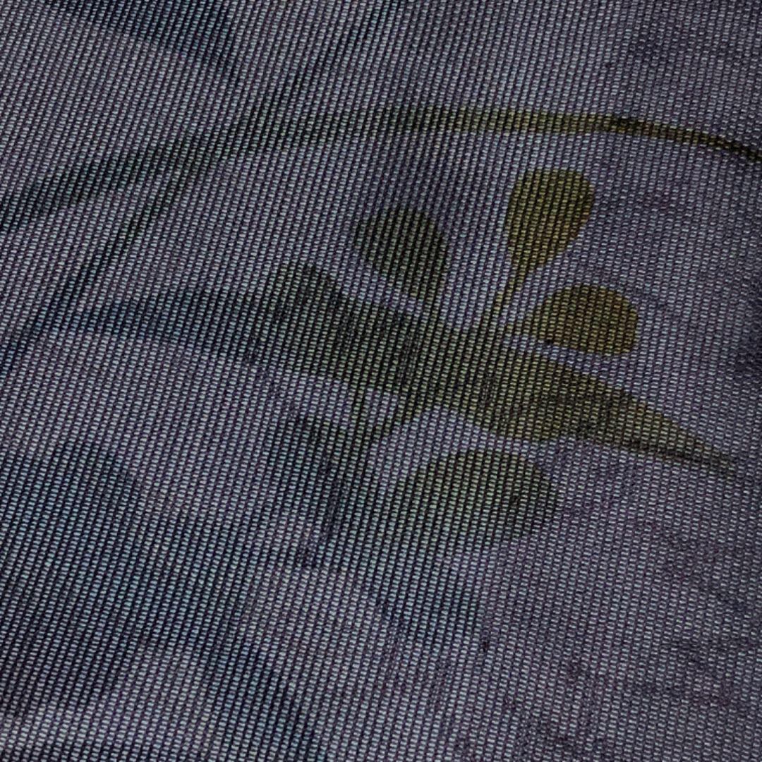 透け感のある鉄葡萄色ベースのお色味のグラデーション、影に浮き上がるような幻想的な花草模様がデザインされた素敵な柄裄のお品でございます。