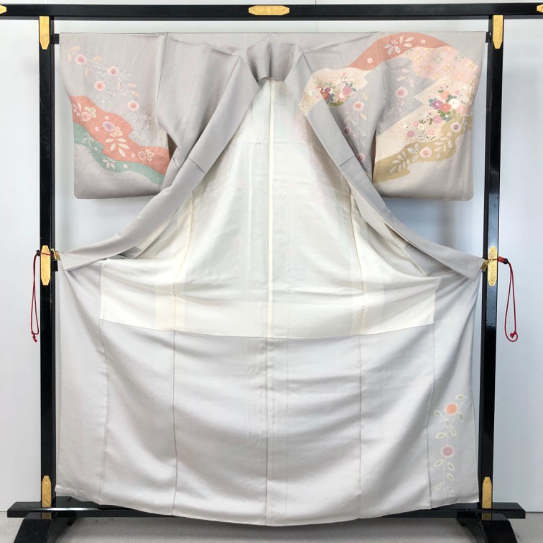 小町鼠色ベースの淡く雰囲気の良い色彩、絞り、金彩が使われた美しい四季の花模様がデザインされた素敵な柄行のお品でございます。