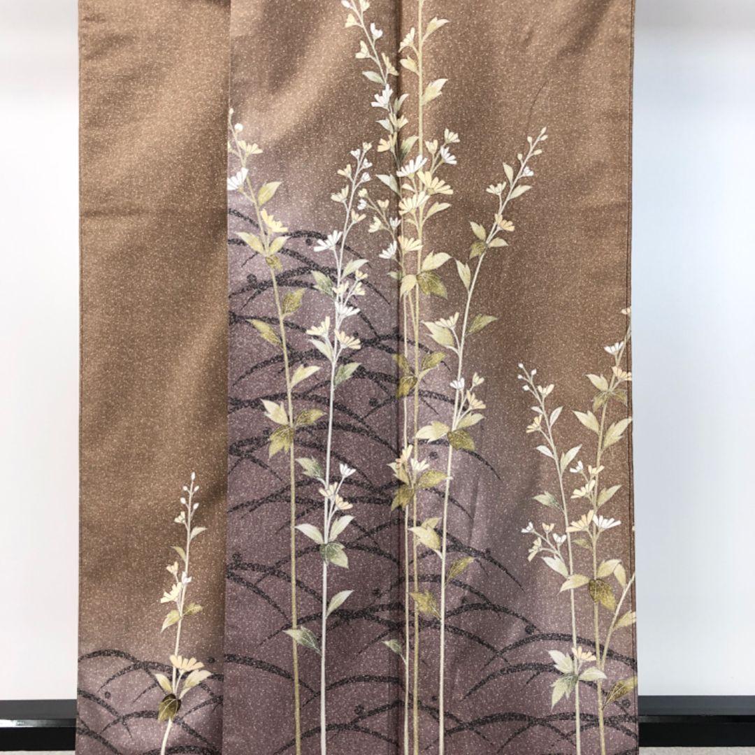 錆利休色の落ち着きのあるお色味に叩き染、花草模様の雰囲気の良い柄裄がデザインされた素敵なお品でございます。