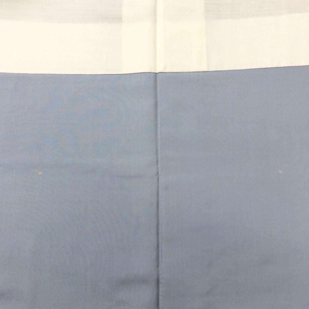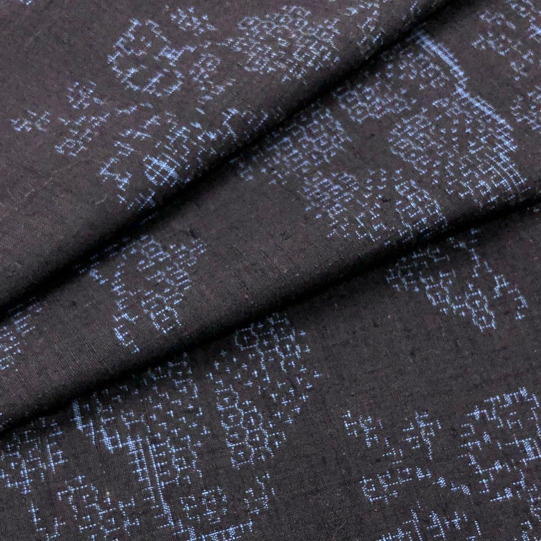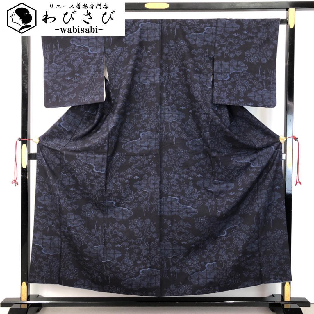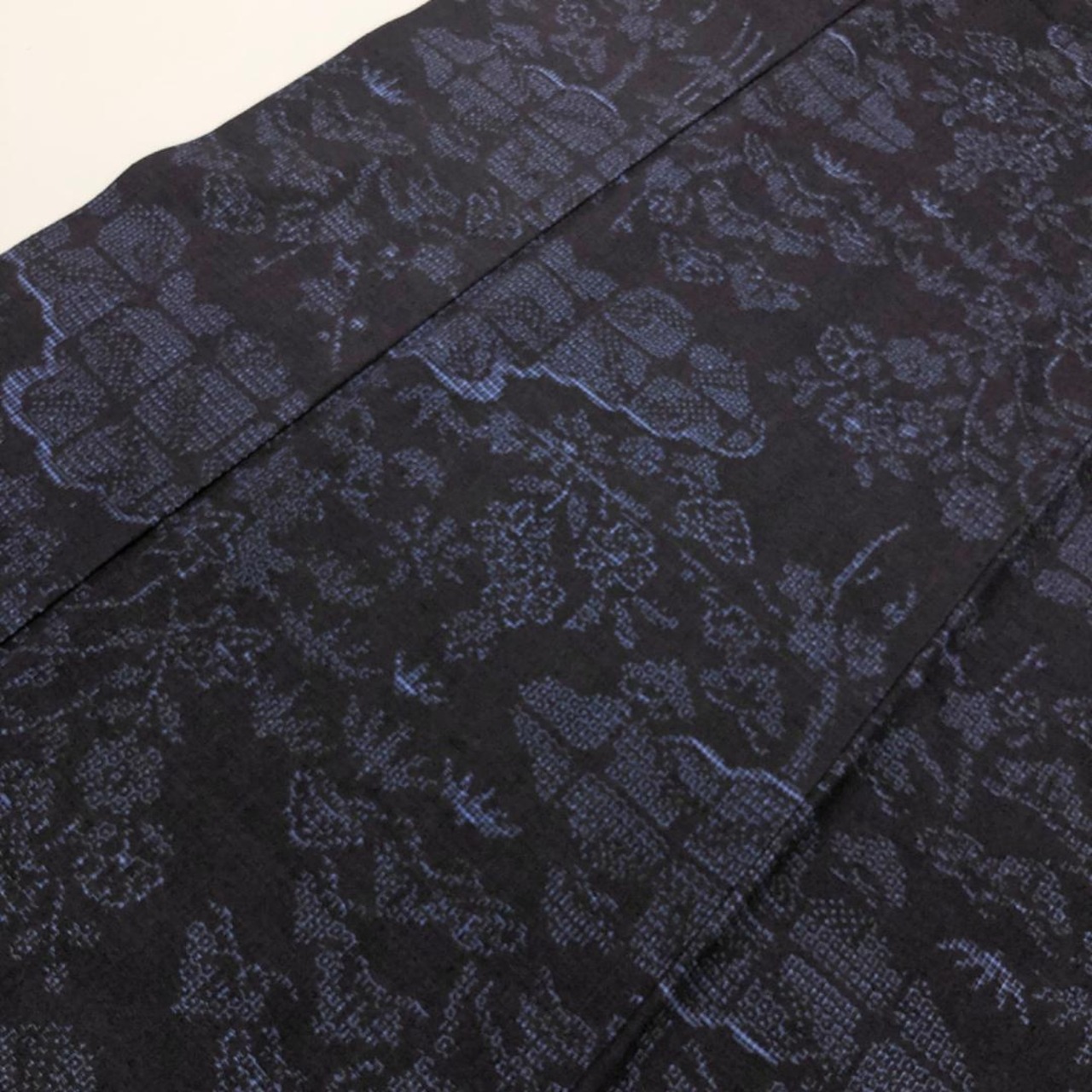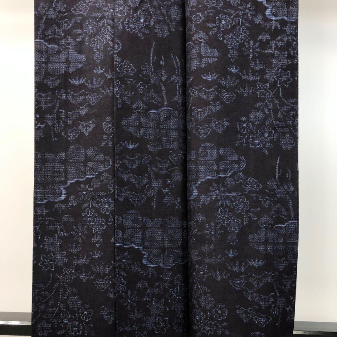 藍色のお色味に雲に花模様がデザインされた雰囲気の良い上質な手触りの結城紬の素敵なお品でございます。