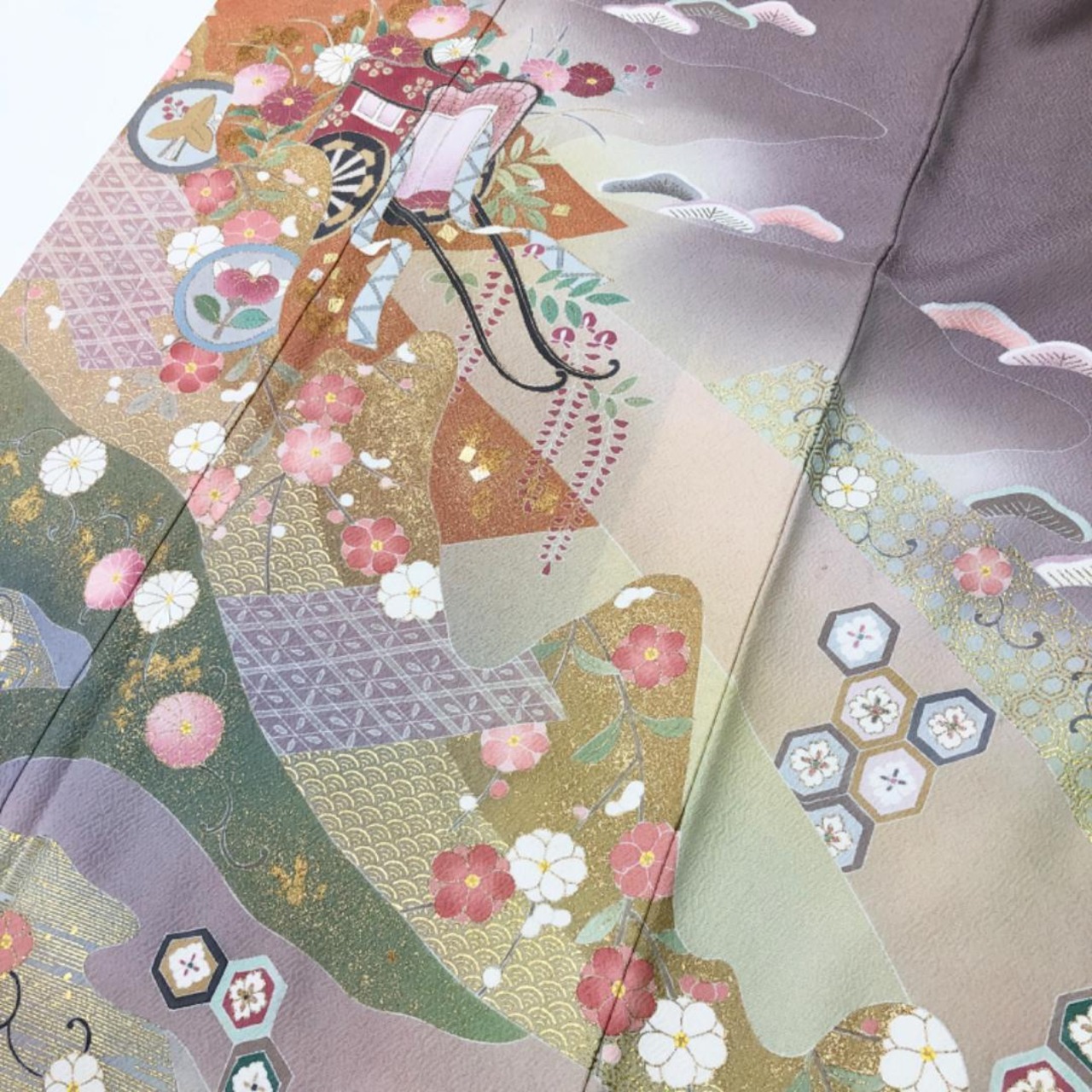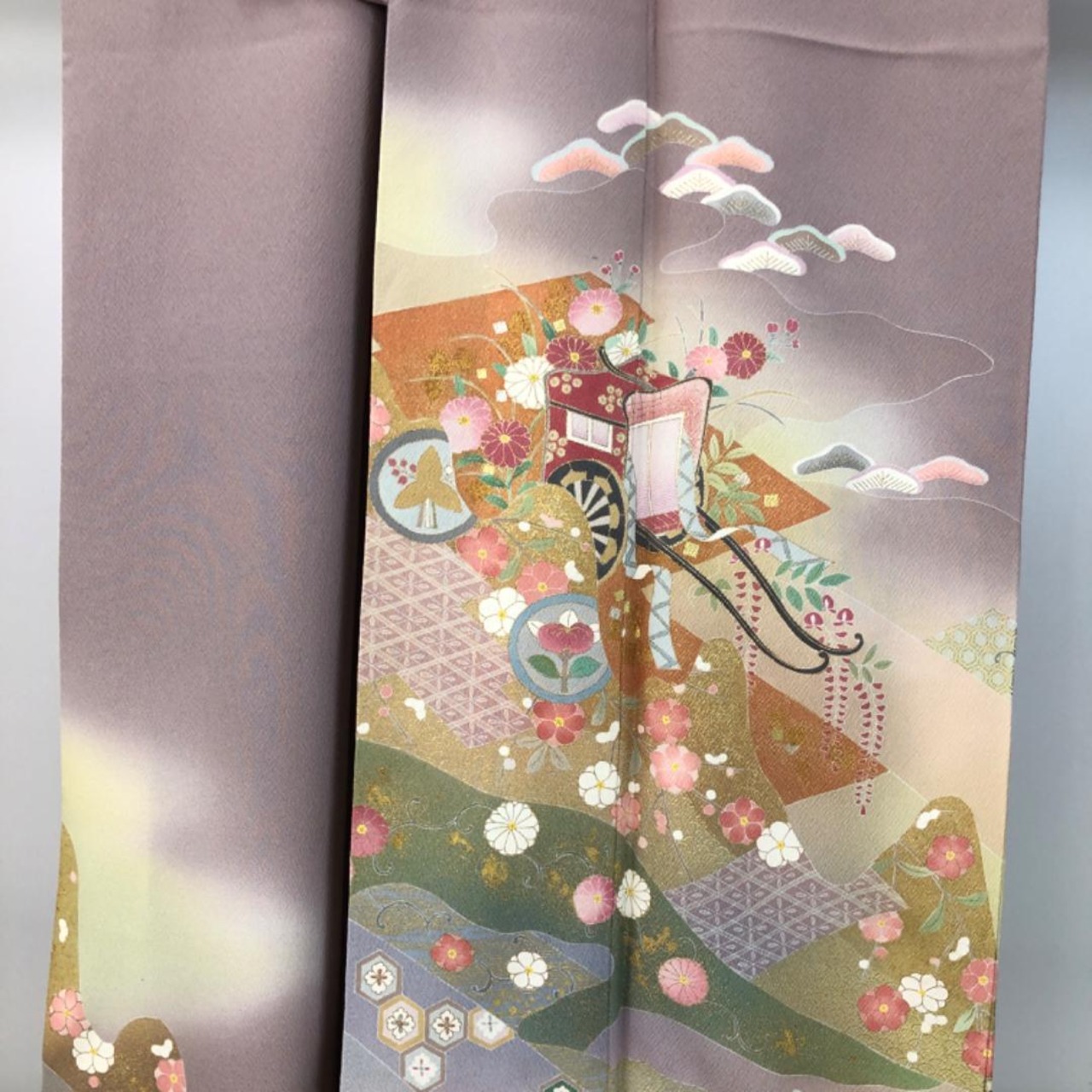 訪問着 二代目松井青々 京友禅 御所車に美しい花模様 桜鼠色 K-4938 着物 きもの kimono 和服 和装 中古 リサイクル着物 【送料無料】