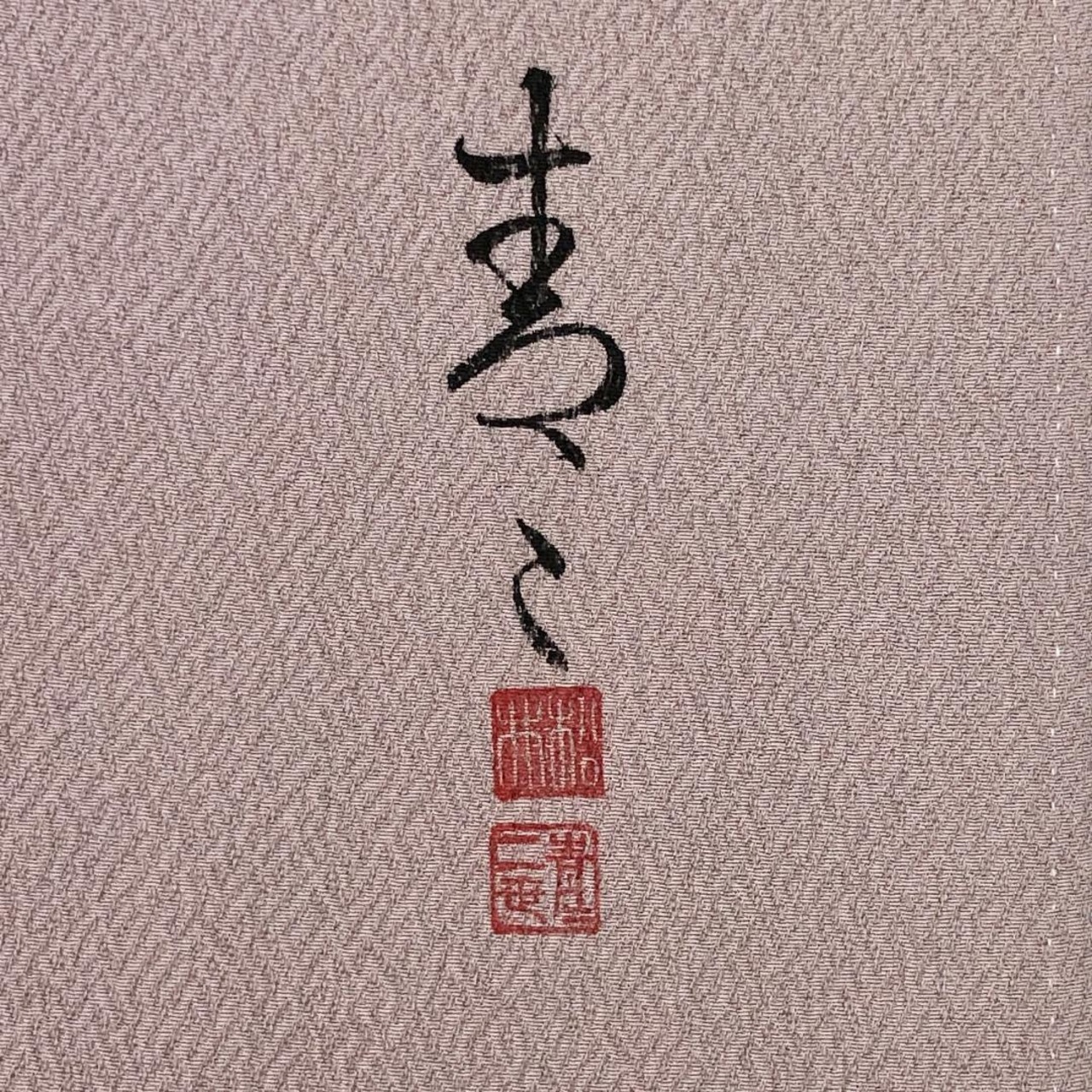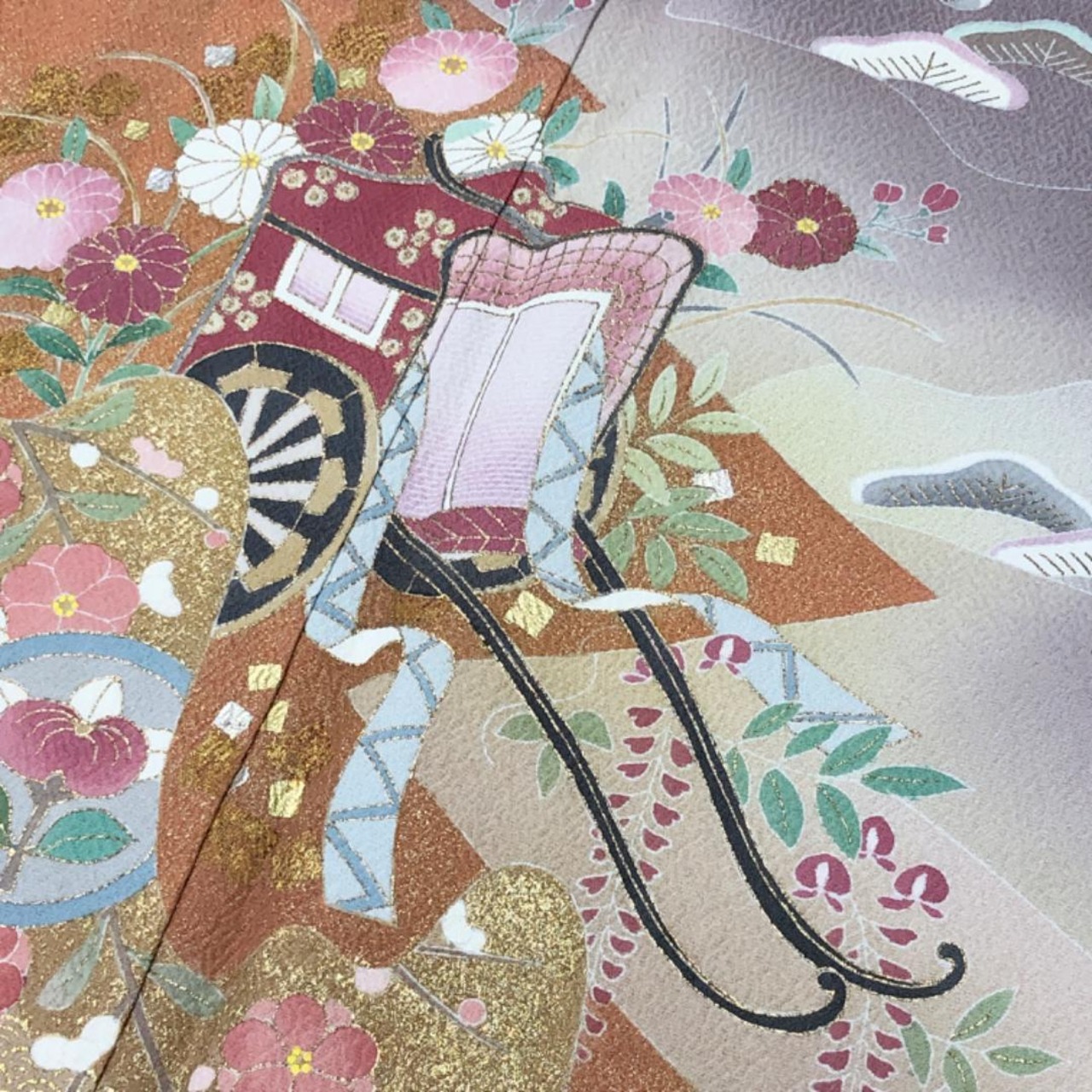 桜鼠色の品のあるお色味、御所車の美しい花模様の柄裄がデザインされた素敵なお品でございます。