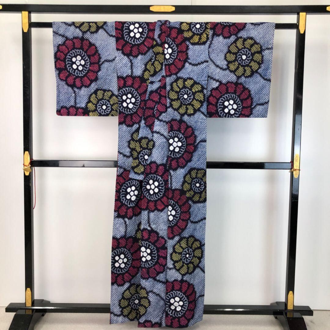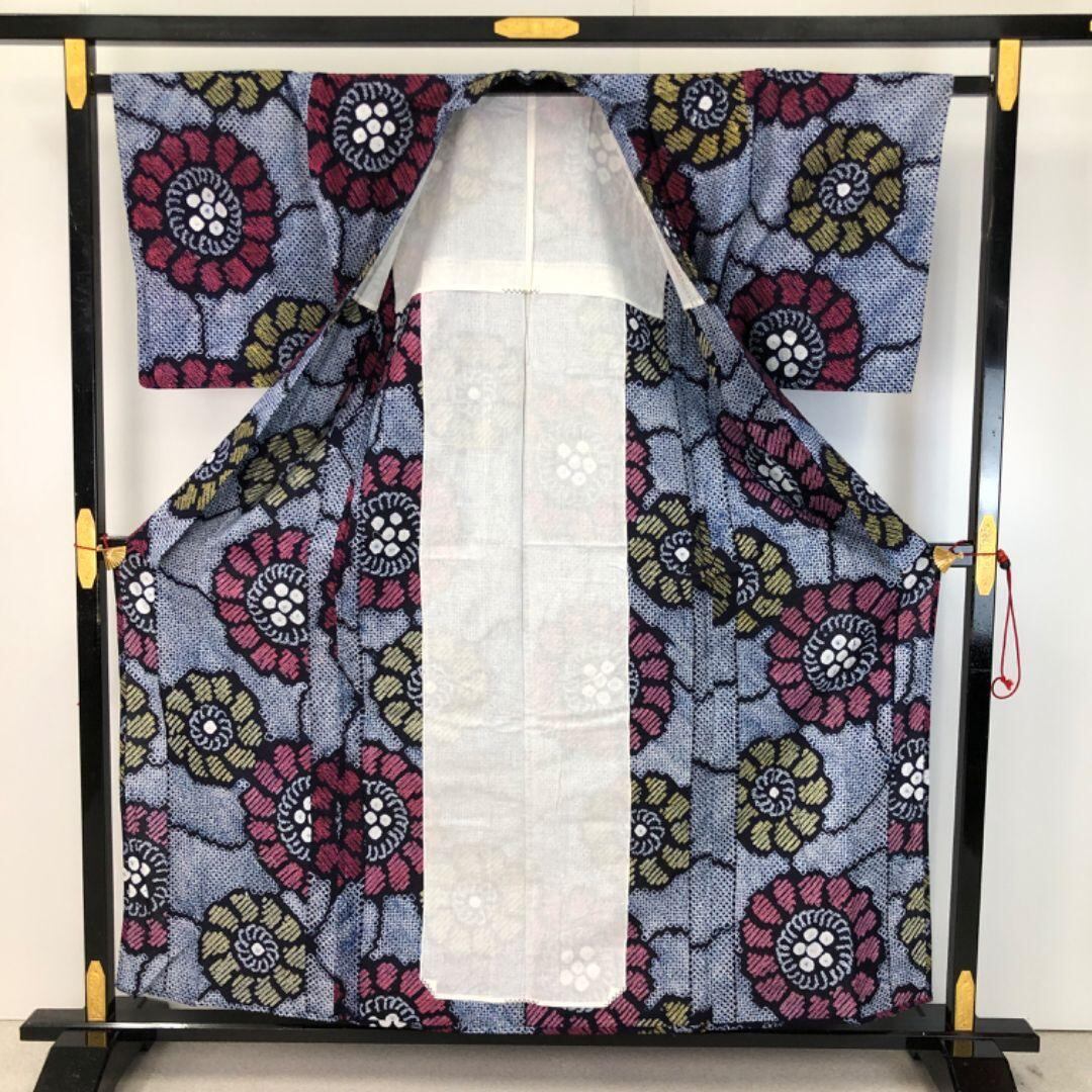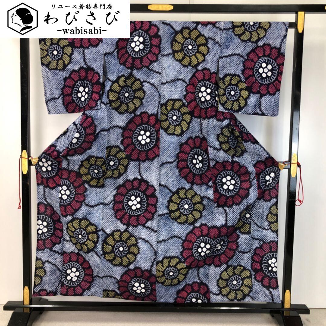 青褐色のお色味に花模様の柄裄がデザインされた素敵なお品でございます。