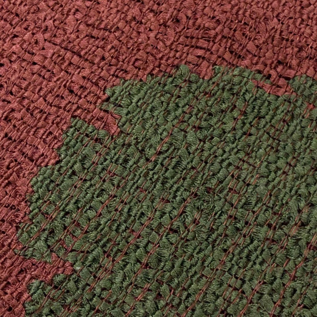 帯紅色の落ち着いたお色味、太鼓、前柄部分は写真のように透け感のある変わった織りの雪輪がデザインされた雰囲気の良い素敵なお品でございます。
