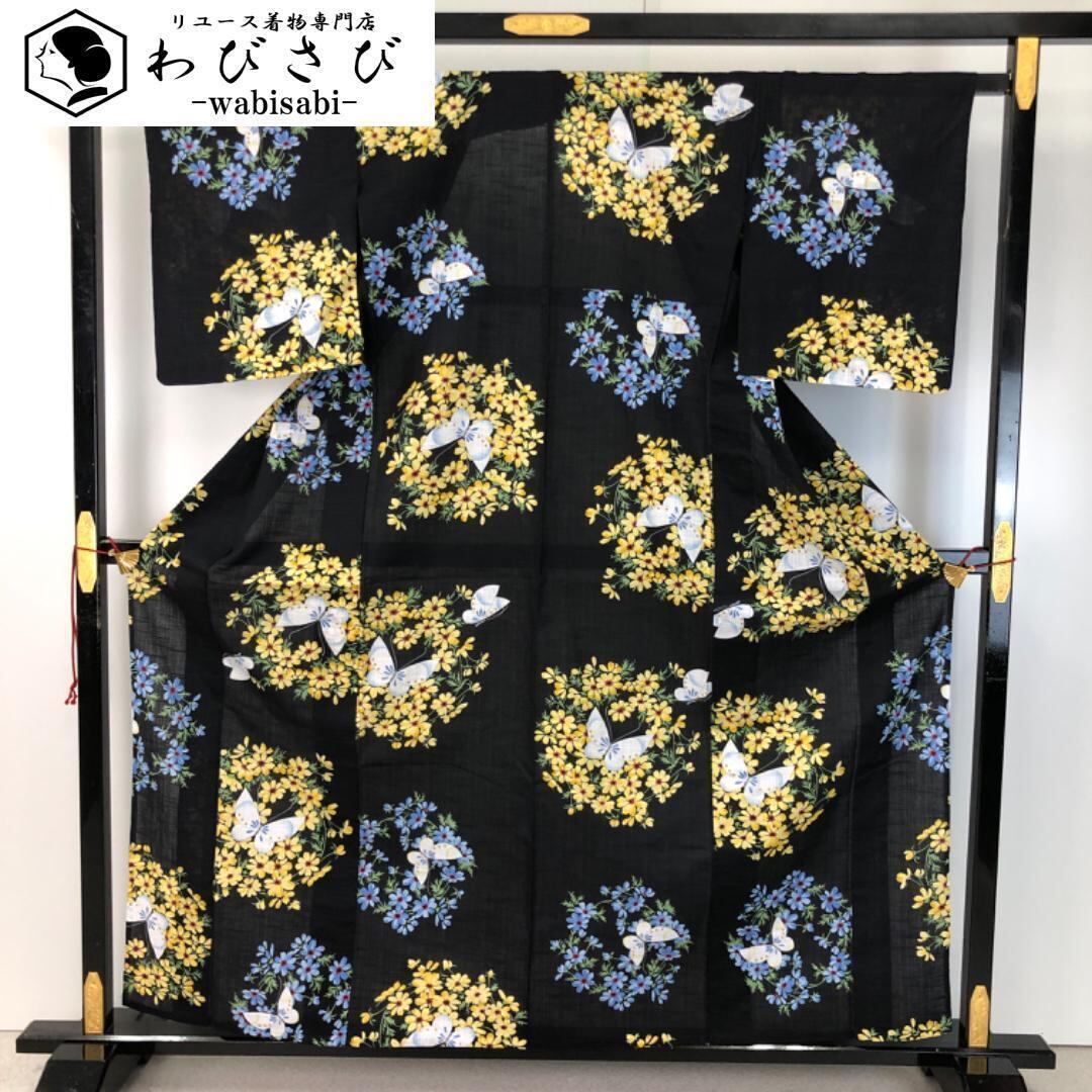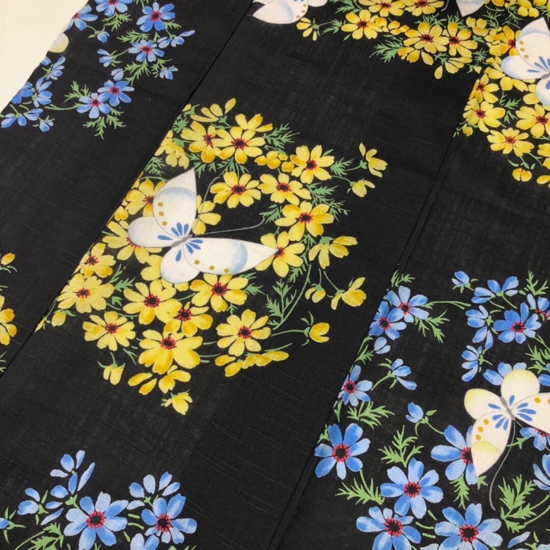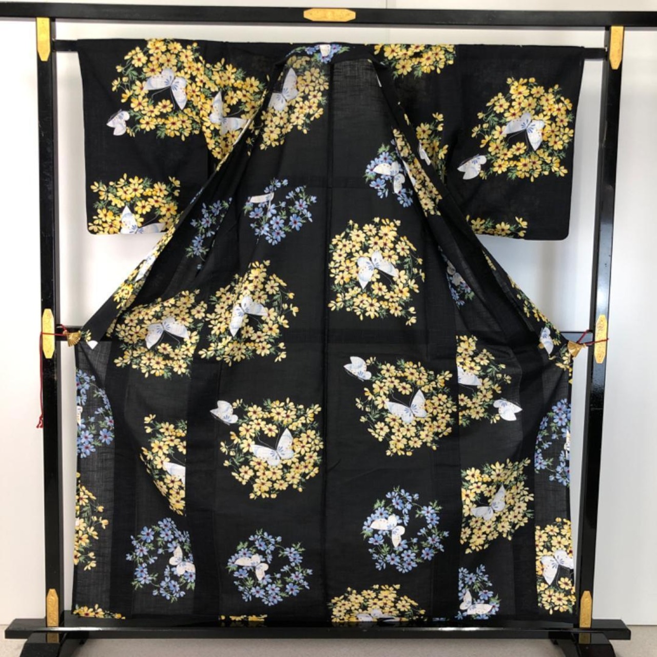 黒色のお色味に蝶々に花模様の柄裄がデザインされた素敵なお品でございます。