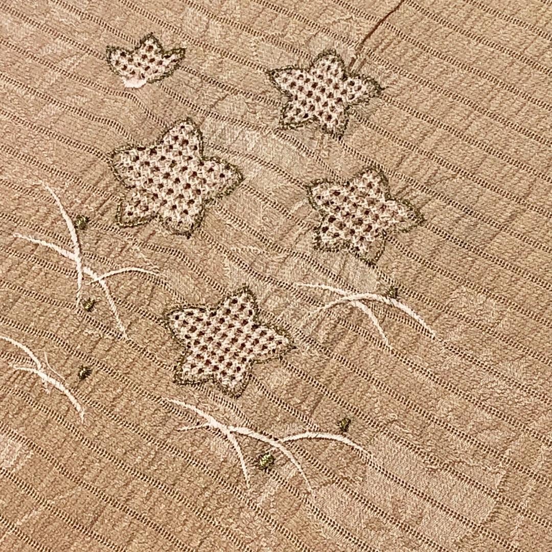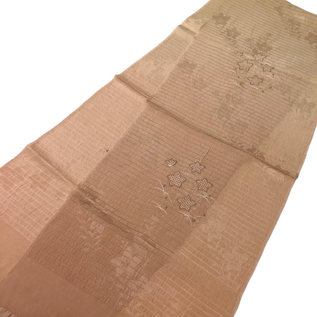 薄大和柿色のお色味に刺繍で桔梗に露芝の柄裄がデザインされた素敵なお品でございます。