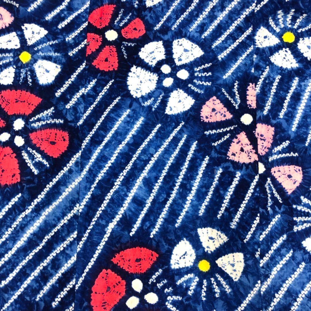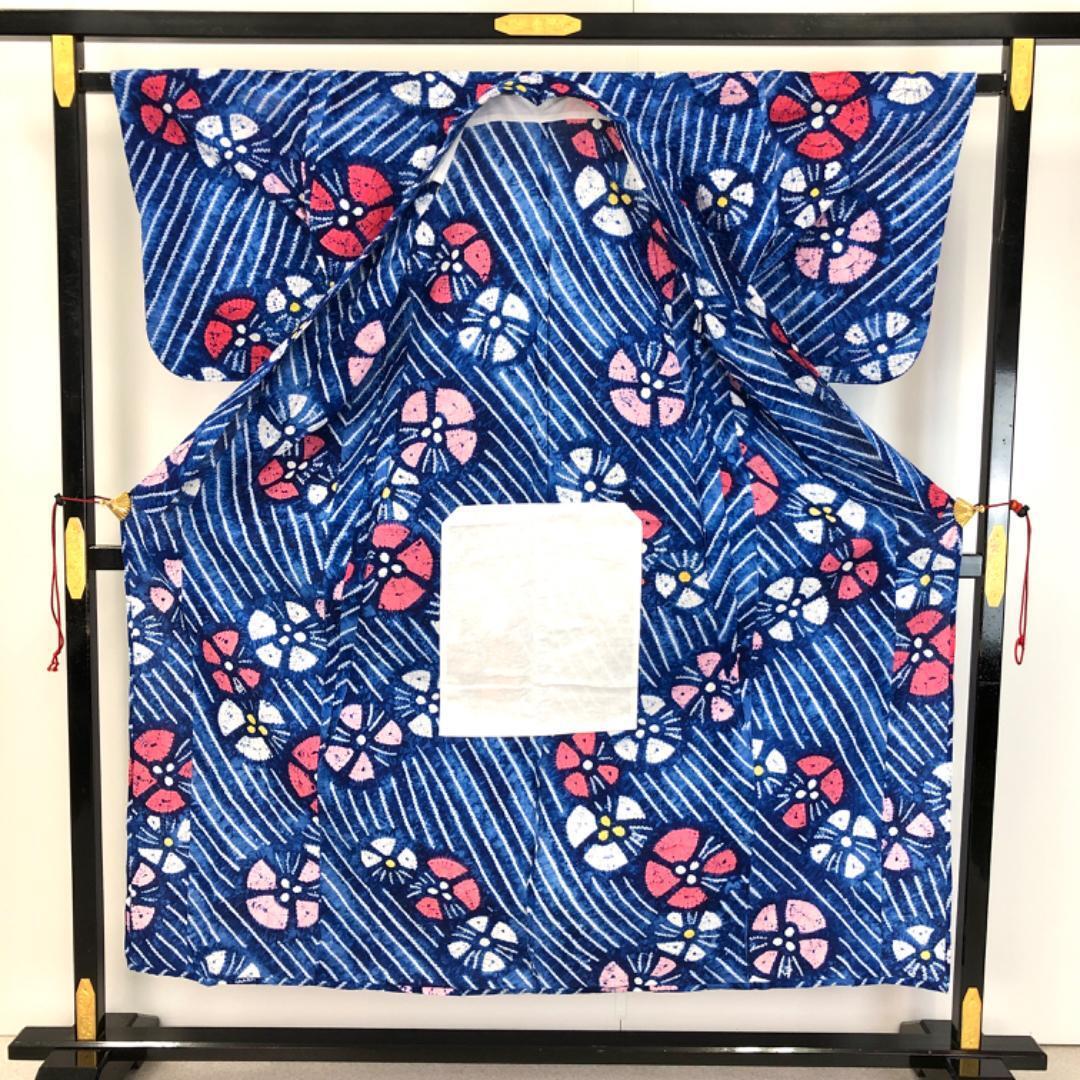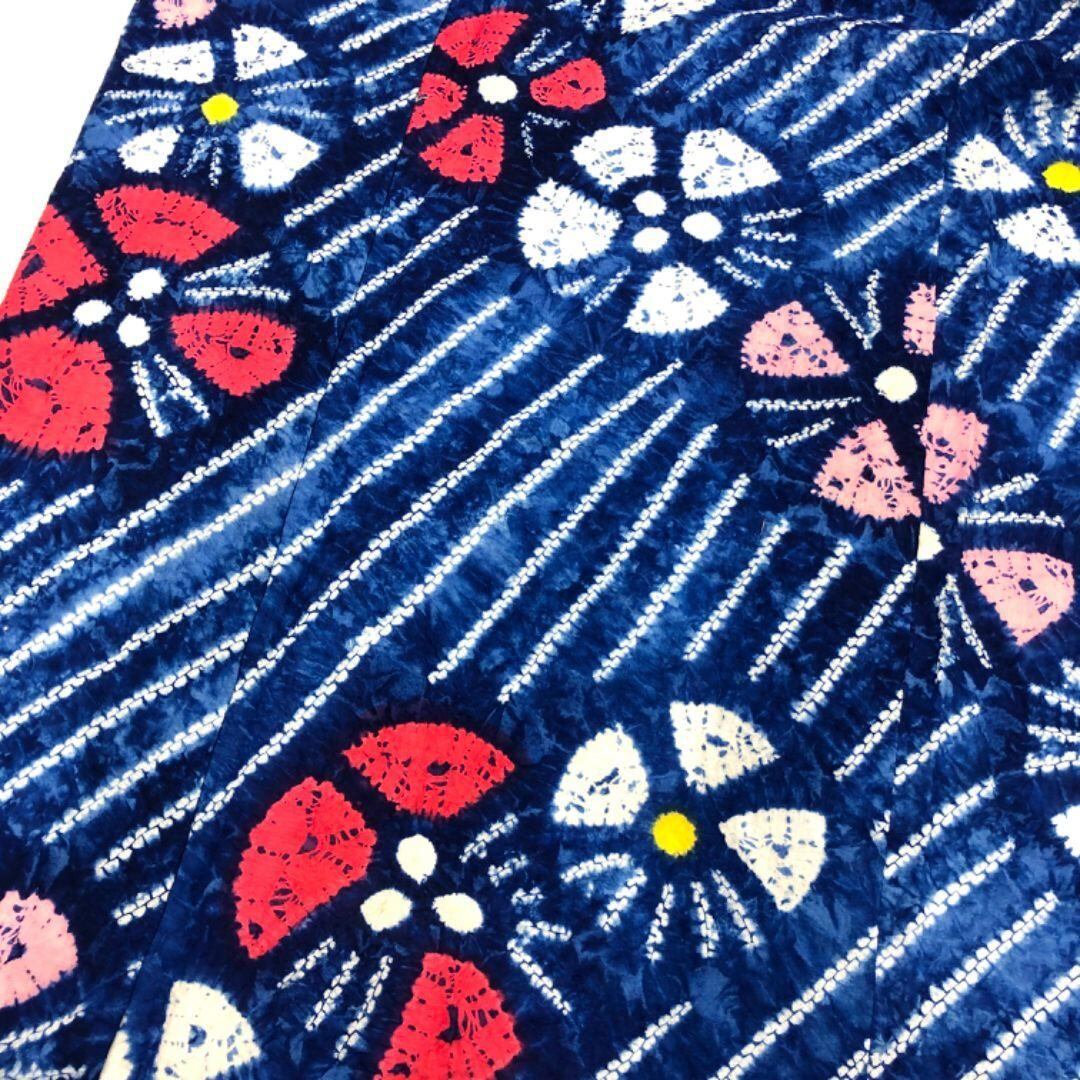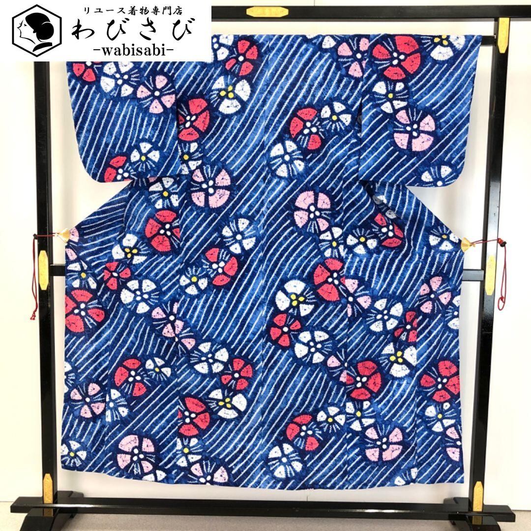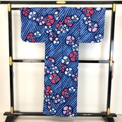 碧瑠璃色のお色味に斜め曲線模様に花柄がデザインされた素敵な柄裄のお品でございます。