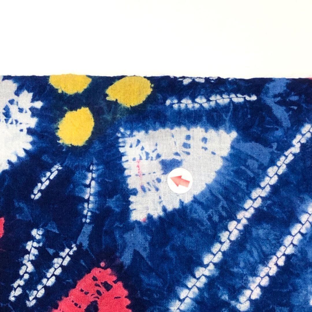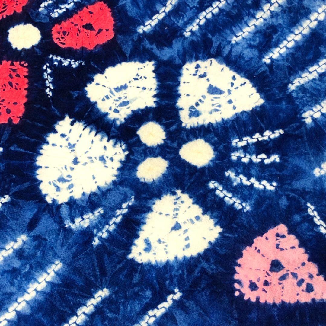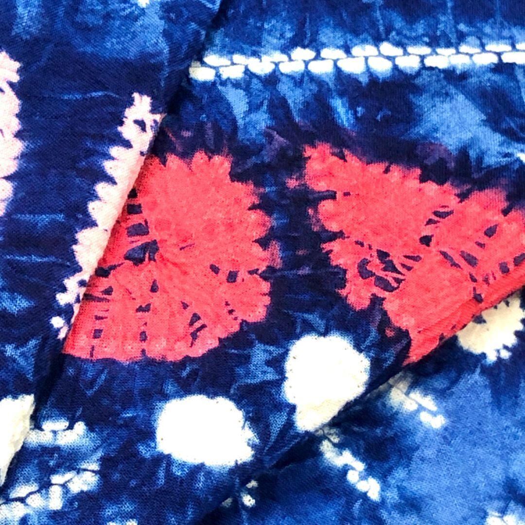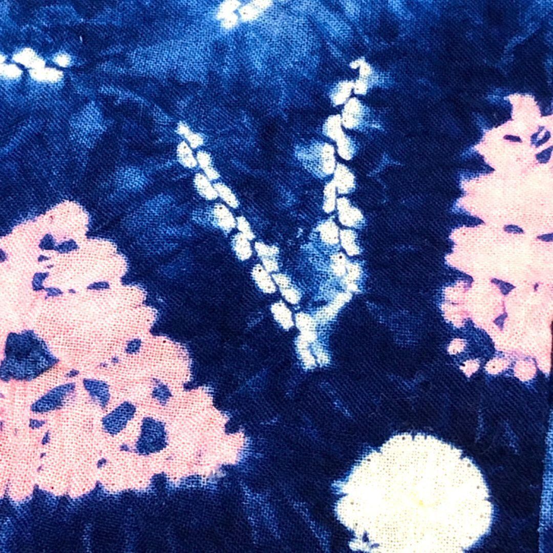 碧瑠璃色のお色味に斜め曲線模様に花柄がデザインされた素敵な柄裄のお品でございます。