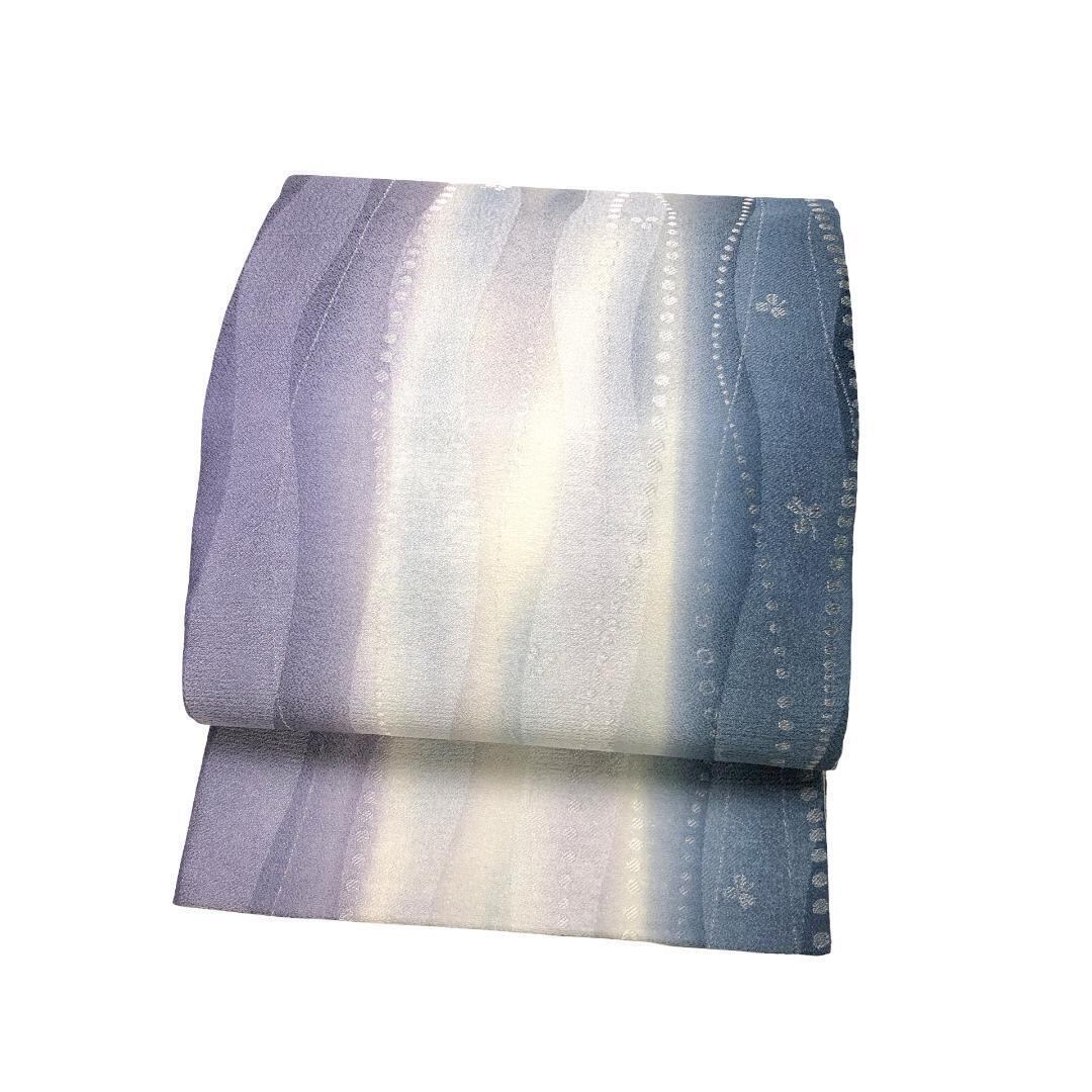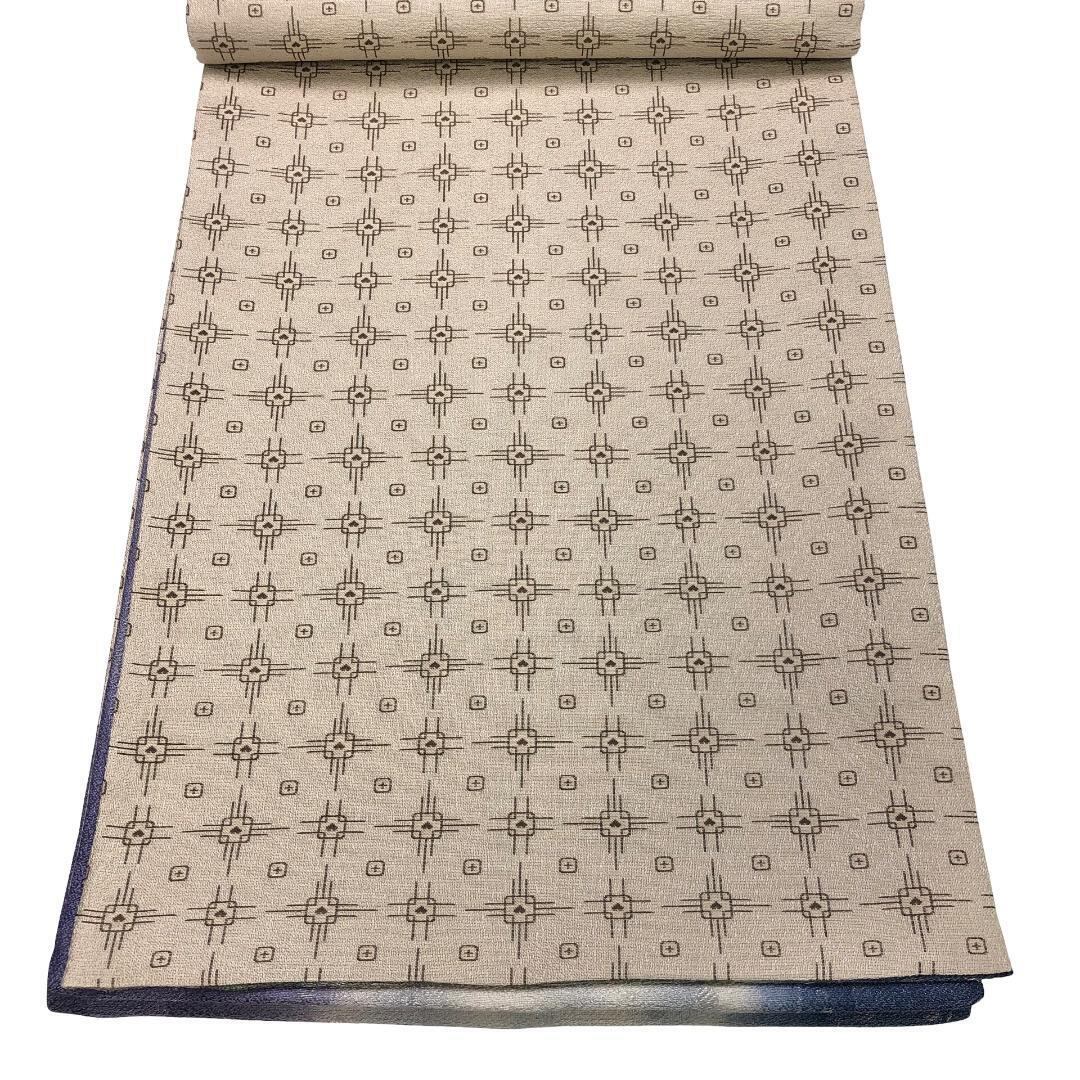 青黛色ベースの美しい縦柄グラデーションに水玉、縞模様、反対は信楽茶色の落ち着いたお色味に雰囲気の良い柄行がデザインされた素敵なお品でございます。
