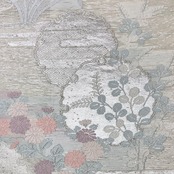 乳白色の上品なお色味、雪輪に花模様、エ霞の柄裄がデザインされた素敵なお品でございます。